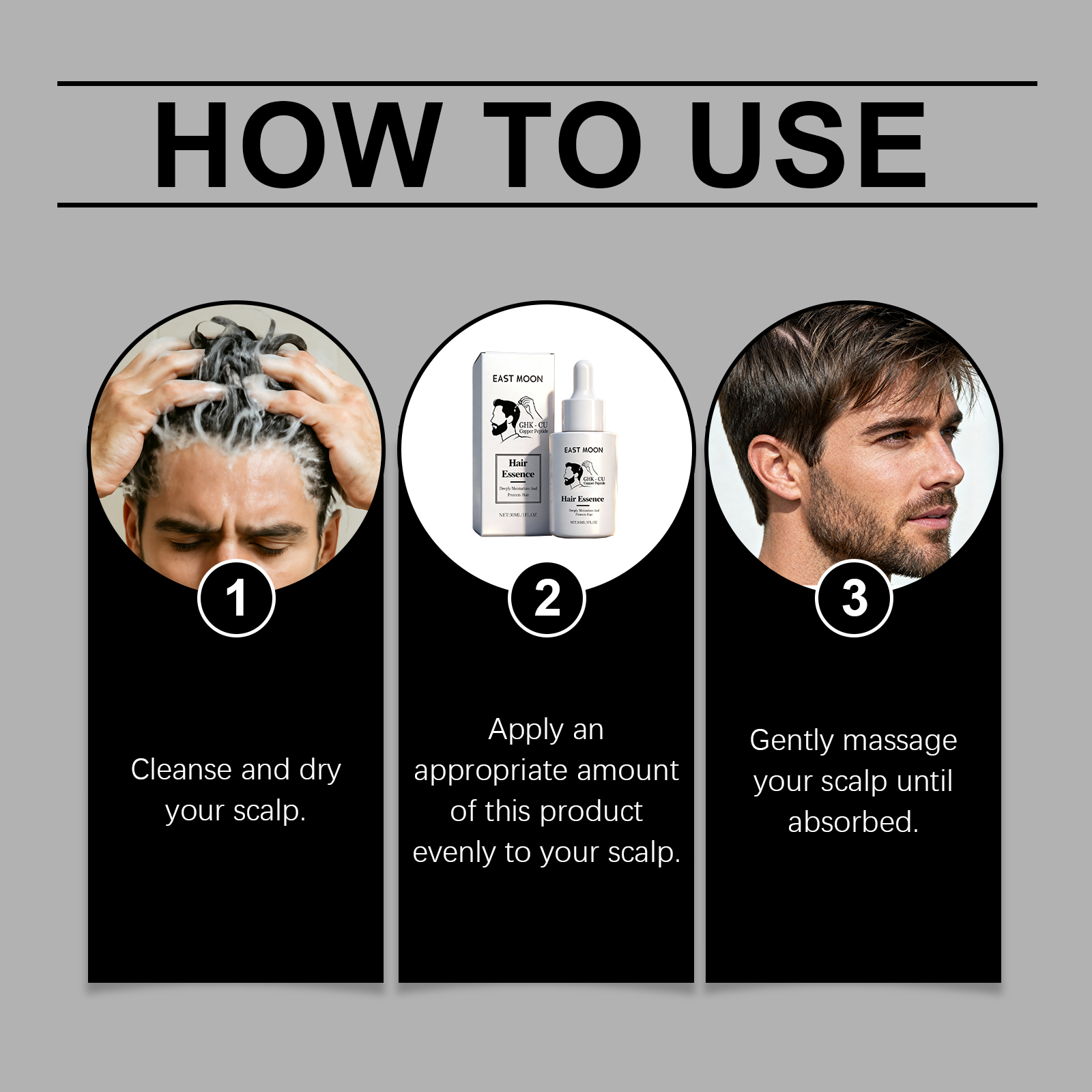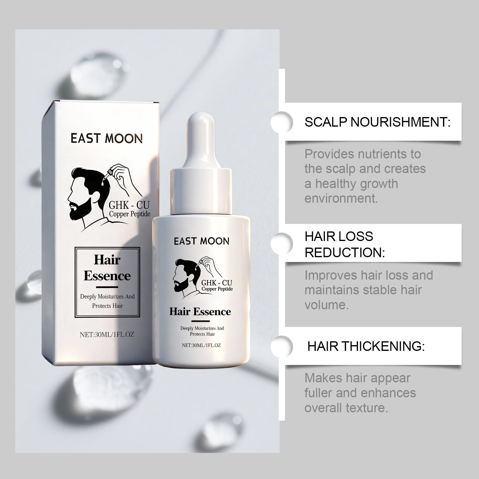 我们的毛发护理精华液,由姜根油、迷迭香油精心调配而成。专为头皮提供营养并创造健康的生长环境设计。使用方法极为便捷:清洁并干燥你的头皮。将适量的本产品均匀涂抹在头皮上。轻轻按摩头皮直至吸收。并且可以改善脱发并保持稳定的头发量。