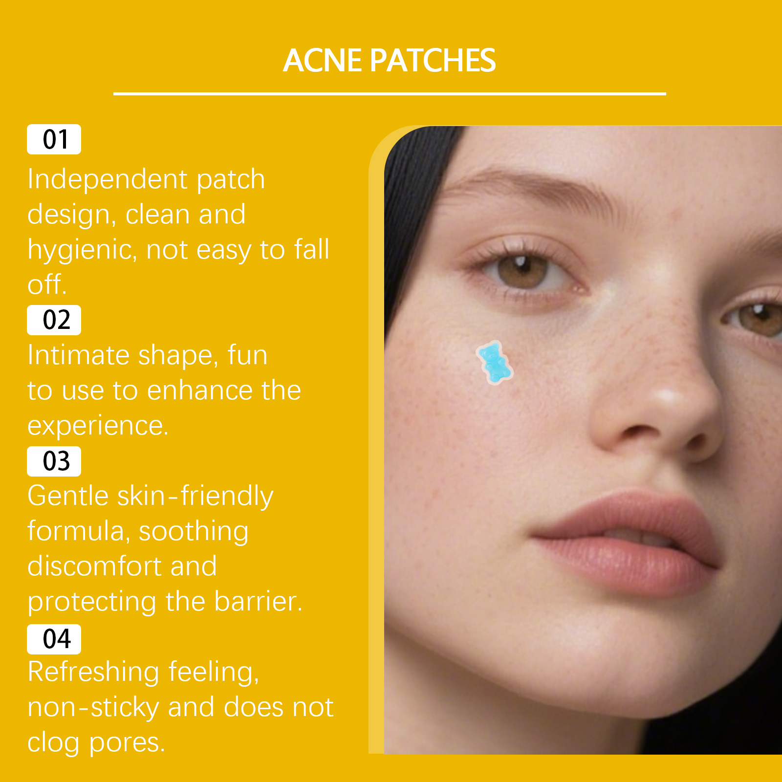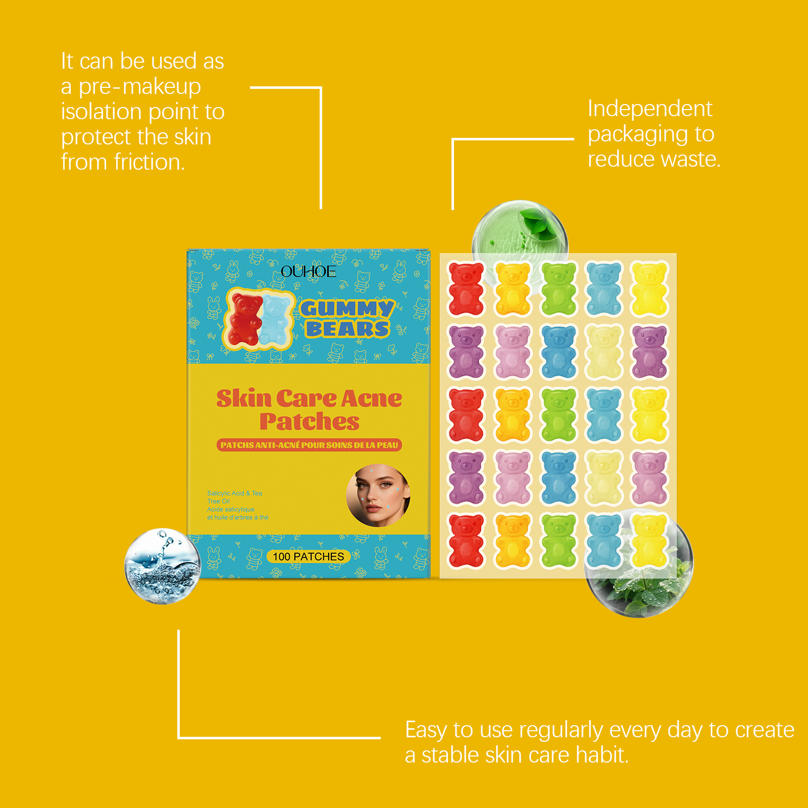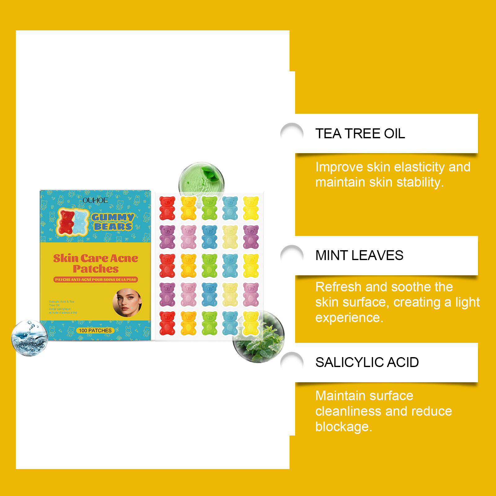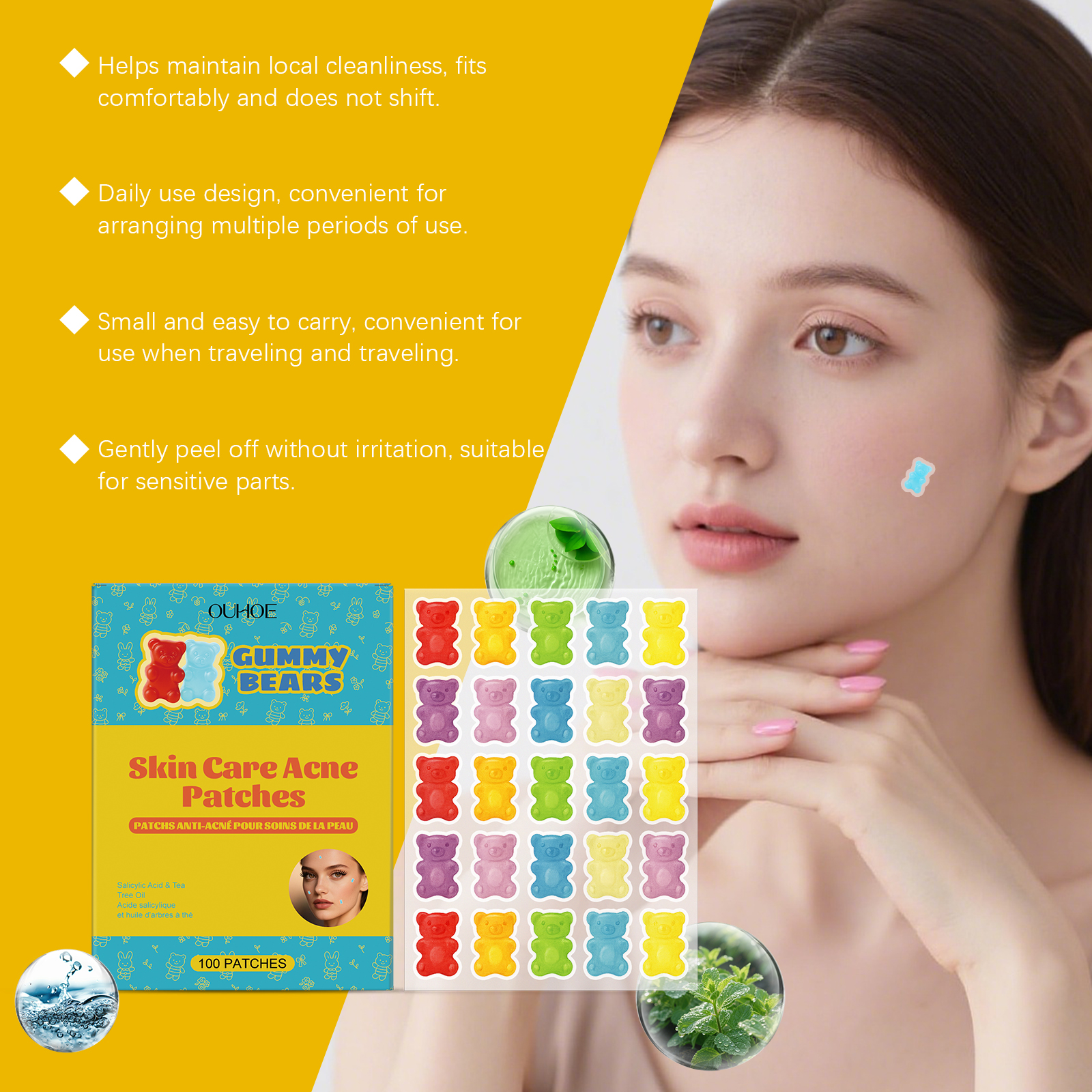 我们的痘痘贴,由茶树油、薄荷叶精心调配而成。专为消除痘痘,减少痤疮疤痕,淡化粉刺闭口,舒缓镇静肌肤设计。使用方法极为便捷:清洁肌肤并保持干燥,将本品贴在有痘痘的肌肤部位上,轻轻按压确保其粘合,静置6-8小时后撕下即可。并且它可以收缩毛孔,渗透毛孔帮助清洁皮肤,分解痤疮,令肌肤更洁净。