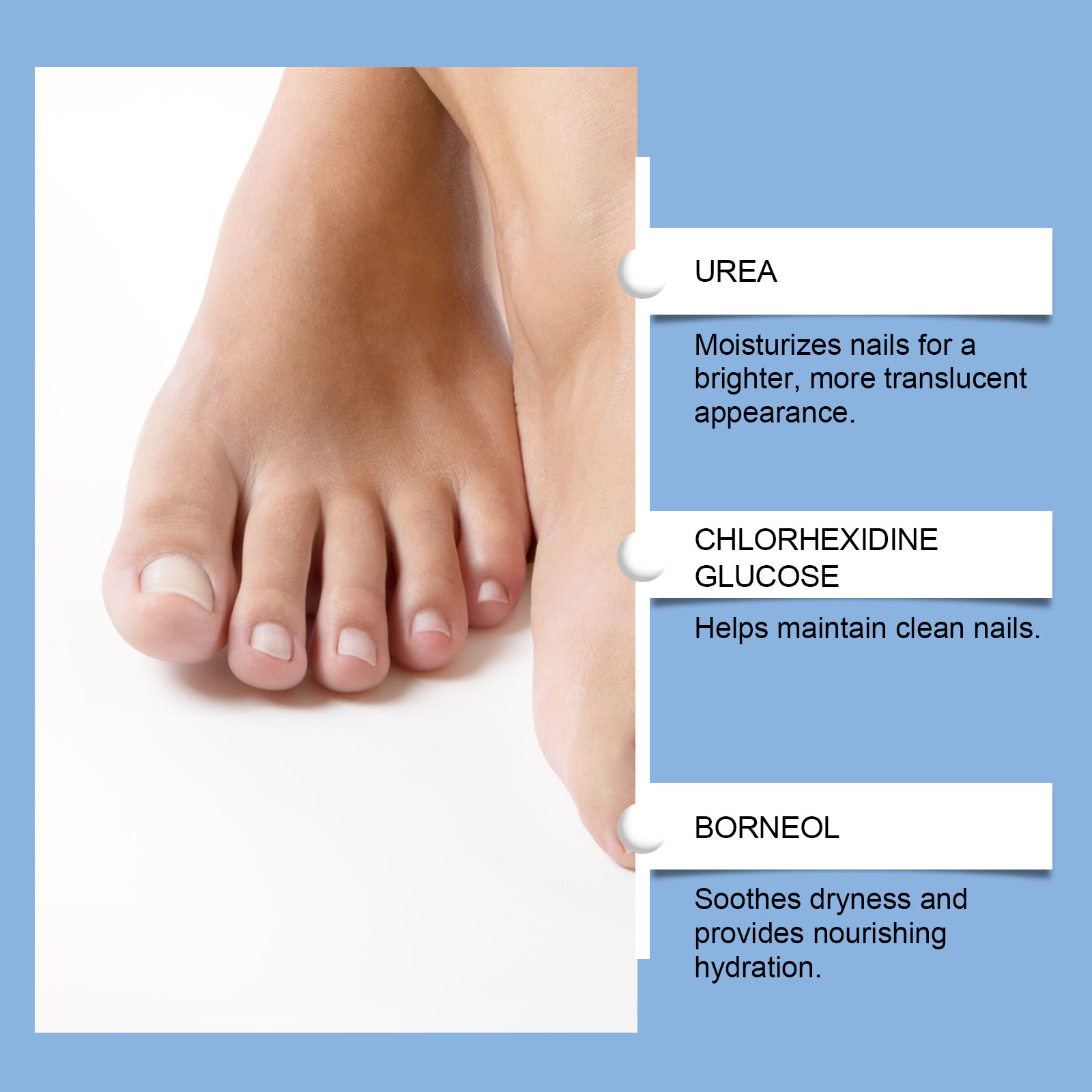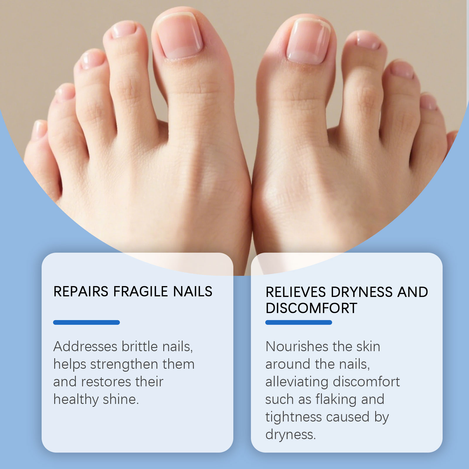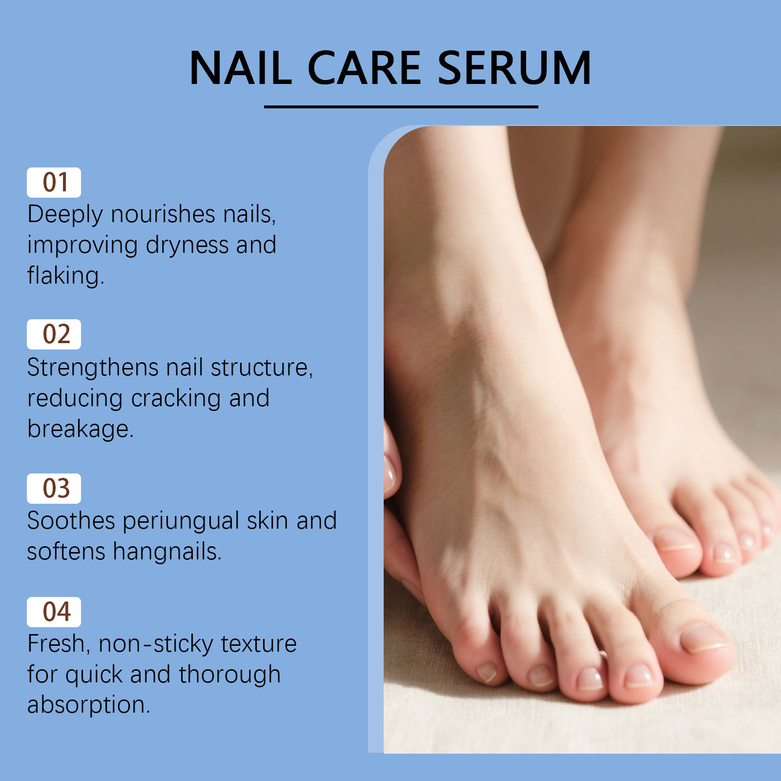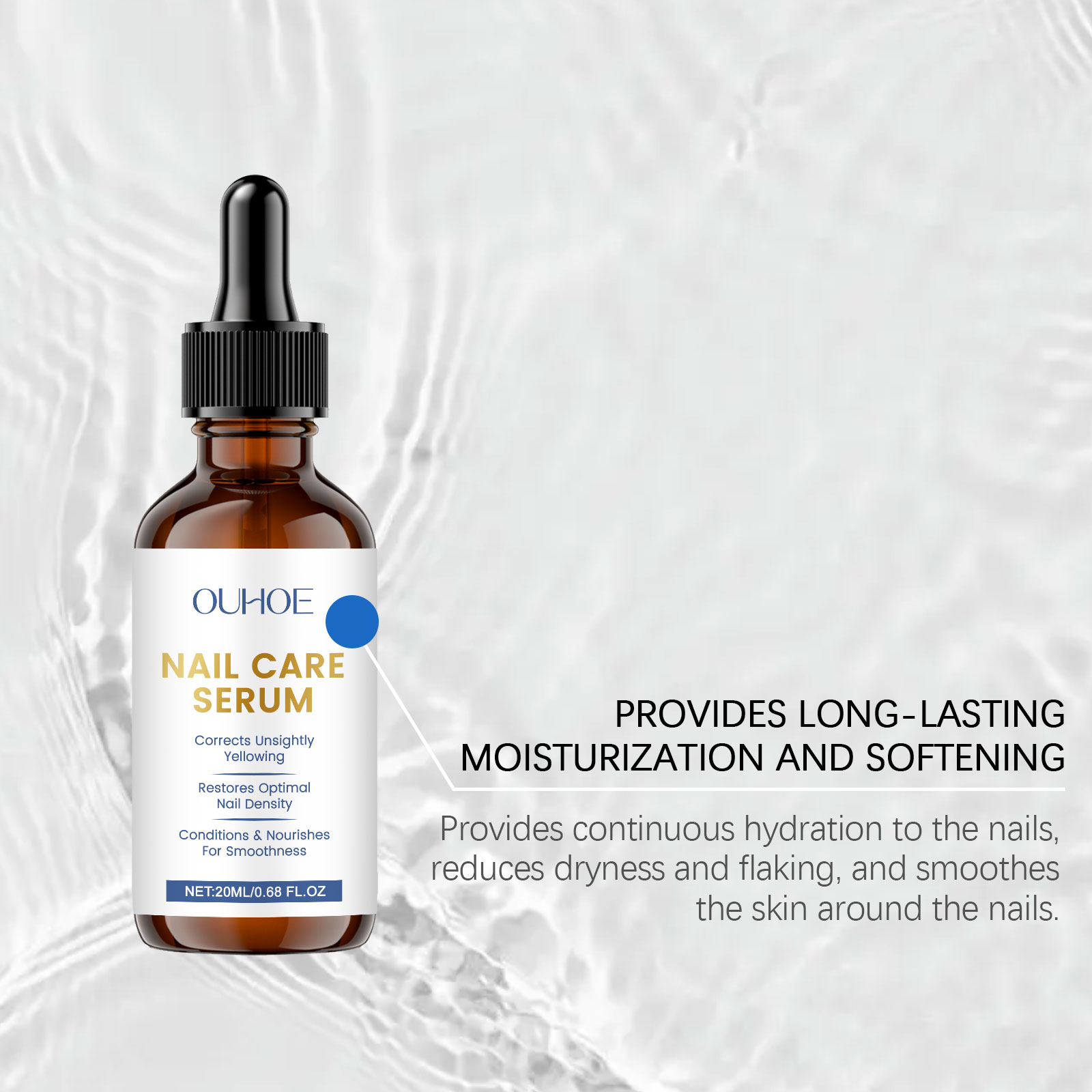 我们的甲部护理精华液,由尿素、1,2-己二醇精心调配而成。专为恢复水分和蛋白质结构,以强化脆弱、脱皮或开裂的指甲设计。使用方法极为便捷:1.清洁指甲表面并保持干燥。2.取适量本品均匀涂抹在指甲表面和指甲周围的肌肤上。3.轻轻按摩促进吸收即可。并且它可以舒缓干燥,防止裂缝、倒刺和刺激,温和养护不刺激甲周皮肤,改善指甲干燥起皮现象,长期使用养成健康甲质状态。