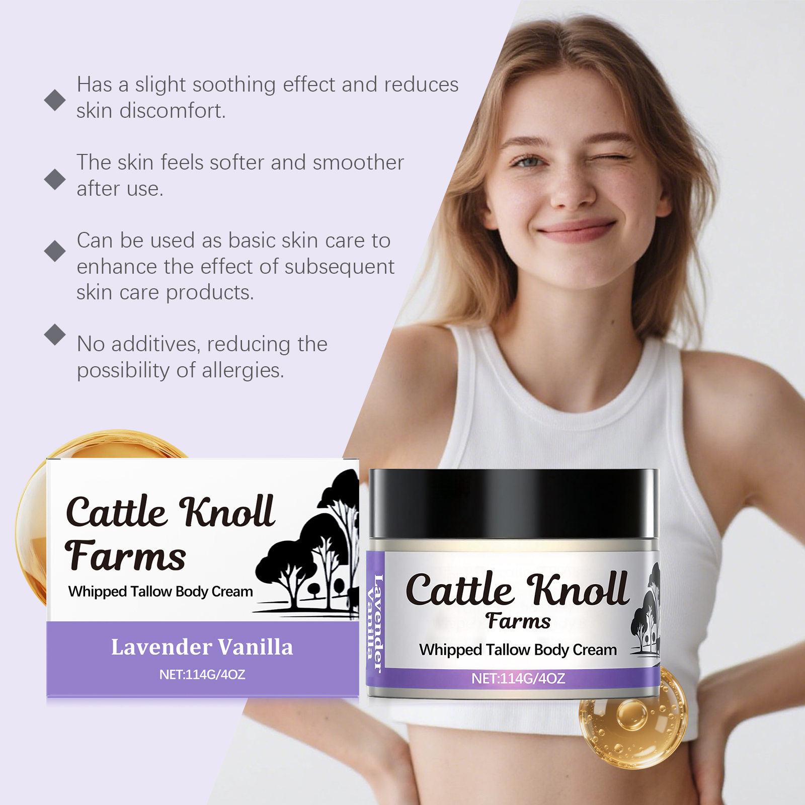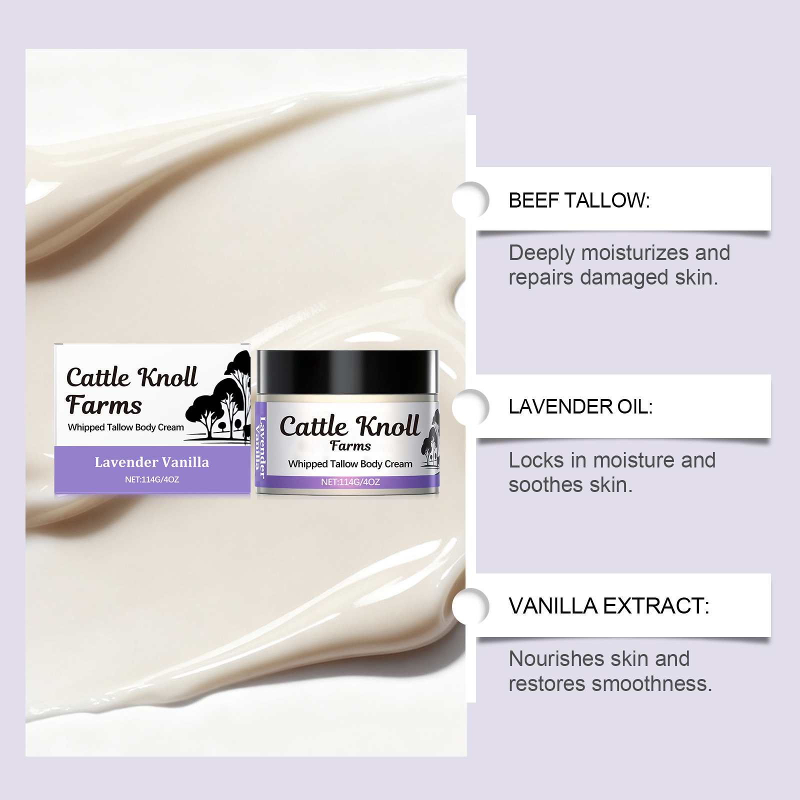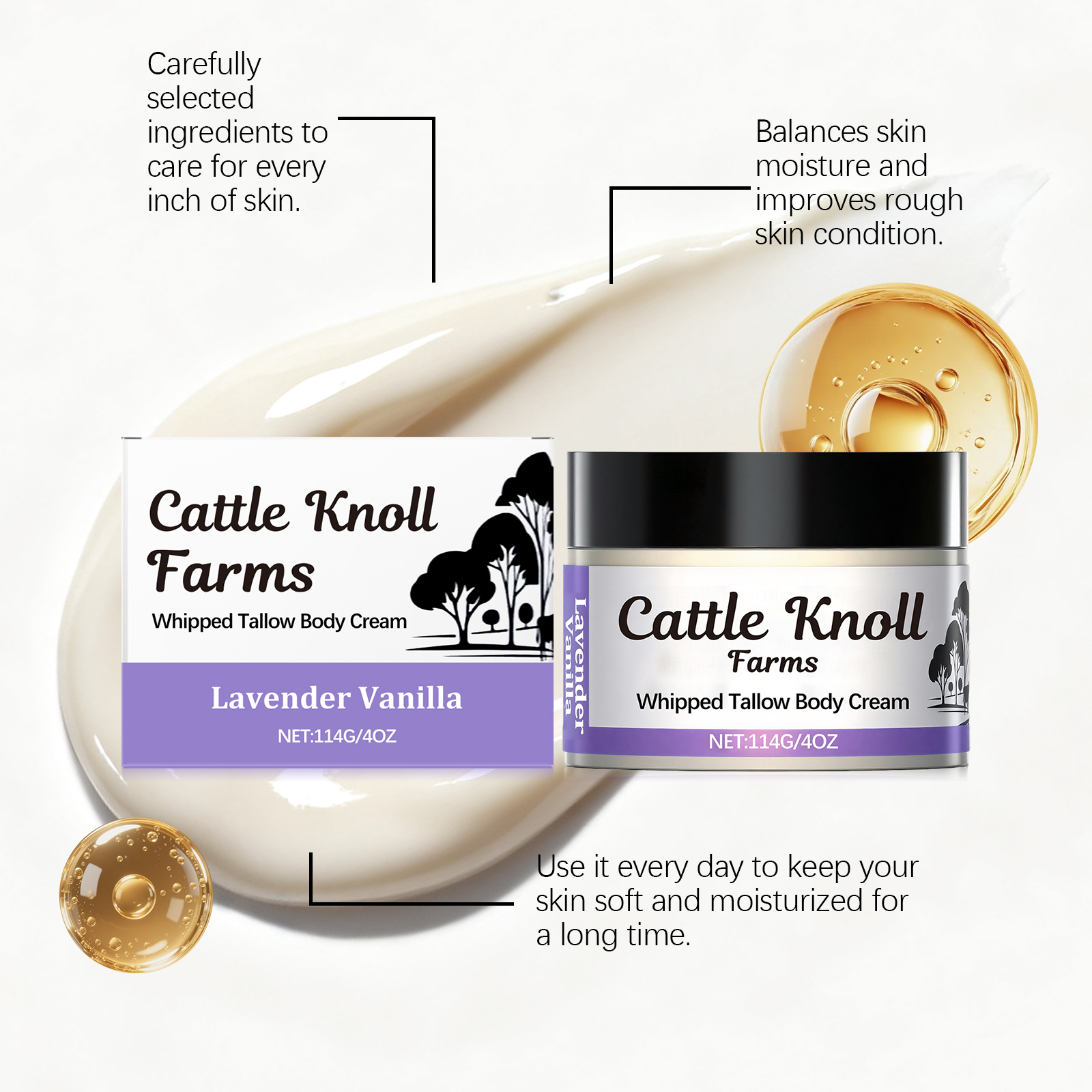 我们的牛脂润肤霜,由甘油、矿油、甘油硬脂酸酯精心调配而成。专为提供舒缓作用,帮助缓解您的肌肤不适感设计。使用方法极为便捷:1.清洁肌肤并保持干燥。2.取适量本品均匀涂抹在面部和身体肌肤。3.轻柔按摩直至吸收。并且它可以深层滋润肌肤,帮助保持长时间的水分锁住,恢复您的肌肤柔软光滑,有助于强化肌肤屏障功能,修复受损皮肤,改善干燥、粗糙的状况,帮助您得到肌肤恢复健康状态。