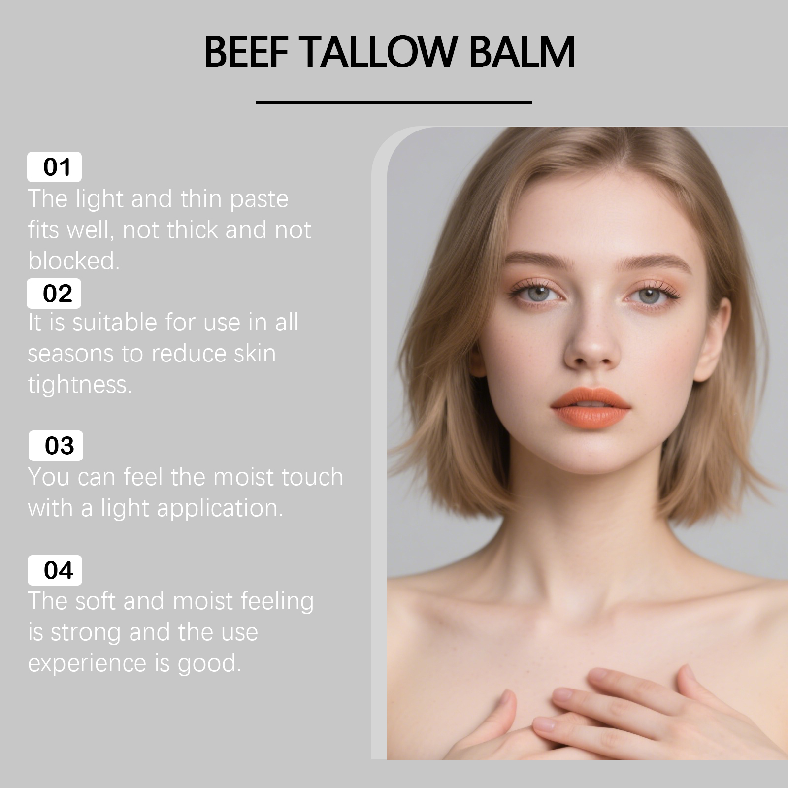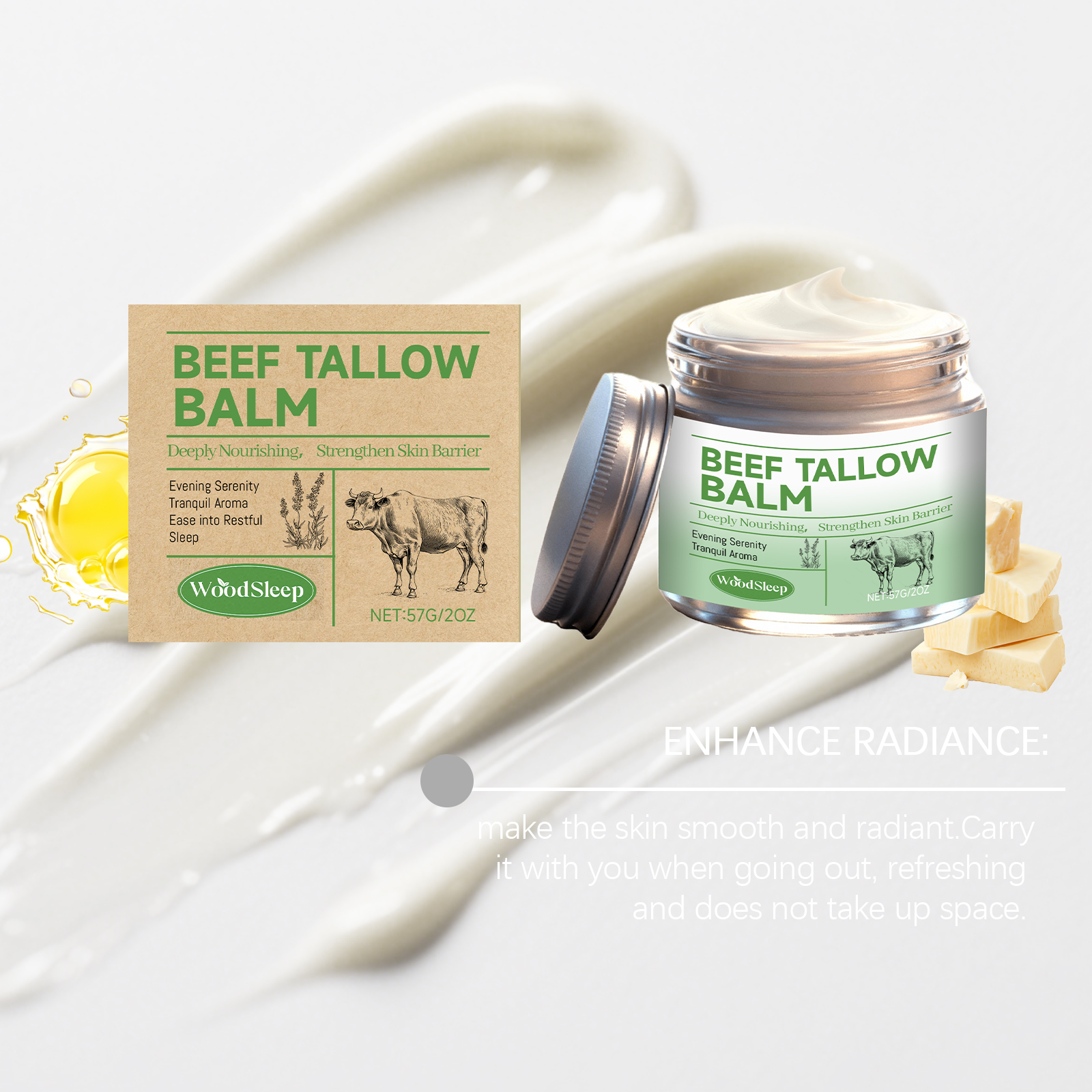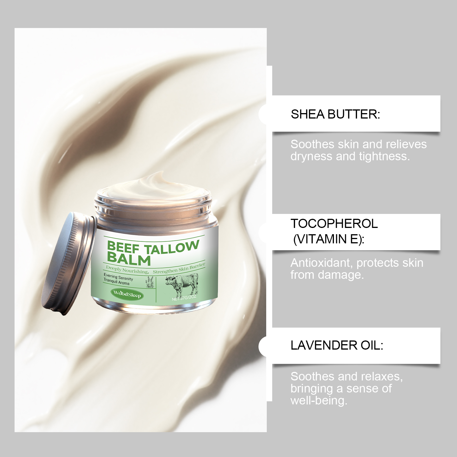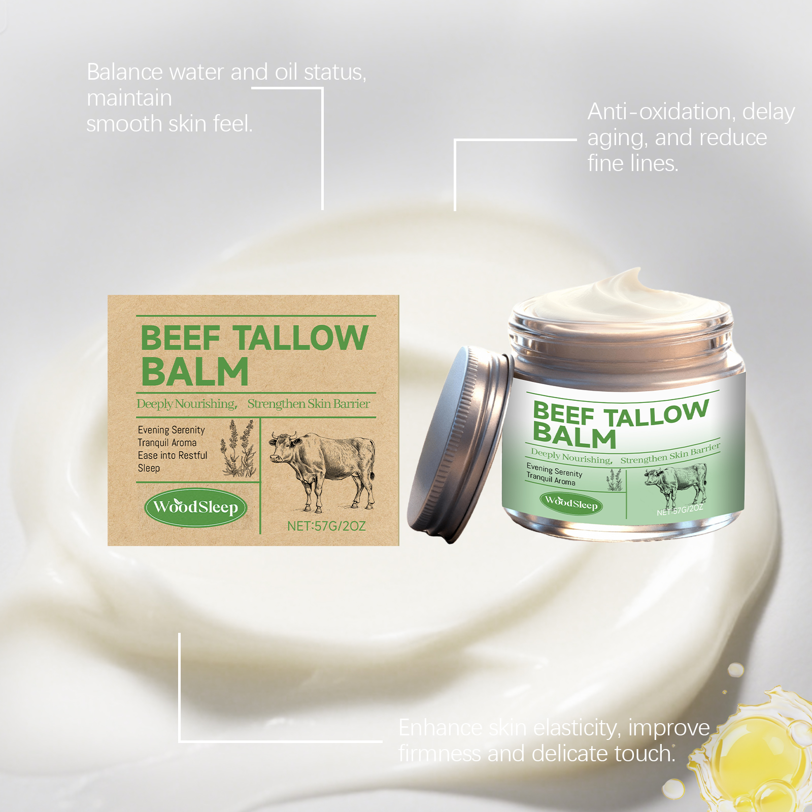 我们的牛脂润肤霜,由甘油、矿油、甘油硬脂酸酯精心调配而成。专为深层滋养干燥粗糙肌肤,长效保湿,增强肌肤弹性,提升紧致细腻触感设计。使用方法极为便捷:1.清洁并干燥皮肤。2.取适量本品涂抹于皮肤。3.轻柔按摩吸收。并且它可以抗氧化延缓衰老,淡化细纹,平衡水油状态,维持柔滑肤感。