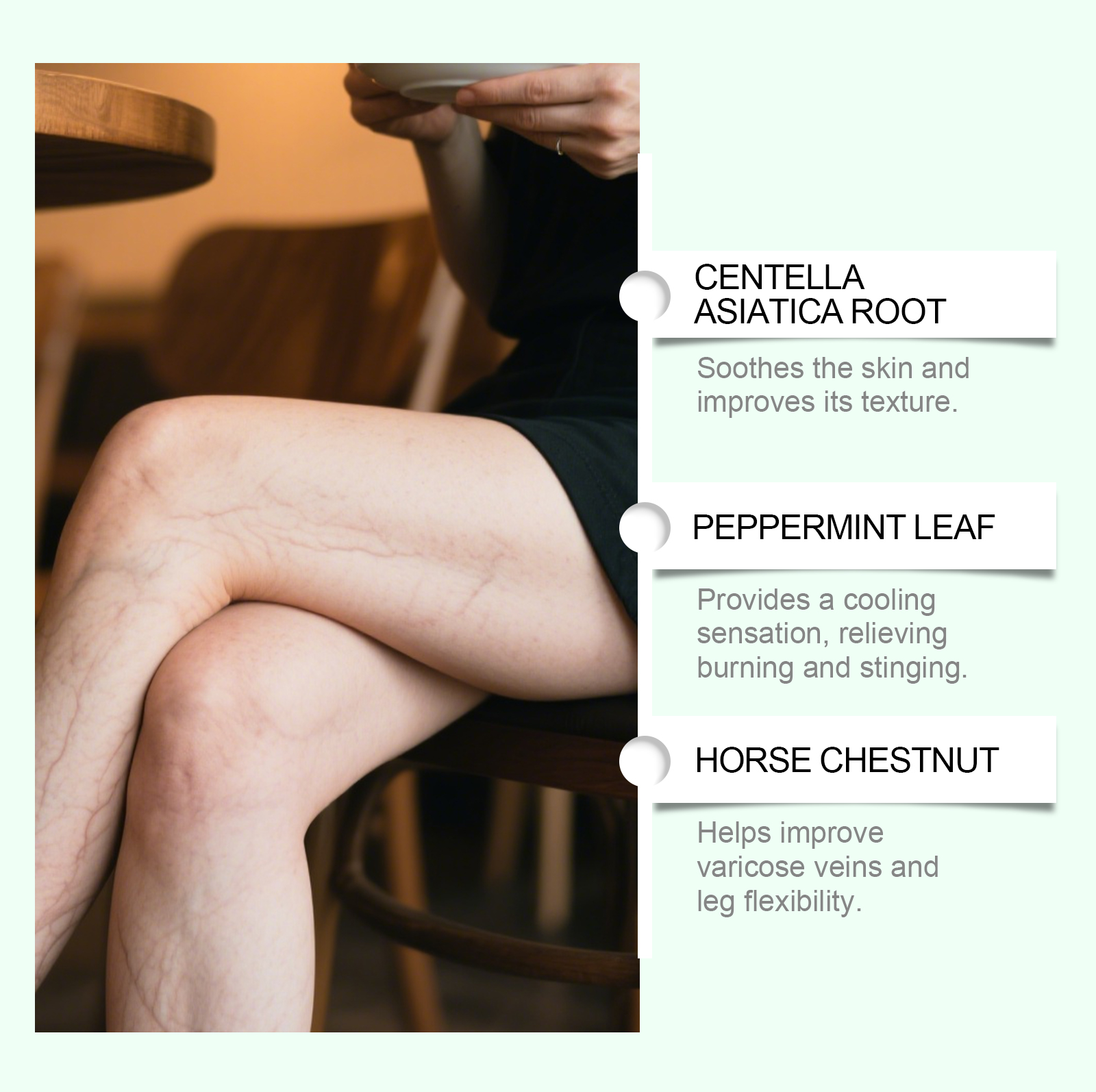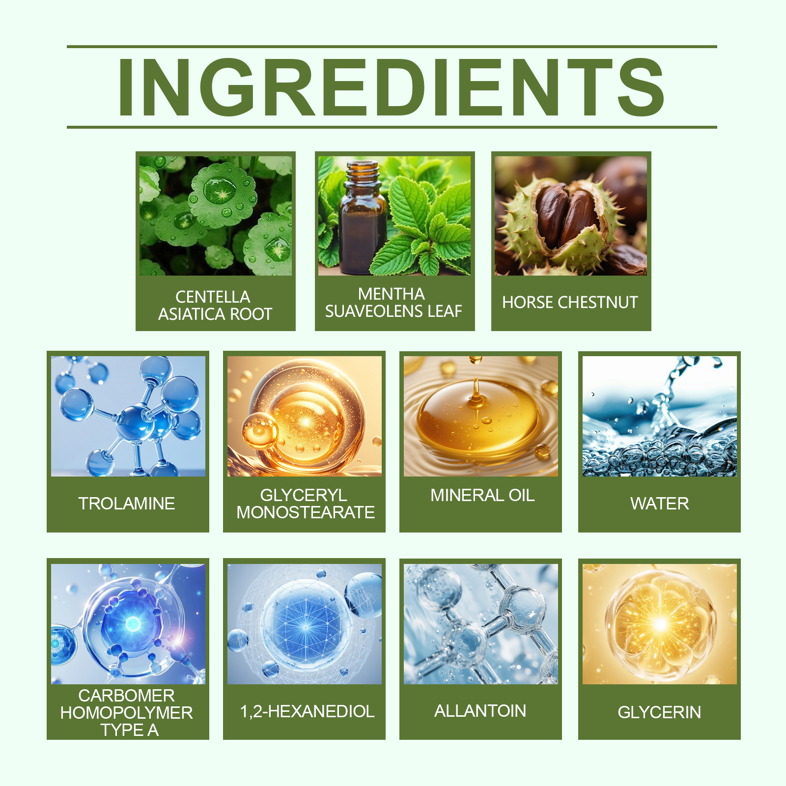 我们的腿部护理霜,由三乙醇胺、尿囊素精心调配而成。专为促进血液循环并改善血管健康设计。使用方法极为便捷:清洁并擦干皮肤,取适量涂抹于腿部肌肤,并轻轻按摩,以促进吸收。并且这款面霜质地轻盈,易于被皮肤吸收,不会感到油腻。