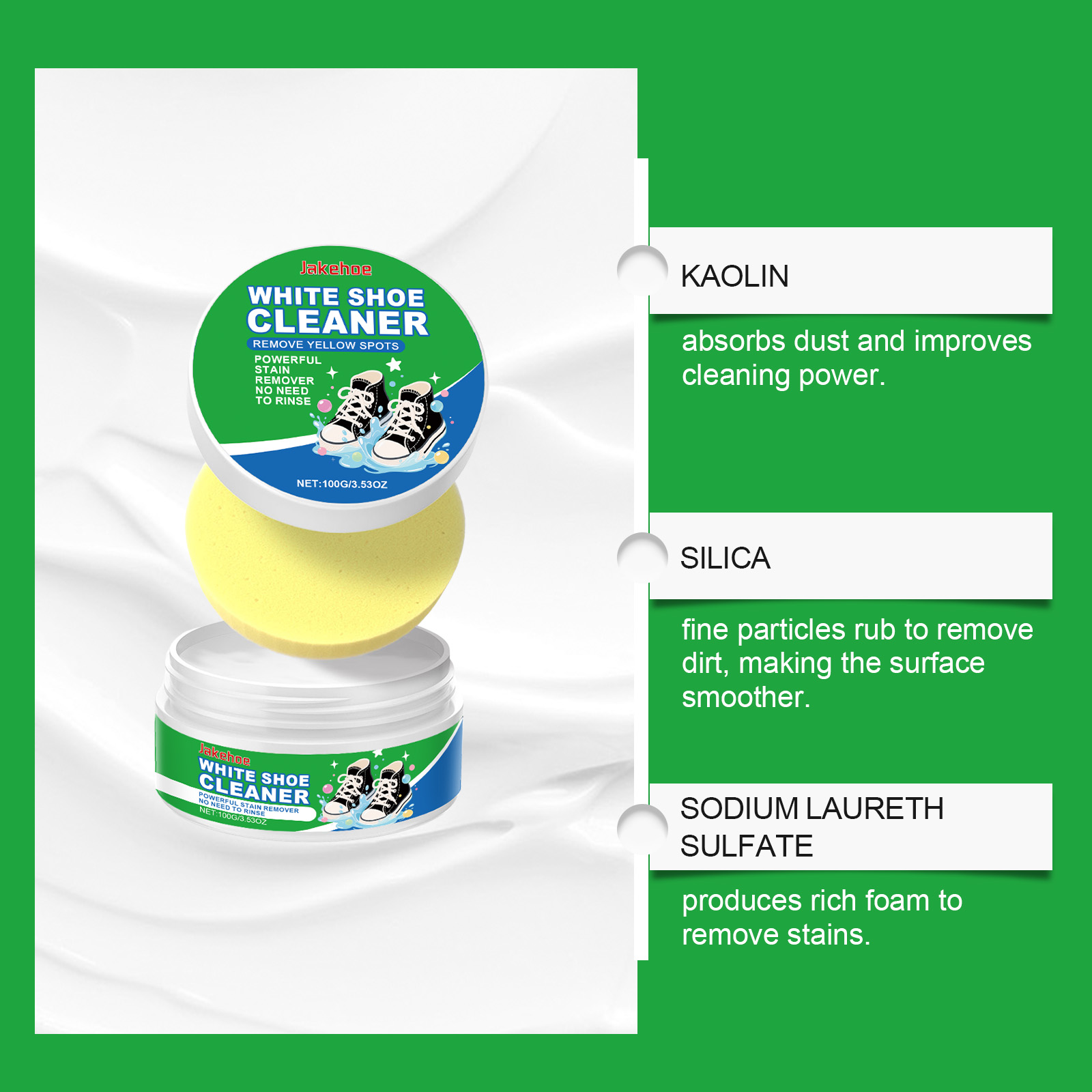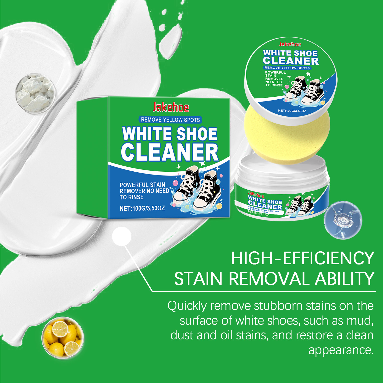我们的小白鞋清洁膏,由羟乙基纤维素、柠檬酸精心调配而成。专为能有效去除各种鞋子上的污垢设计。使用方法极为便捷:清除鞋表面的灰尘,用海绵蘸取适量本产品并均匀涂抹在鞋面上。反复擦拭,最后用毛巾擦掉残留物。并且采用温和配方,清洁后不会损坏鞋子表面。