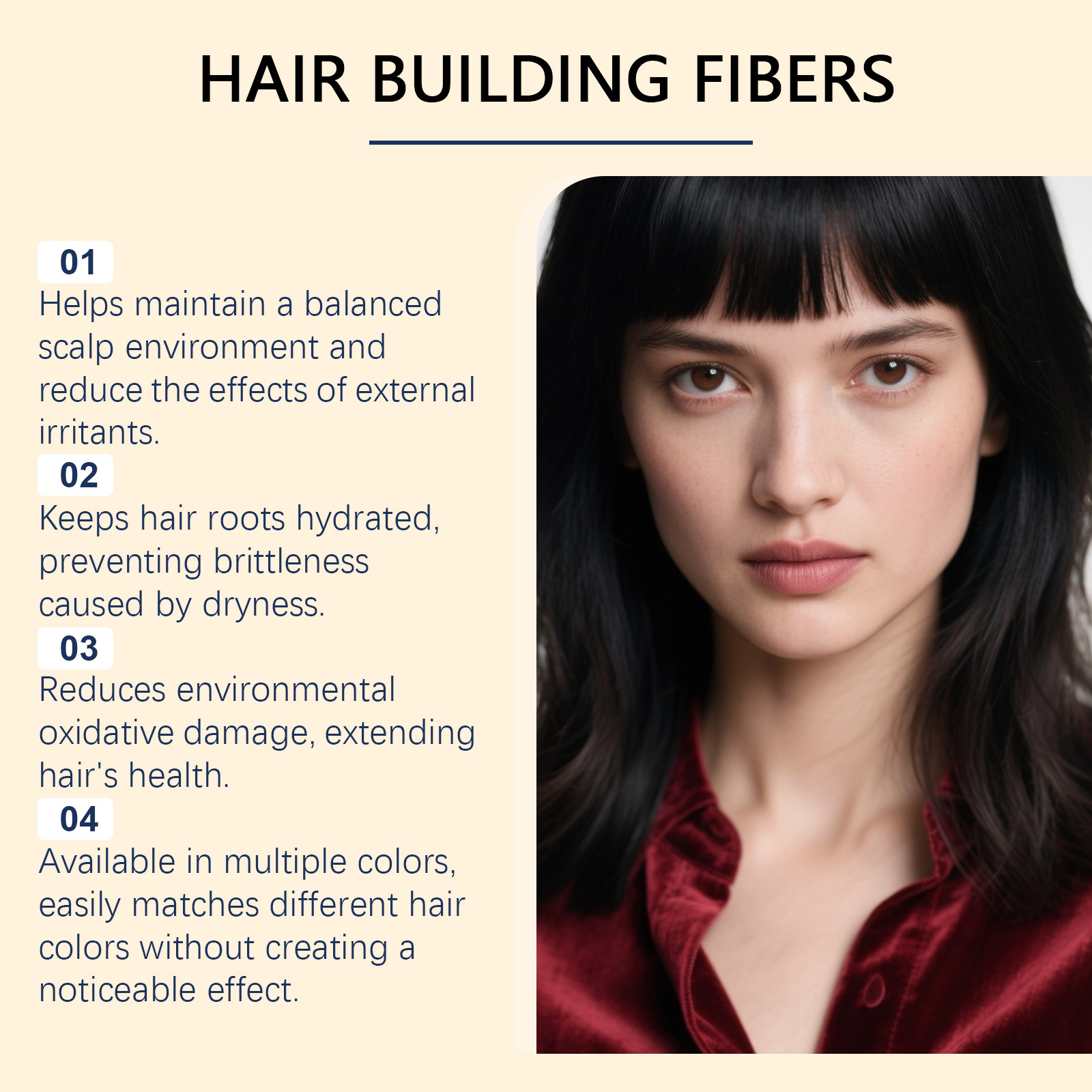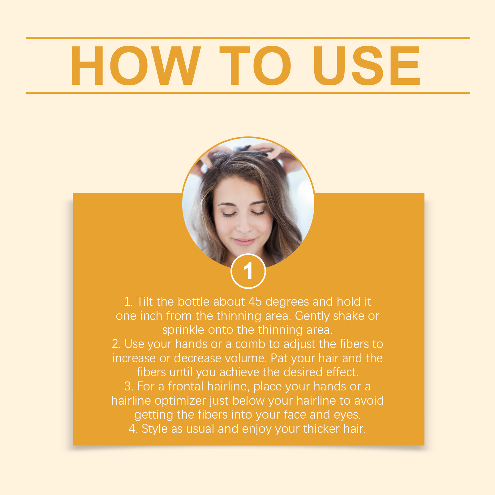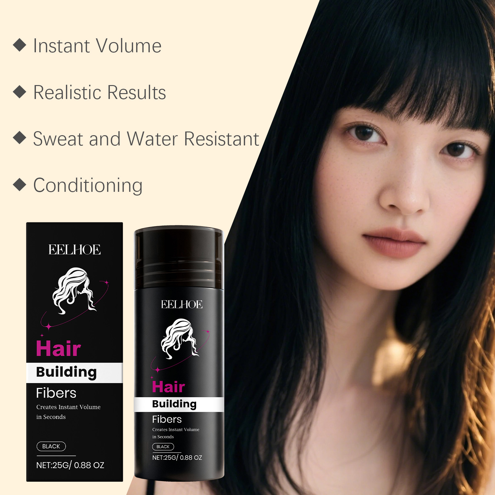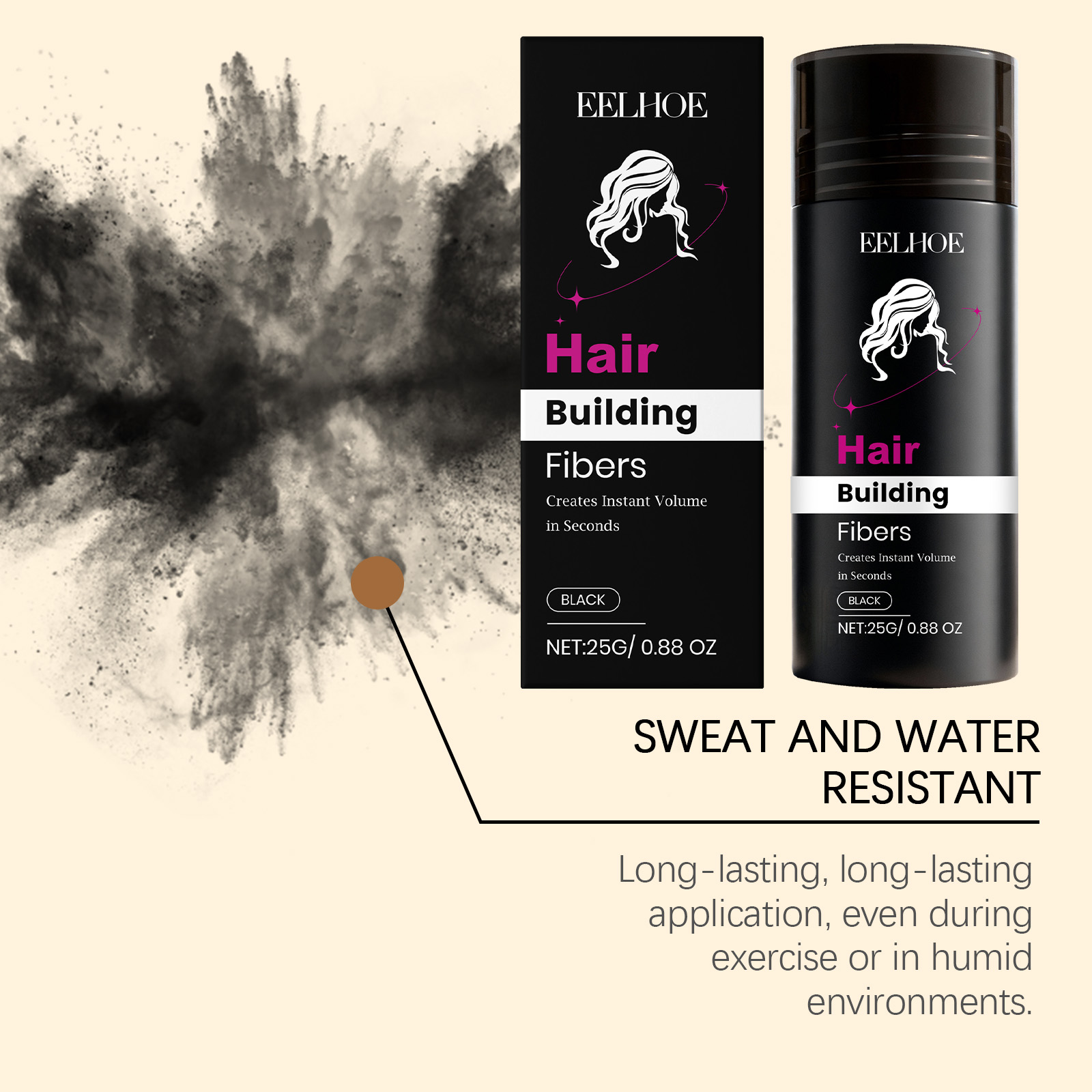 我们的角蛋白发粉(黑色),由碳、滑石粉精心调配而成。专为填补稀疏区域,视觉上增加发量密度,打造丰盈效果设计。使用方法极为便捷:1.将瓶子倾斜约45度,并将其放在稀疏区域一英寸处。轻轻摇晃或撒在稀疏区域上。2.用手或梳子调整纤维以增加或减少发量。拍打你的头发和纤维,直到达到理想效果。3.对于前额发际线,将手或发际线优化器放在发际线下方,以避免纤维进入脸部和眼睛。4.像往常一样造型,享受你的浓密头发。并且它可以持久贴合不脱妆,即使运动或潮湿环境也能保持妆效。