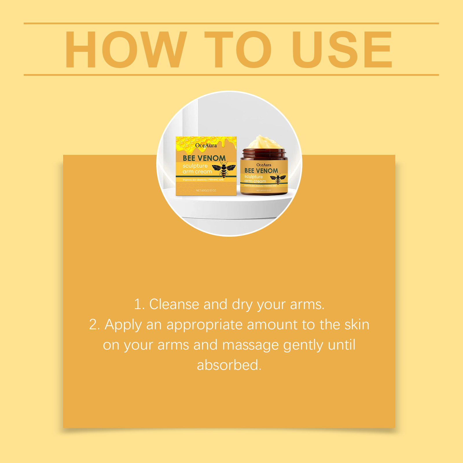 我们的蜂毒身体霜,由精氨酸、蜂毒精心调配而成。专为紧致肌肤和提升轮廓设计。使用方法极为便捷:1.清洁并擦干手臂。2.将适量涂抹在手臂皮肤上,轻轻按摩至吸收。并且有助于改善皮肤弹性状态。