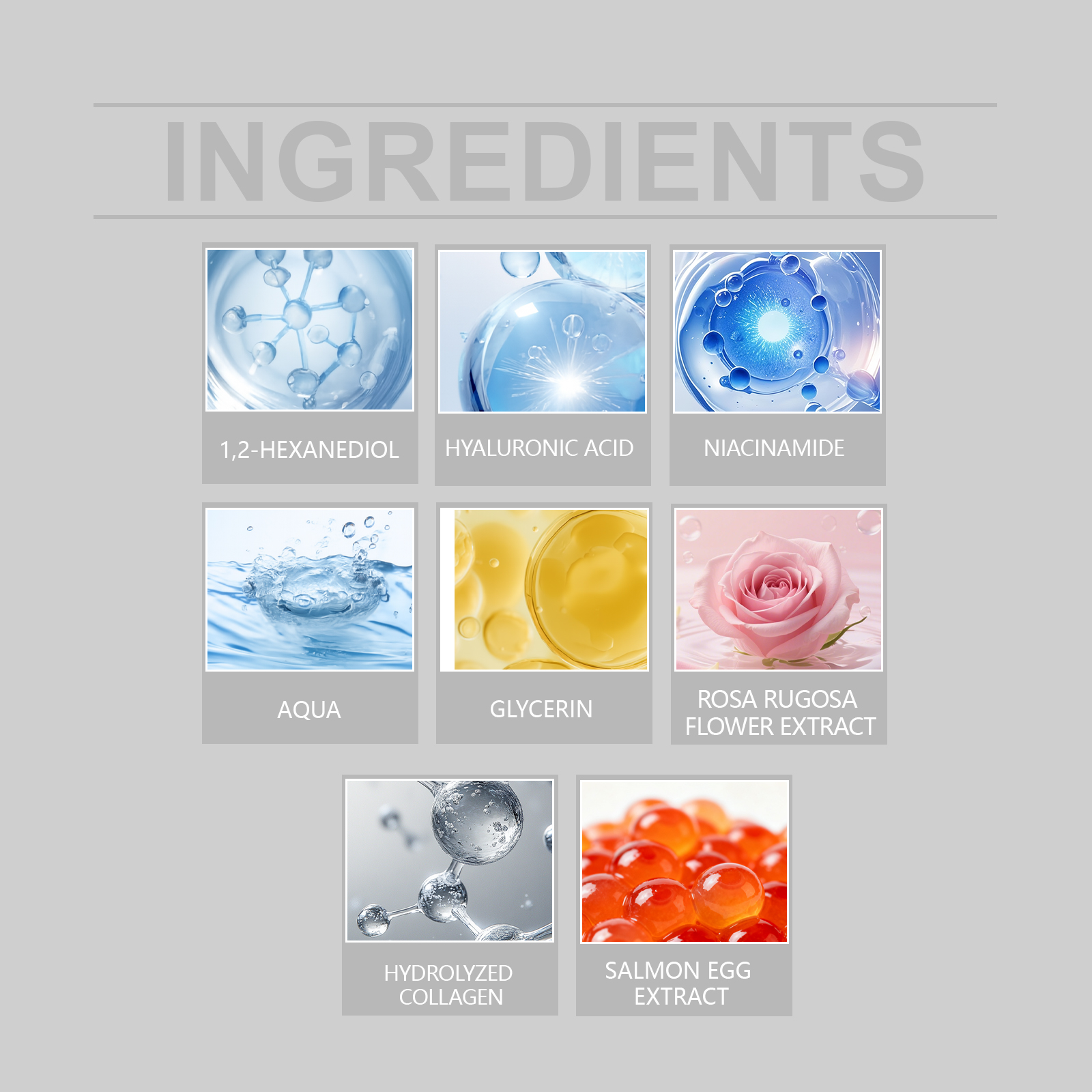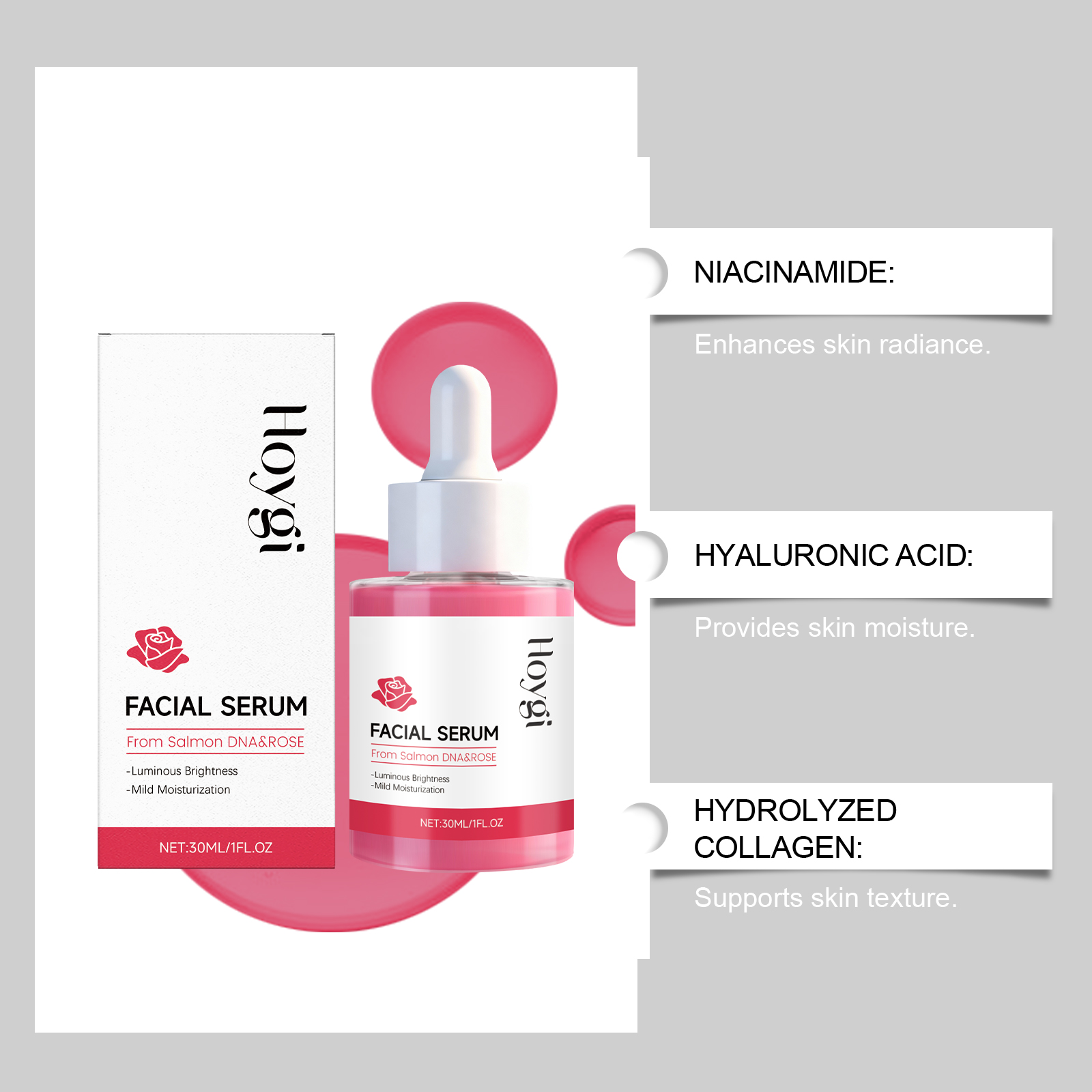 我们的保湿亮肤精华液,由鲑鱼卵提取物、玫瑰花提取物精心调配而成。专为增强皮肤的自然光泽设计。使用方法极为便捷:1.清洁皮肤并保持干燥。2.将适量本产品均匀涂抹在面部皮肤上。3.轻轻按摩至吸收。并且可以增强皮肤的保护。