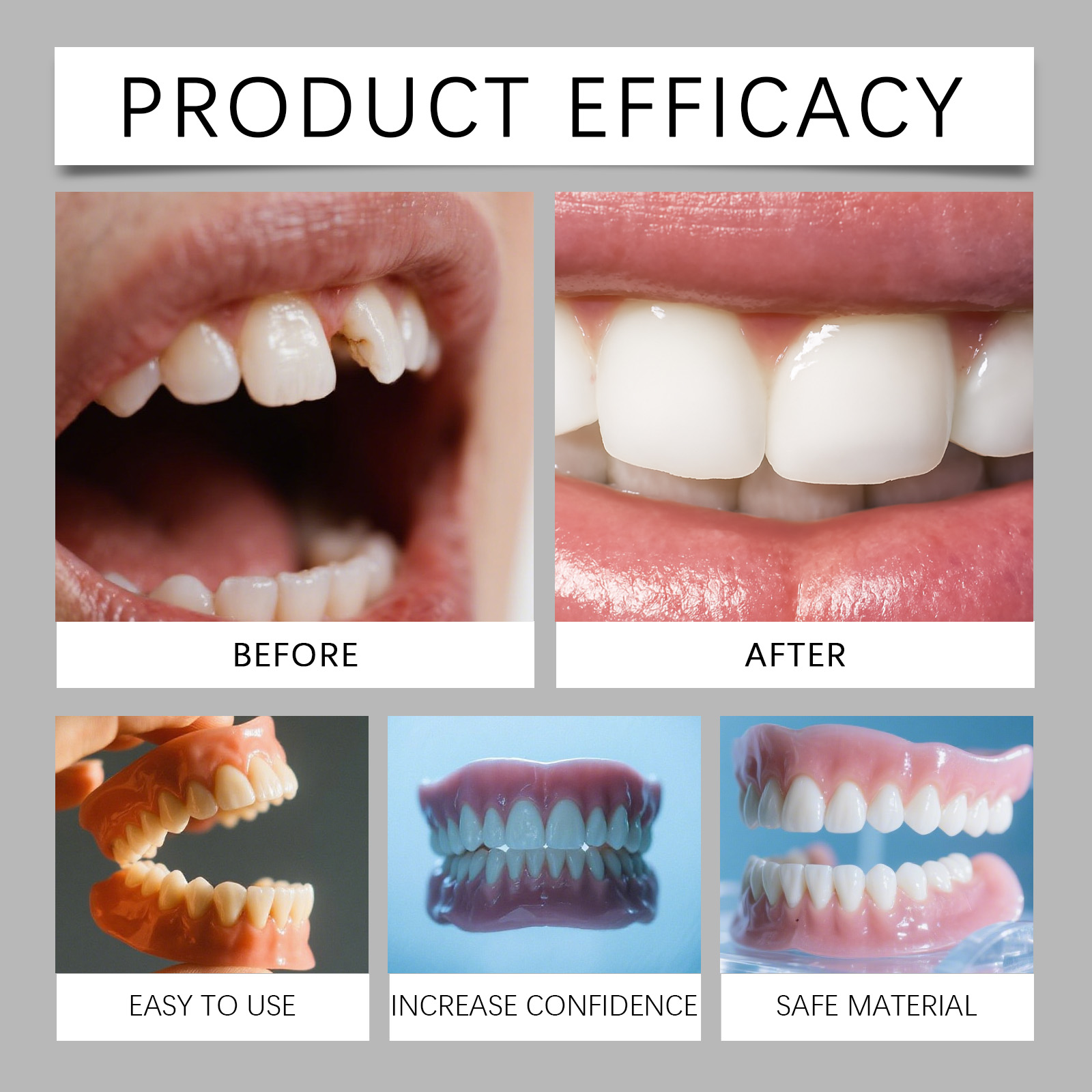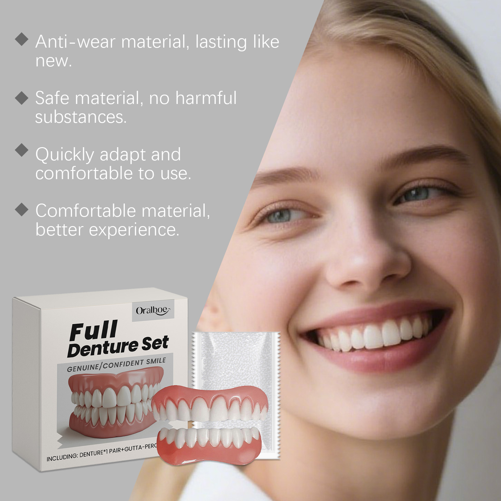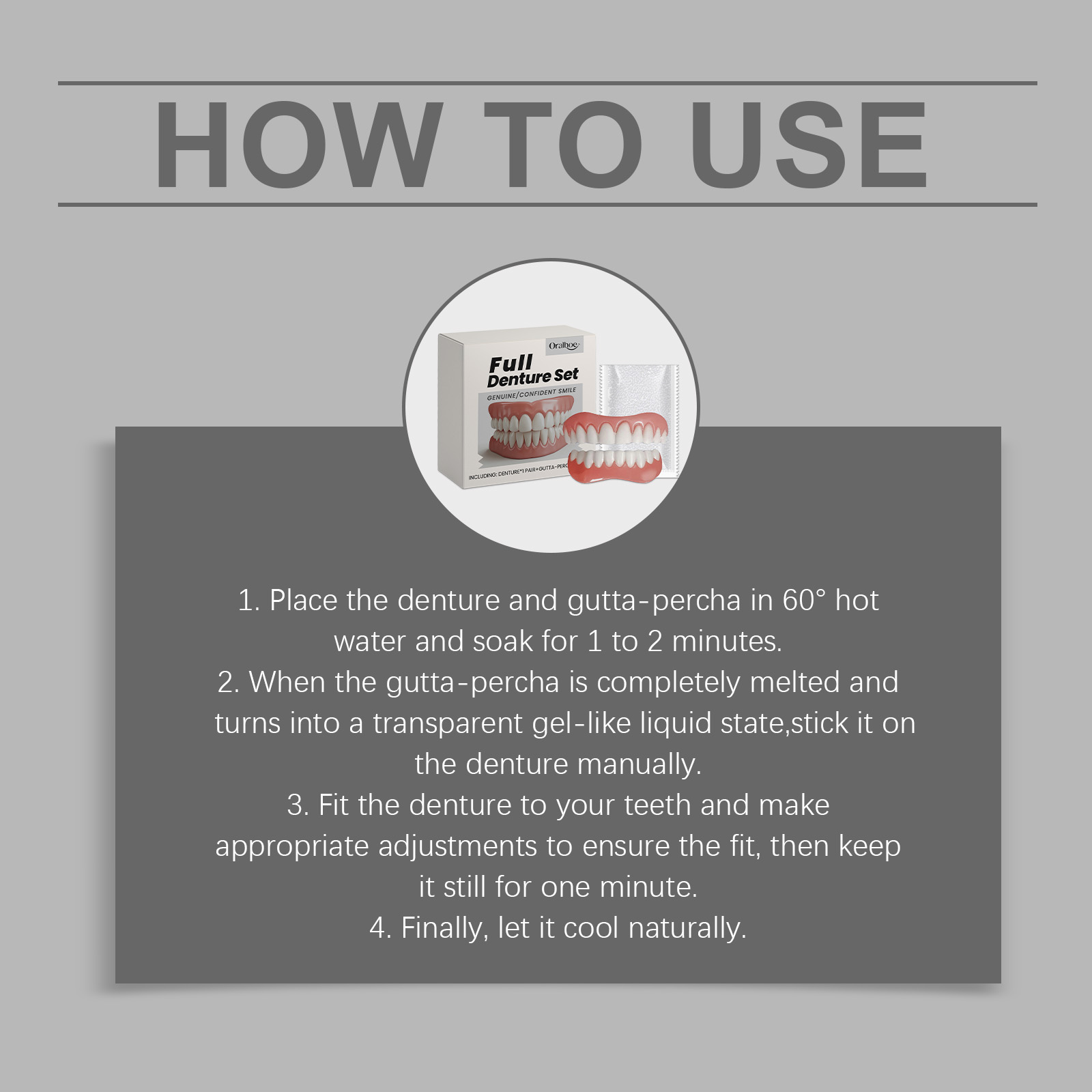 我们的假牙修饰套装,由树脂精心调配而成。专为立即提升你的外观设计。使用方法极为便捷:1.将假牙和牙胶放入60°C的热水中浸泡1到2分钟。2.当牙胶完全熔化并变成透明的凝胶状液体时,手动将其粘在假牙上。3.将假牙戴在牙齿上,并进行适当的调整,以确保贴合,然后保持一分钟。4.最后,让它自然冷却。并且易于使用且效果立竿见影。