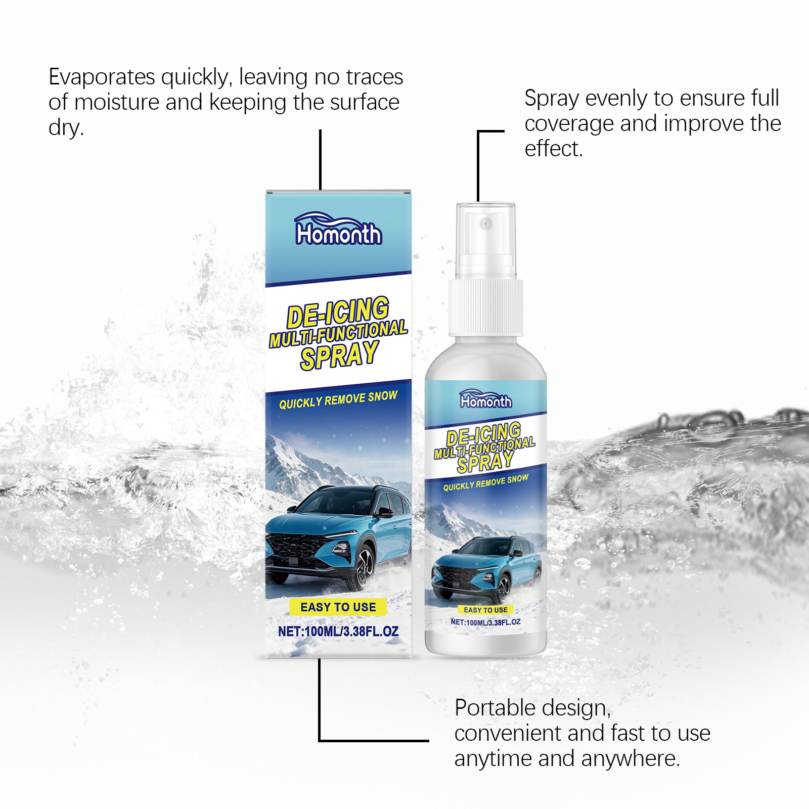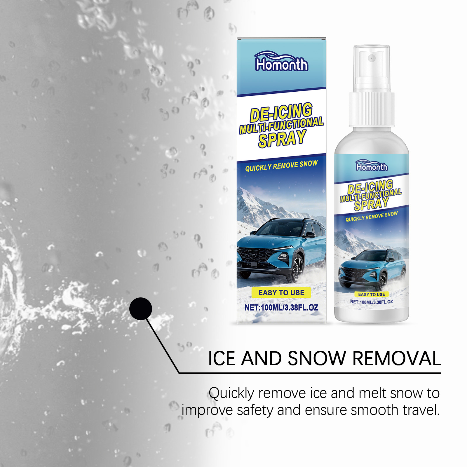 我们的汽车除冰喷雾,由乙醇 、1,2-己二醇 精心调配而成。专为融化积雪,保持清晰视野,减少雪对金属的损害,并延长汽车使用寿命设计。使用方法极为便捷:将适量本产品均匀喷洒在车身上。用干净的布或海绵均匀擦拭,直至冰和雪被清除。并且可以形成保护膜,防止雪、冰和灰尘在车体表面凝结,为您的爱车提供全方位冬季防护。