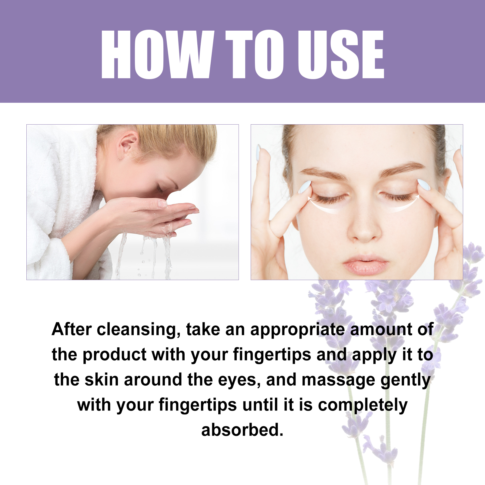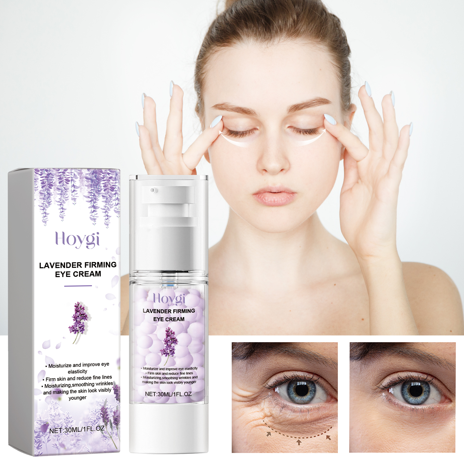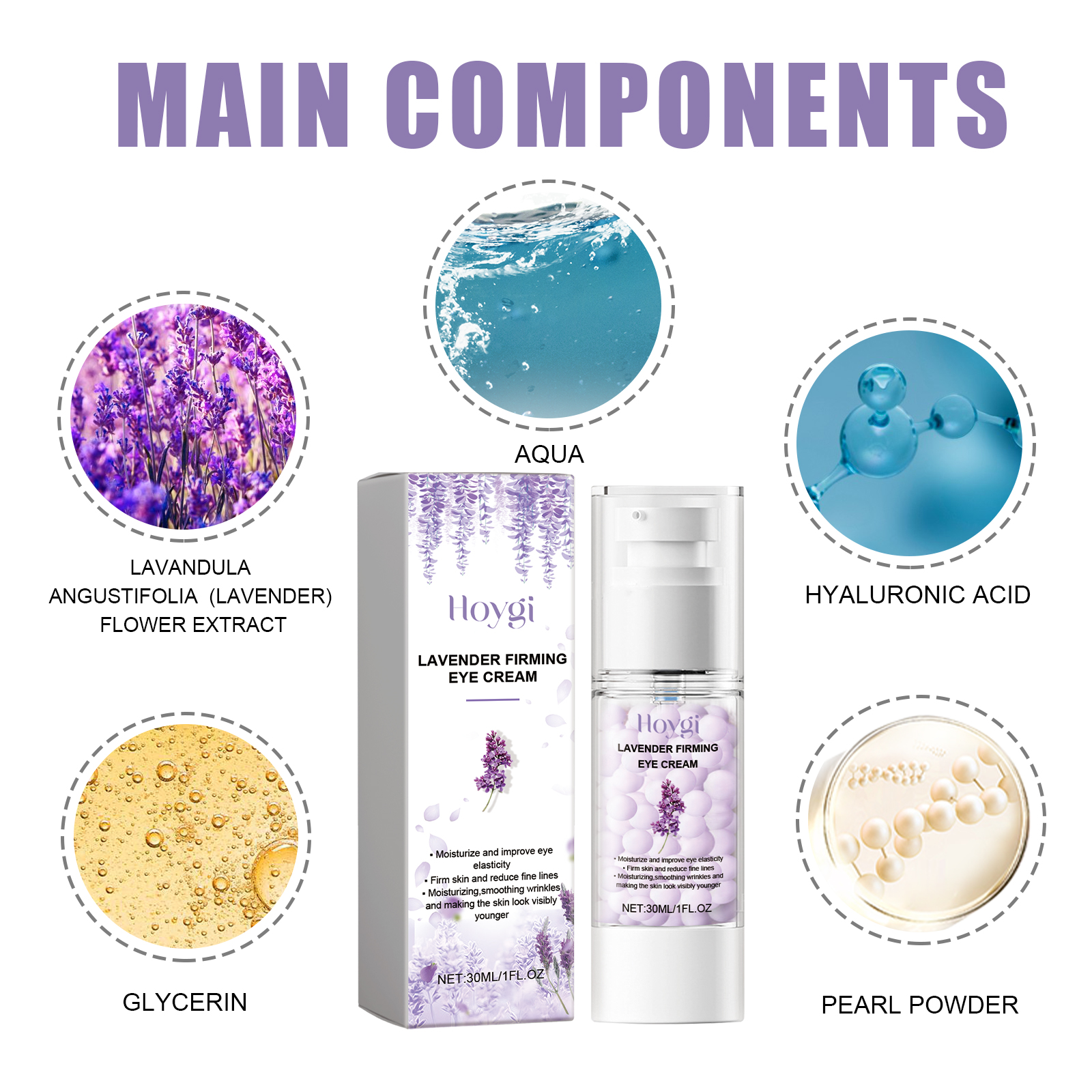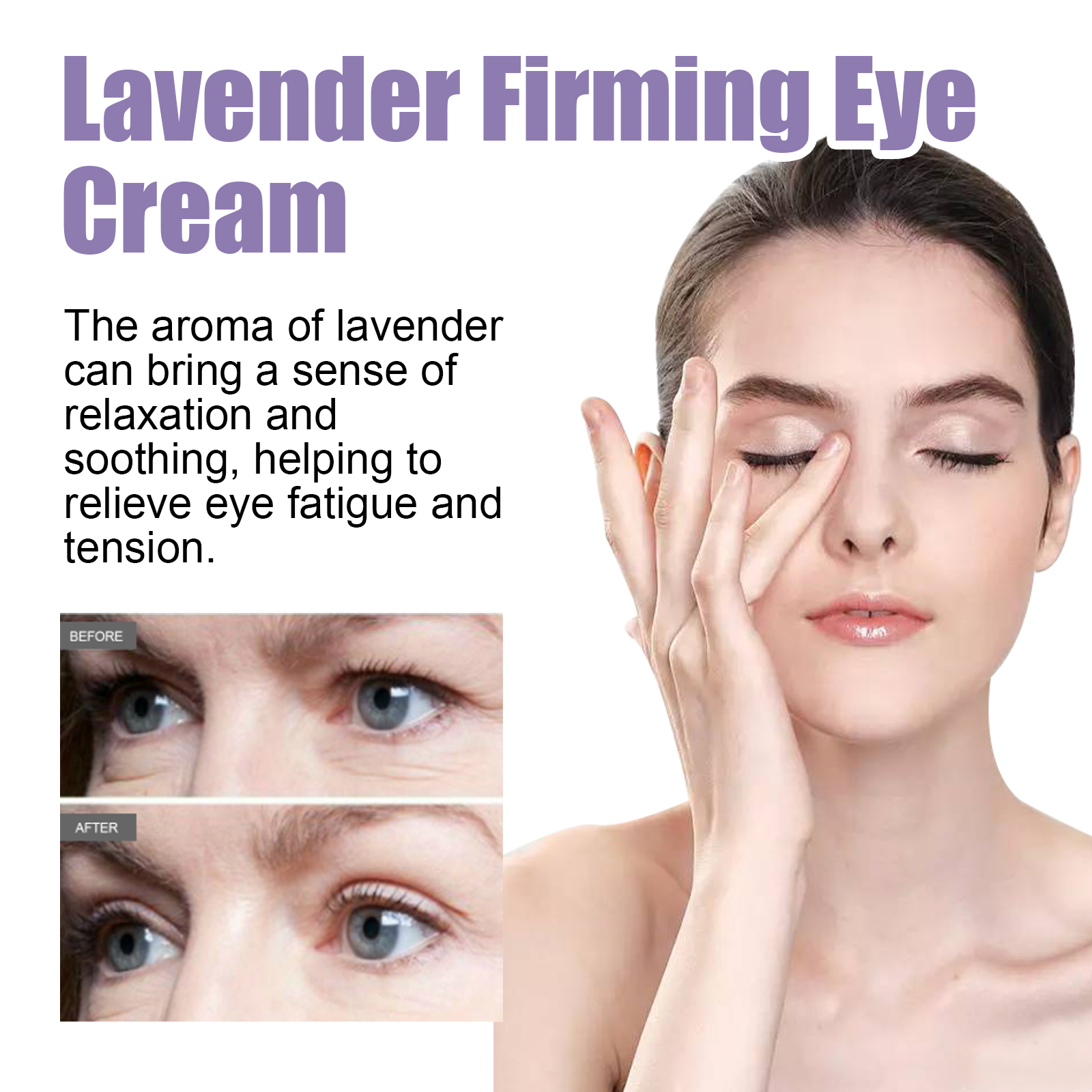 我们的薰衣草紧致眼霜含有薰衣草提取物、甘油、珍珠提取物。它可以减缓眼部肌肤的老化过程,从而减少细纹和皱纹,均匀肤色,使眼睛周围的皮肤看起来更明亮。它的使用方法很简单:洁面后,用指尖取适量产品涂抹于眼周肌肤,并以指尖轻轻按摩至完全吸收即可。可以带来放松和舒缓的感觉,有助于缓解眼睛的疲劳和紧张。