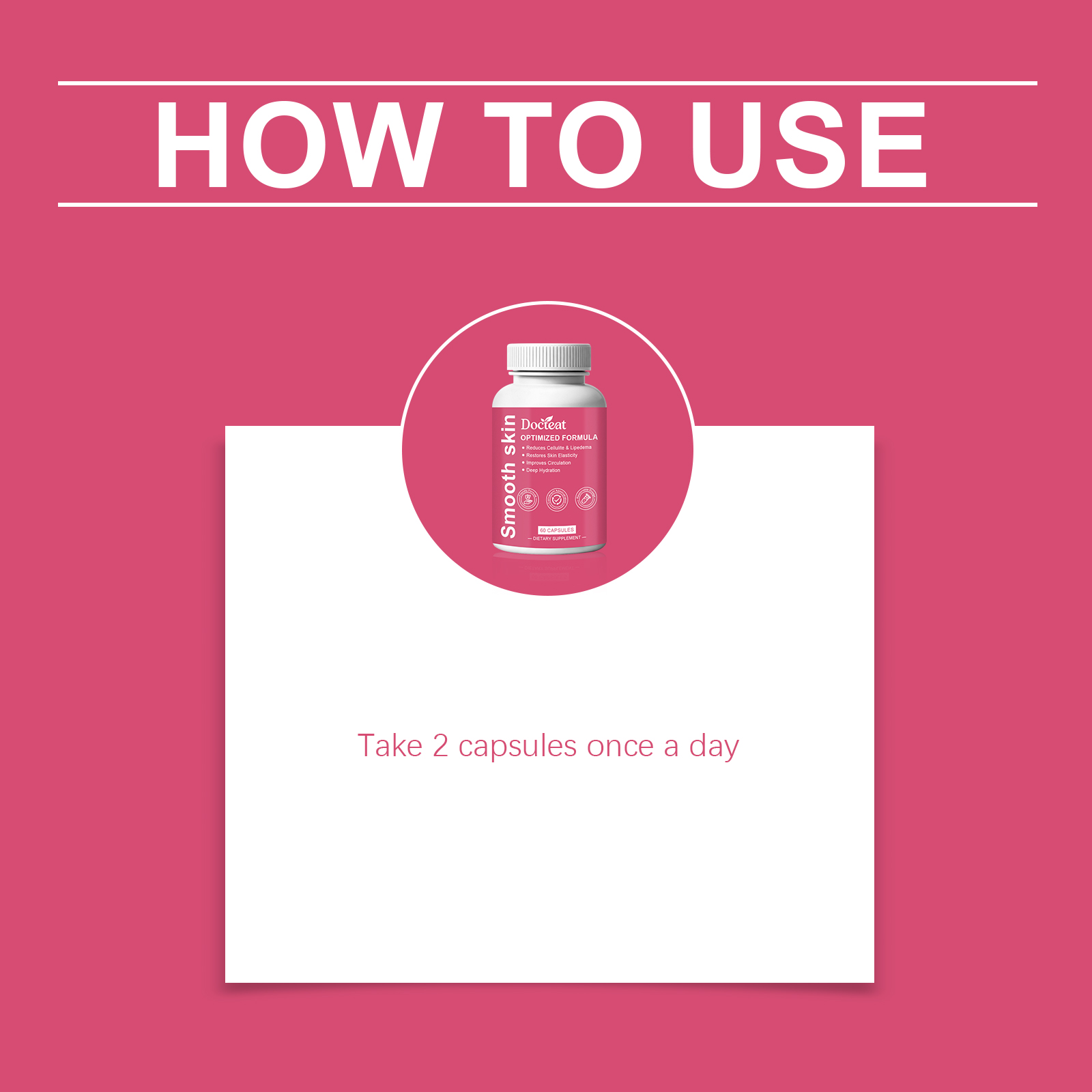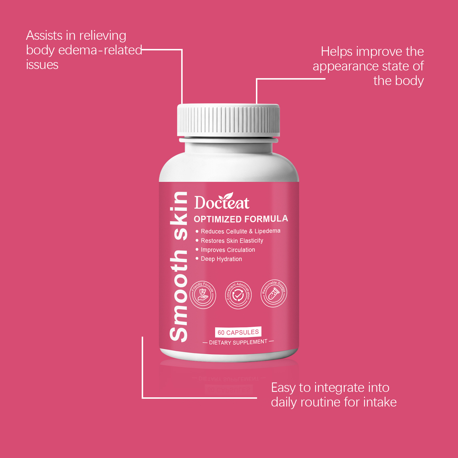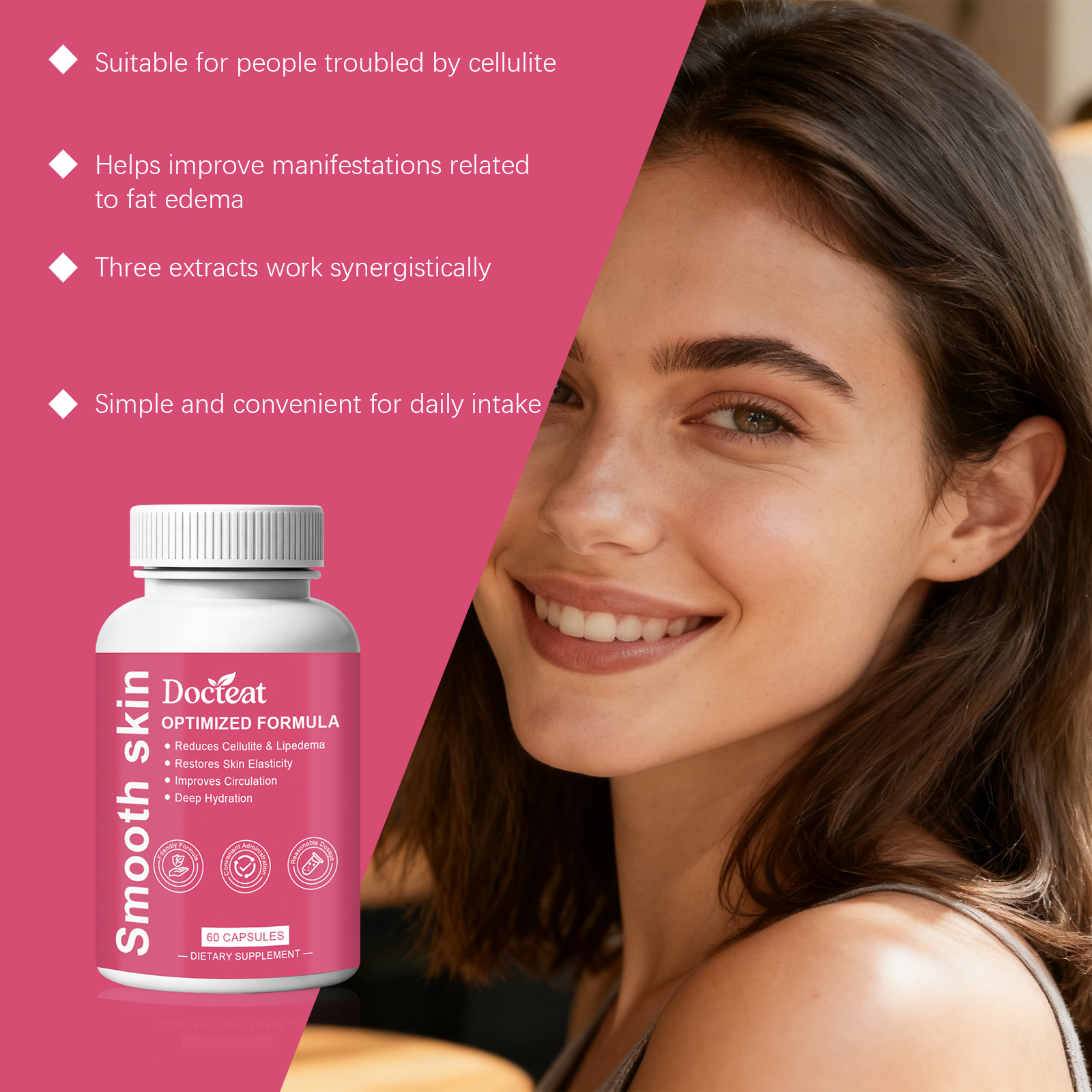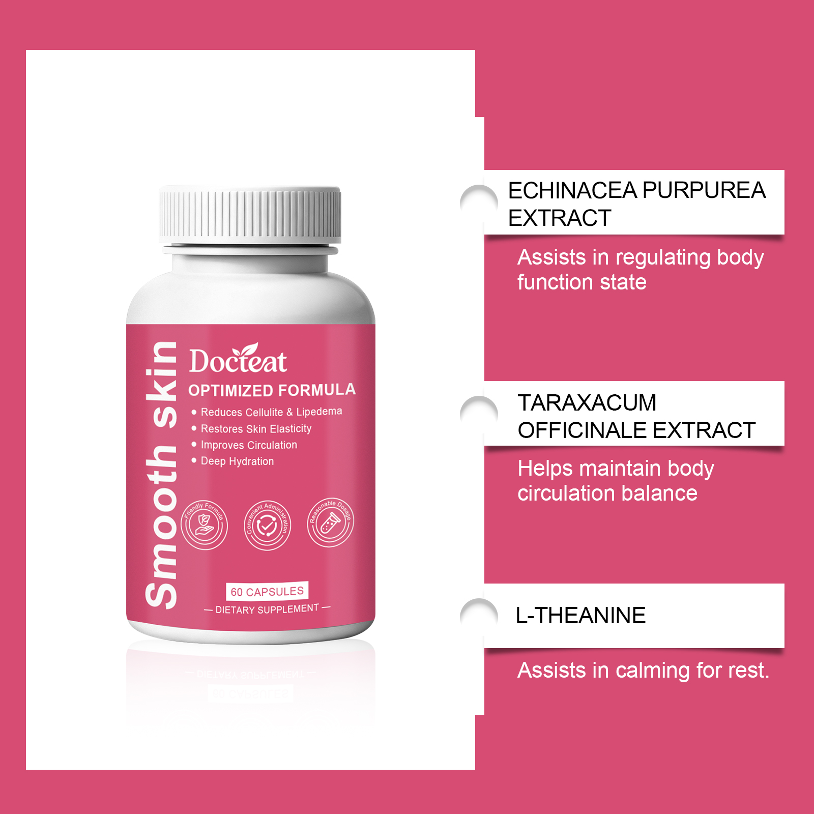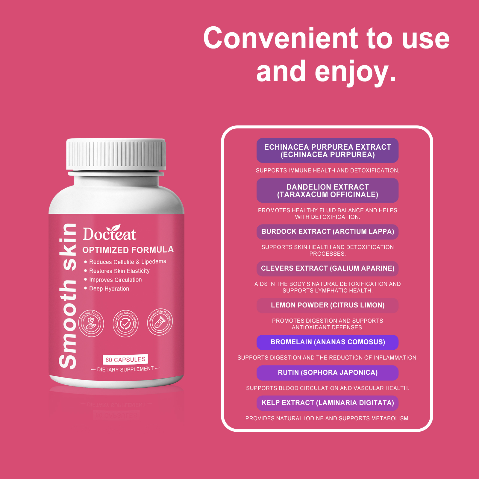 我们的身体护理胶囊,由紫锥菊提取物、蒲公英提取物精心调配而成。专为有助于改善橘皮组织的外观,有助于缓解脂肪水肿不适设计。使用方法极为便捷:每天一次,每次2粒。并且它可以有助于调节身体循环功能。