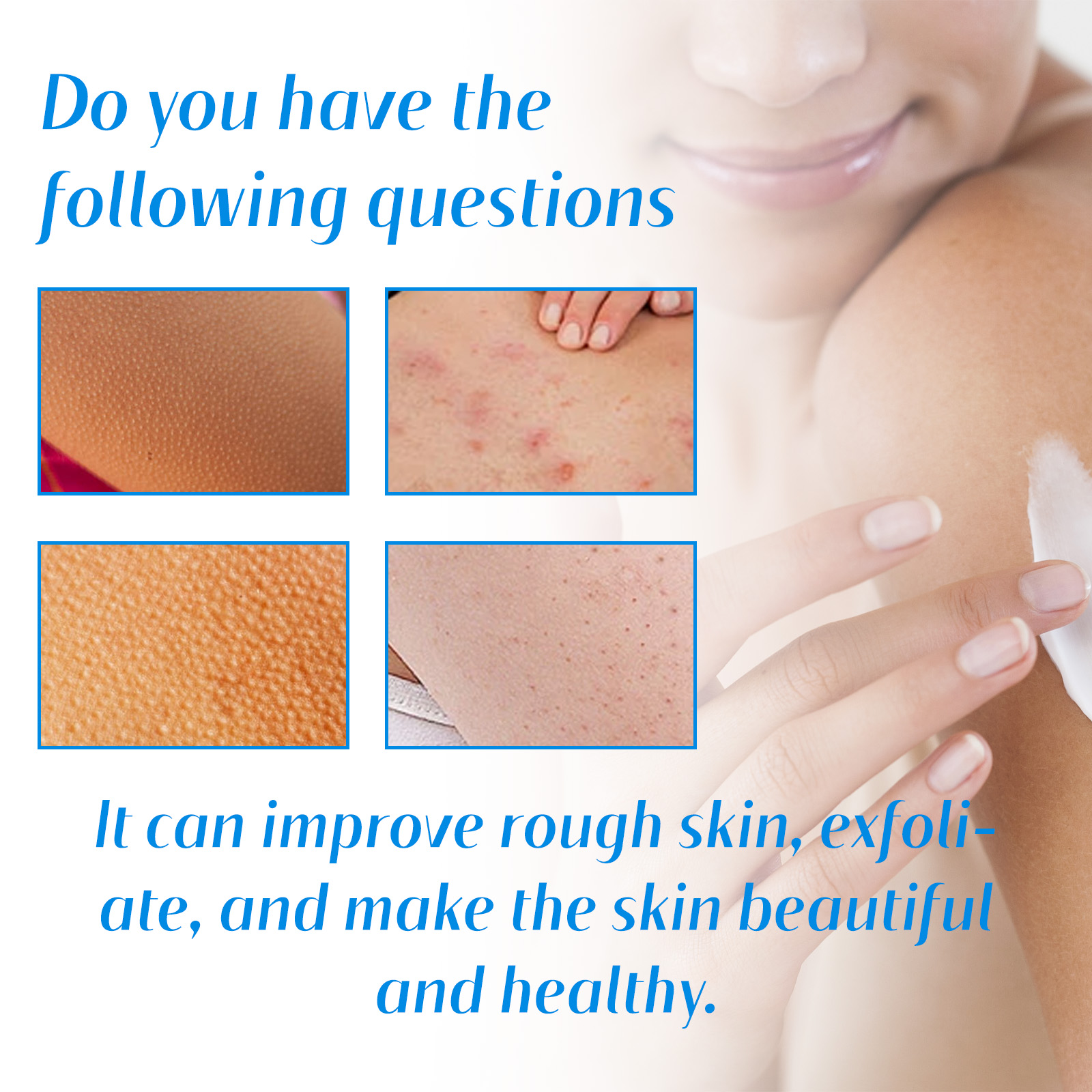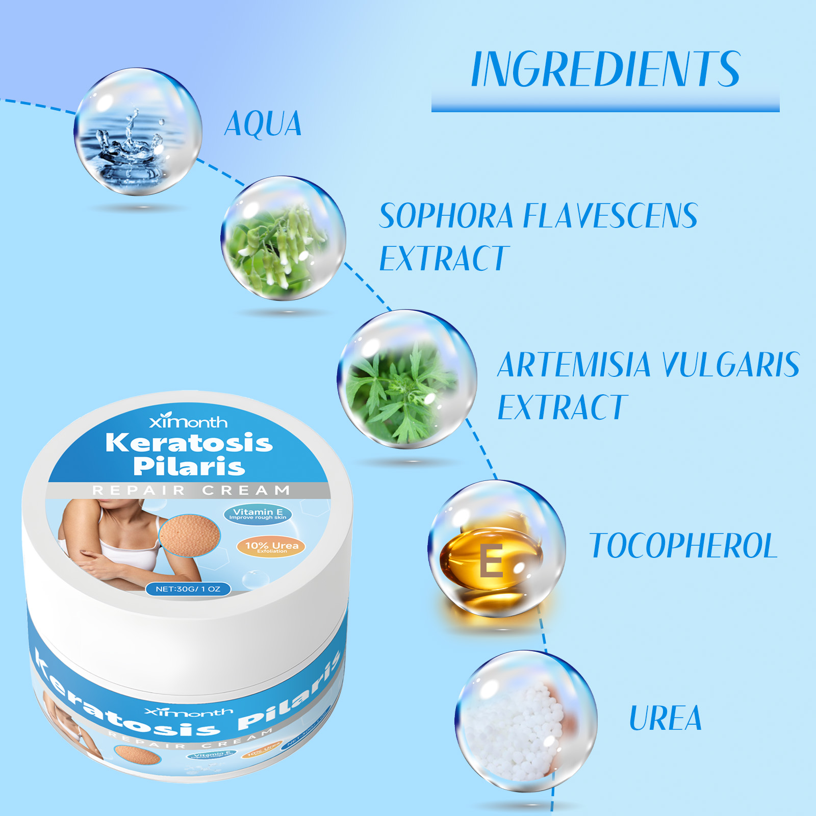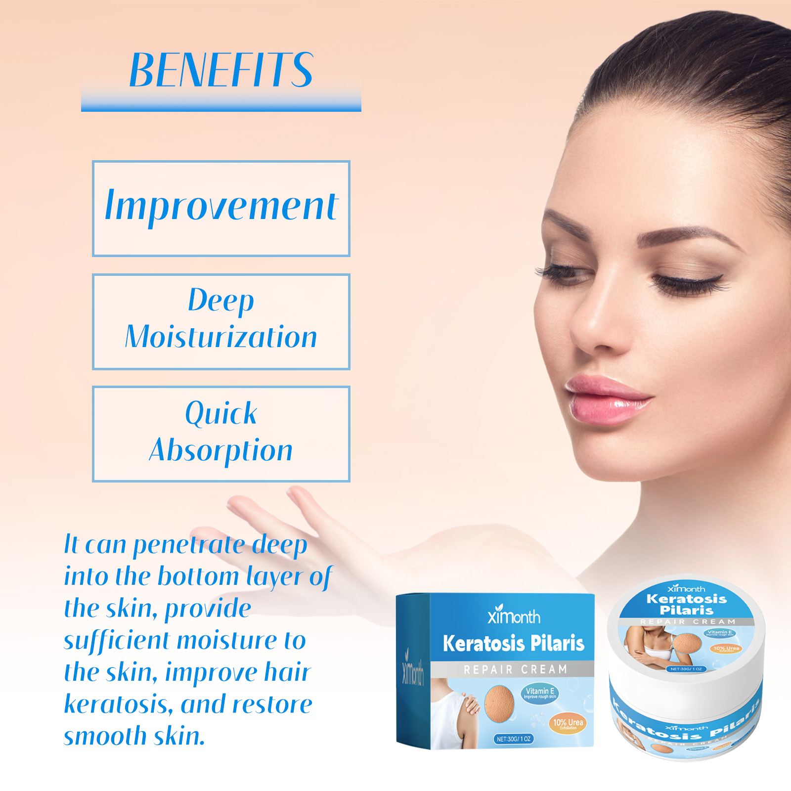 我们的去鸡皮保湿修护霜含有苦参提取物、艾草提取物、维生素E。它可以深层渗透肌肤底层,为肌肤提供充足水分,改善毛发角化现象,令肌肤恢复光滑,可以迅速被肌肤吸收,不会留下粘腻的感觉,保持肌肤清爽舒适。它的使用方法很简单:洁肤后,取适量本品,均匀涂抹于肌肤上,轻轻按摩至吸收即可。可以改善皮肤粗糙,深层滋润补水,使皮肤美丽健康。