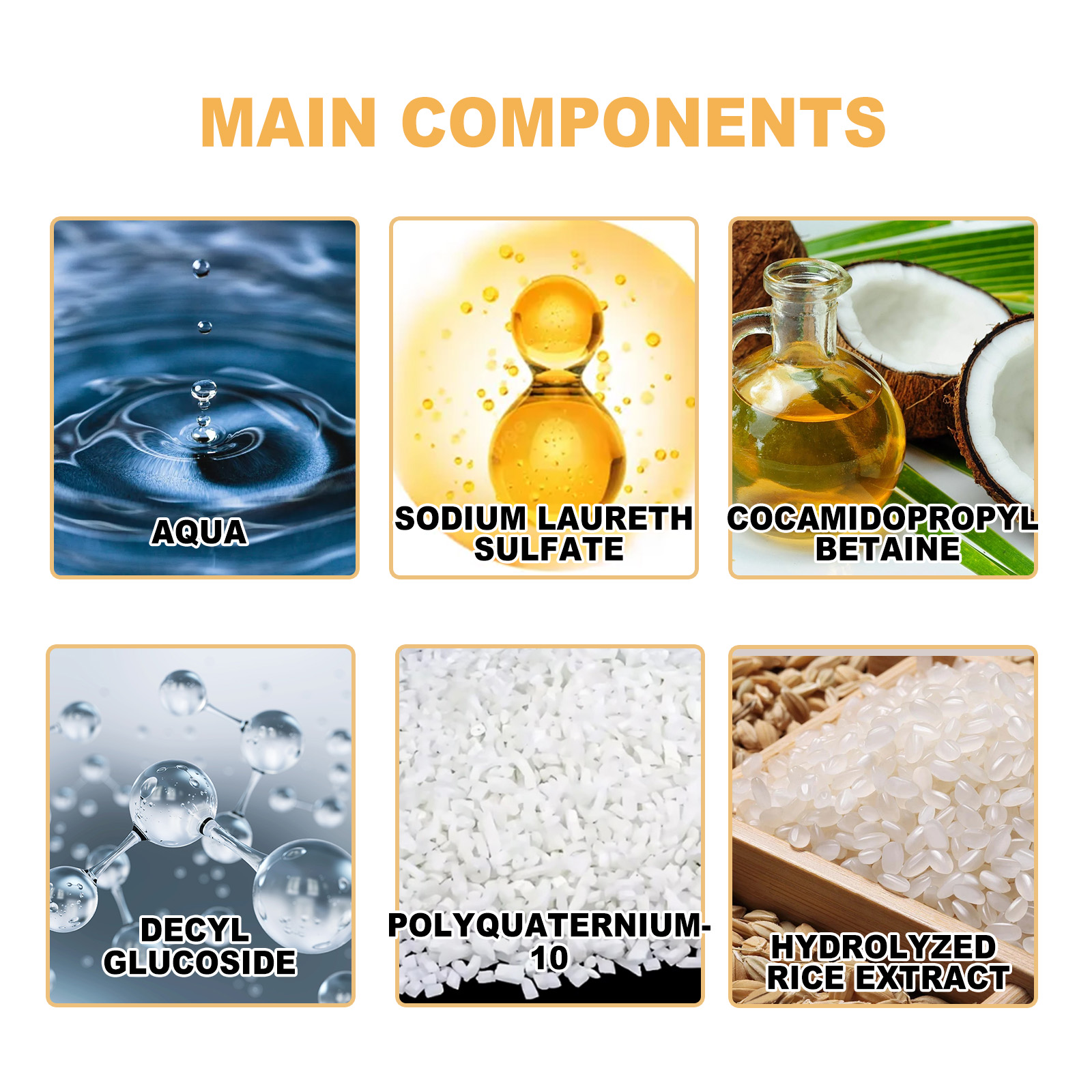 我们的大米防脱洗发水含有月桂醇聚醚硫酸酯钠、椰油酰胺丙基甜菜碱。它可以滋养和保护头发,还能改善毛囊的健康,有助于促进头发的健康生长,使你的头发更浓密、更饱满,帮助滋润头发,使头发更光滑有光泽。它的使用方法很简单:用温水湿润头发,取适量本品涂抹在头发和头皮上并搓出泡沫,最后用温水冲洗干净即可。可以深度唤醒休眠的毛囊,促进新毛发的生长,使毛发更加健康浓密。