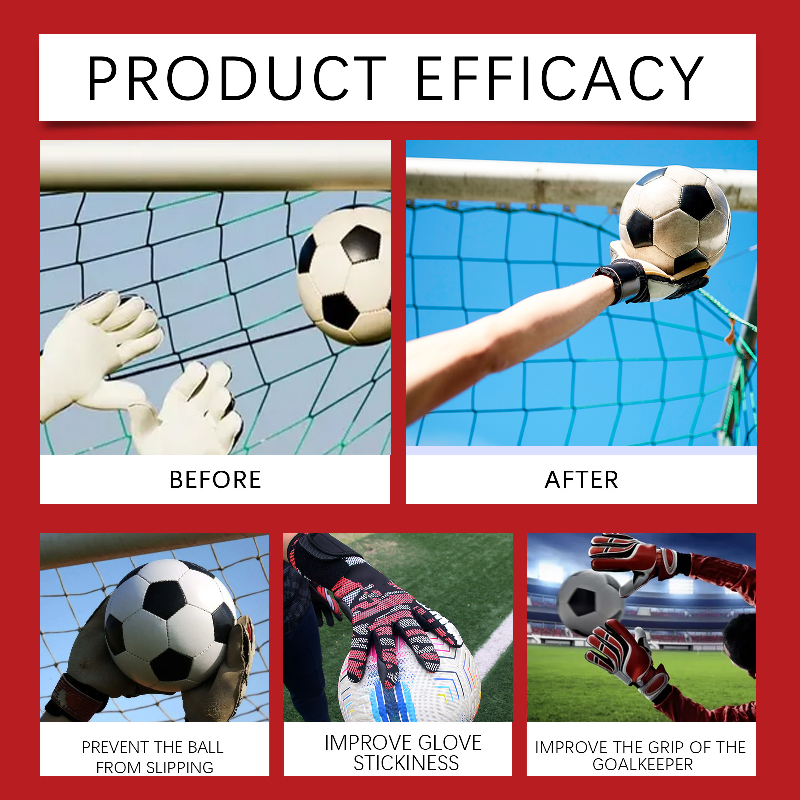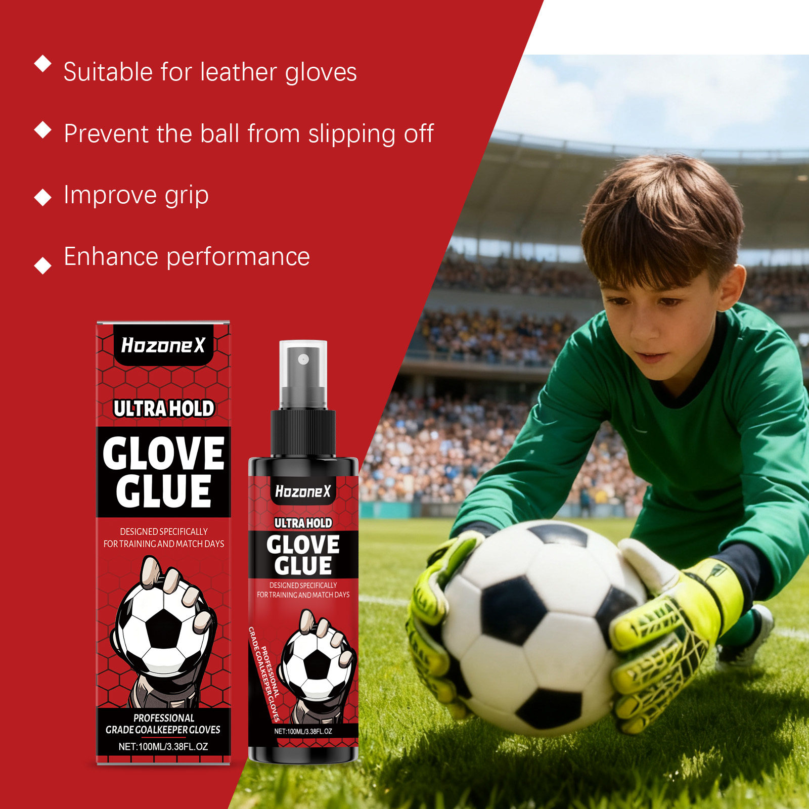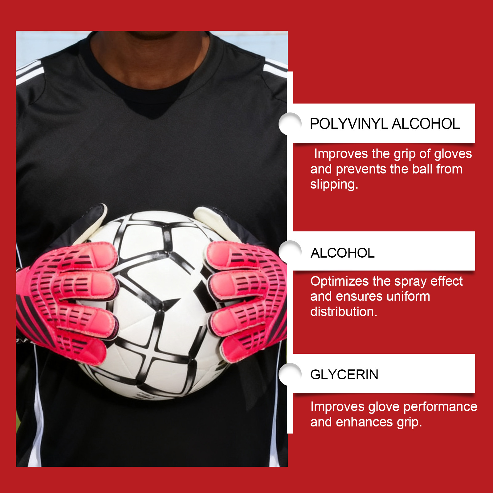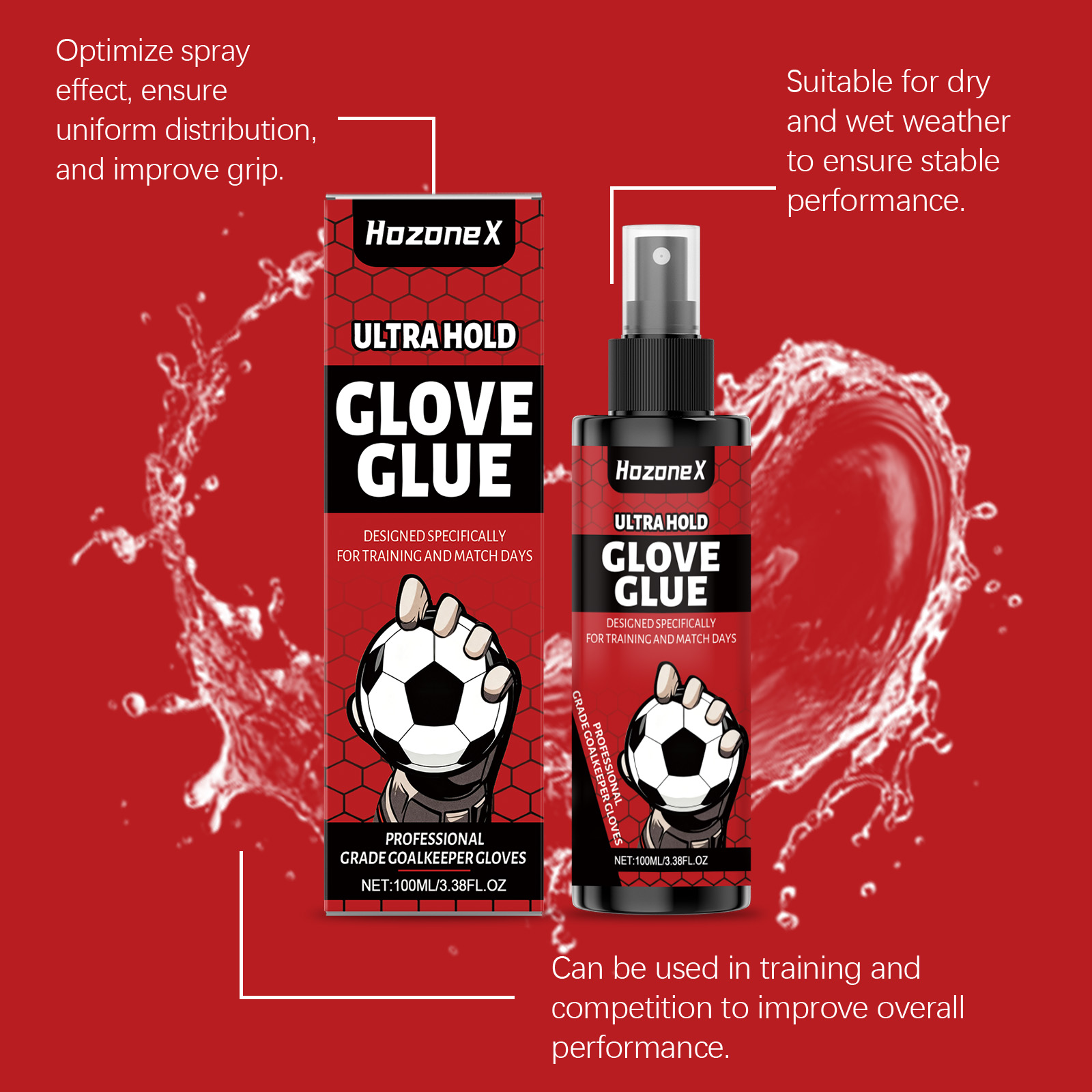我们的手套防滑喷雾,由甘油、1,2-己二醇精心调配而成。专为提升手套的抓握力,防止球滑动设计。使用方法极为便捷:在每只手套的掌心喷洒到2-3次,用手操搓,并上其自然风干。根据需重复喷洒,以确保在整个比赛中保持良好的抓握力。并且适用于各种守门员手套,可以增强抓握力和信心。