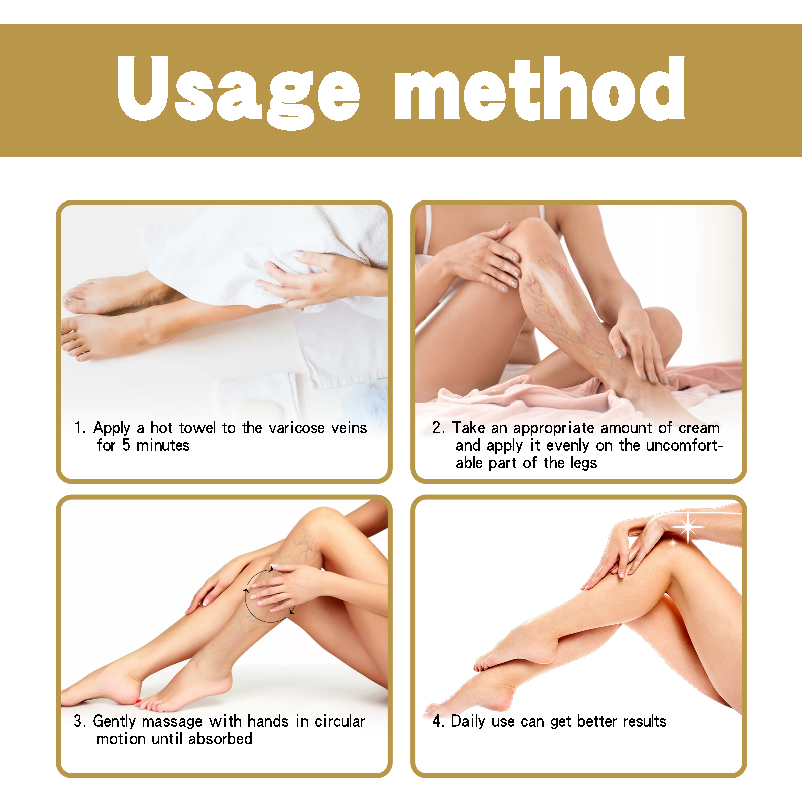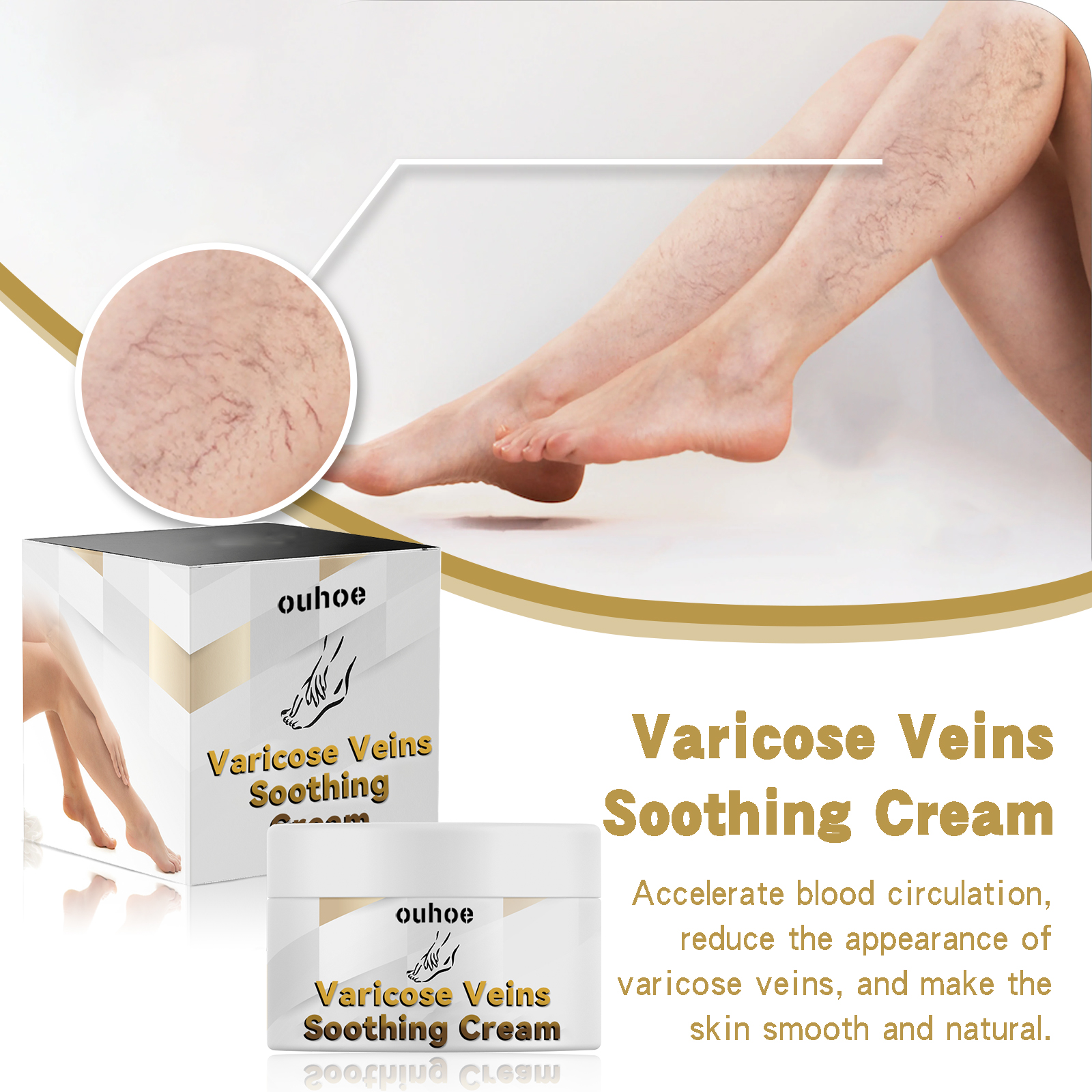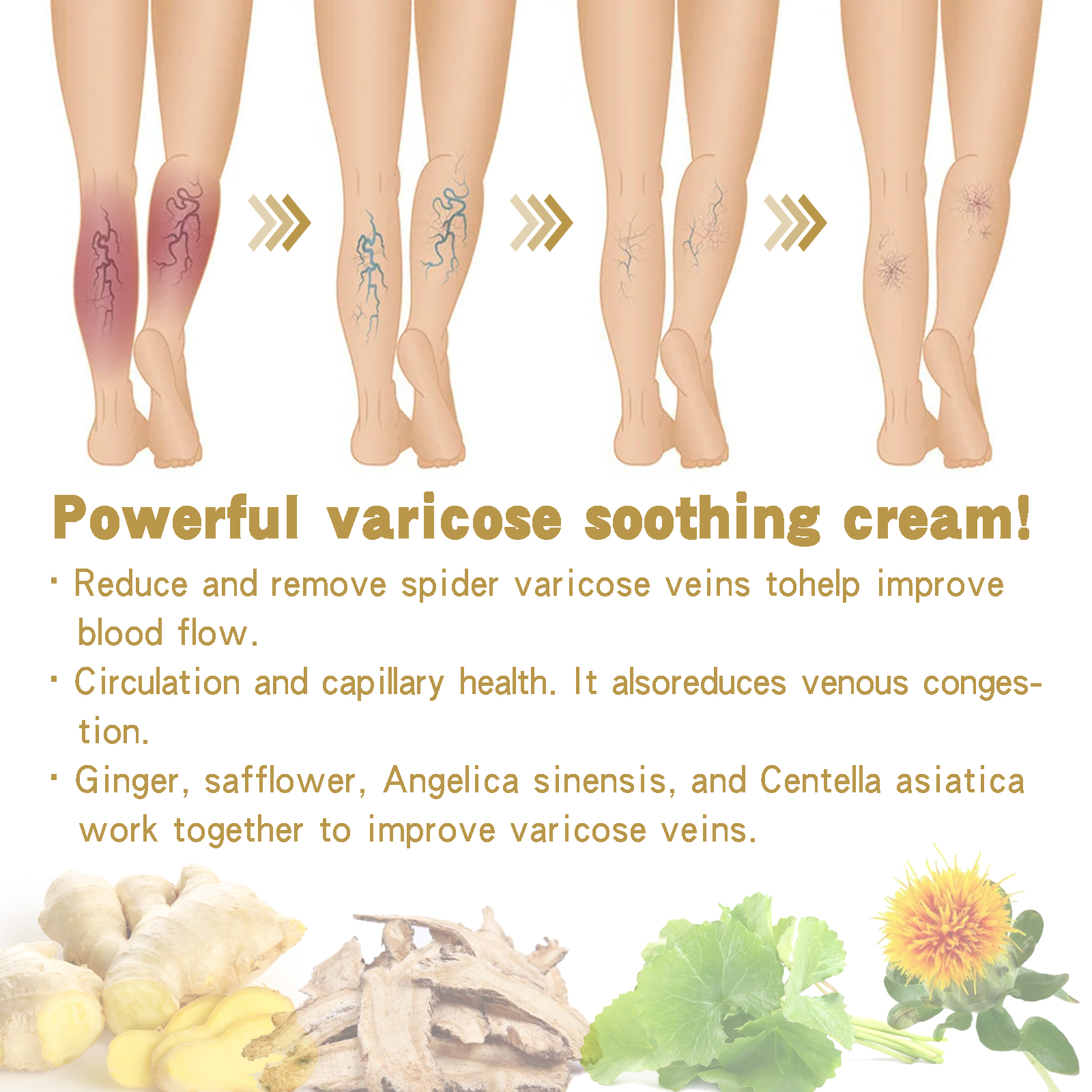 我们的静脉修护霜含有烟生姜提取物、红花提取物、当归提取物。它可以减少和去除蜘蛛静脉曲张,帮助改善血液流动。循环和毛细血管健康。它还能减少静脉充血。同生姜、红花、当归和积雪草一起更加有效改善静脉曲张。它的使用方法很简单:首先将热毛巾敷在静脉曲张处5分钟,然后取适量面霜,均匀涂抹在腿部不舒服的部位,最后用手做圆周运动轻轻按摩,直至吸收,在日常使用可以得到更好的效果,加速血液循环,减少静脉曲张的出现,使皮肤光滑自然。
