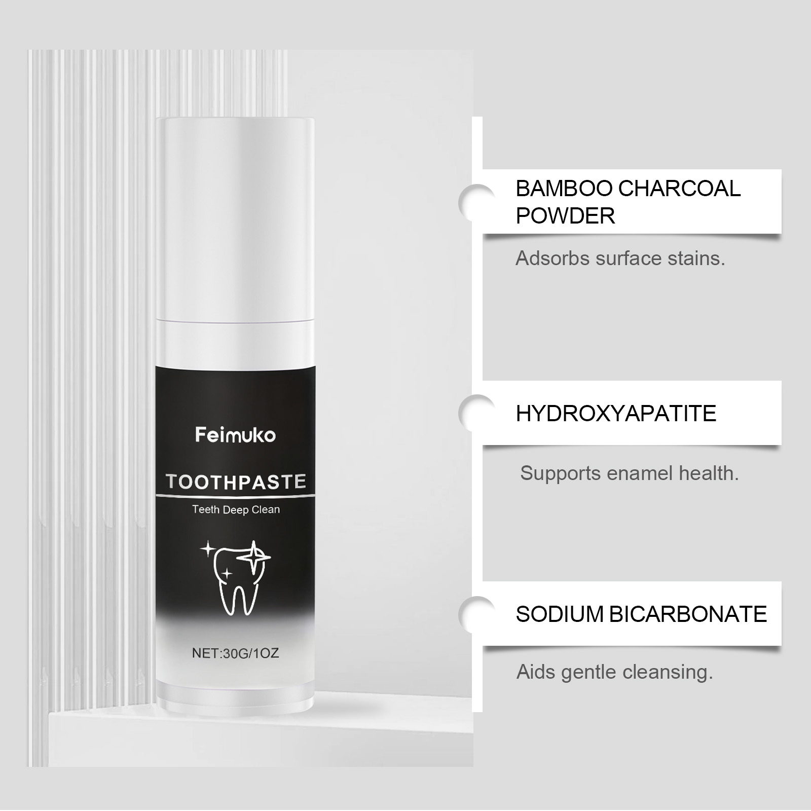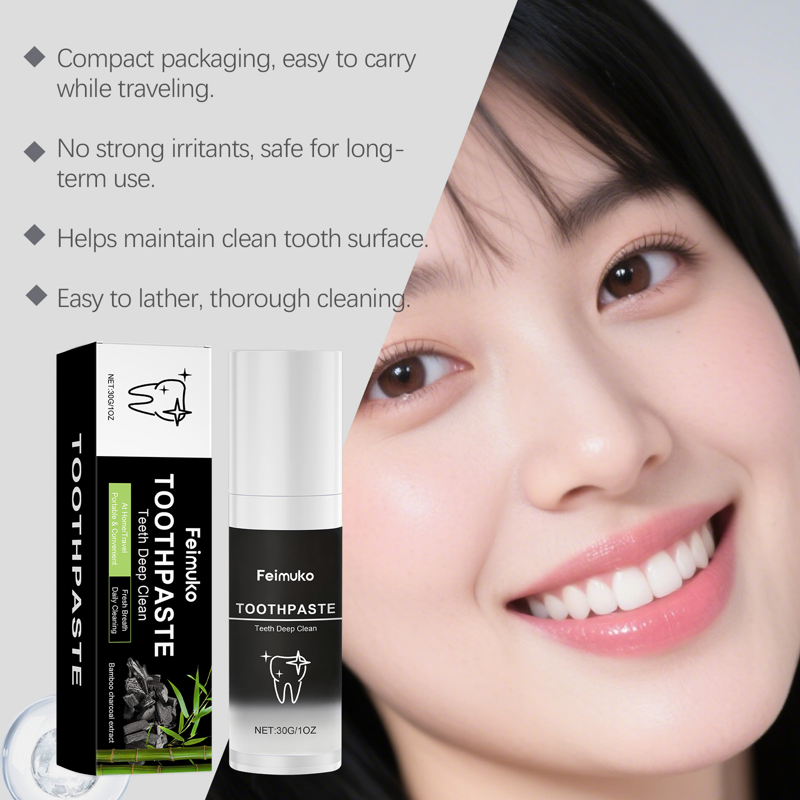 我们的竹炭牙膏,由薄荷醇、竹炭粉精心调配而成。专为刷新牙齿外观设计。使用方法极为便捷:1.将适量牙膏挤到牙刷上。2.刷牙2-3分钟,然后用水漱口。3.每天早晚各使用一次,以获得更好的效果。并且可以彻底清洁牙齿表面。