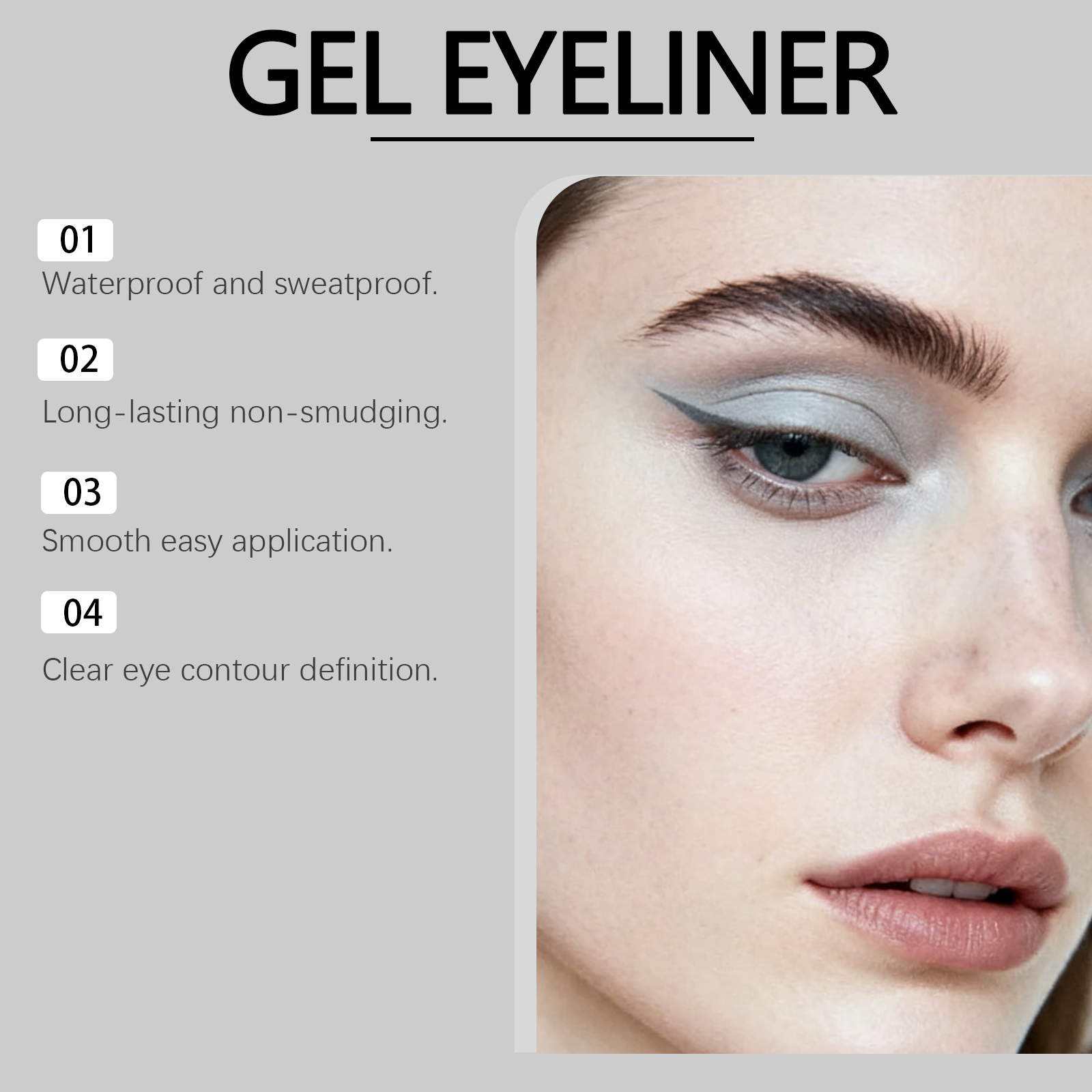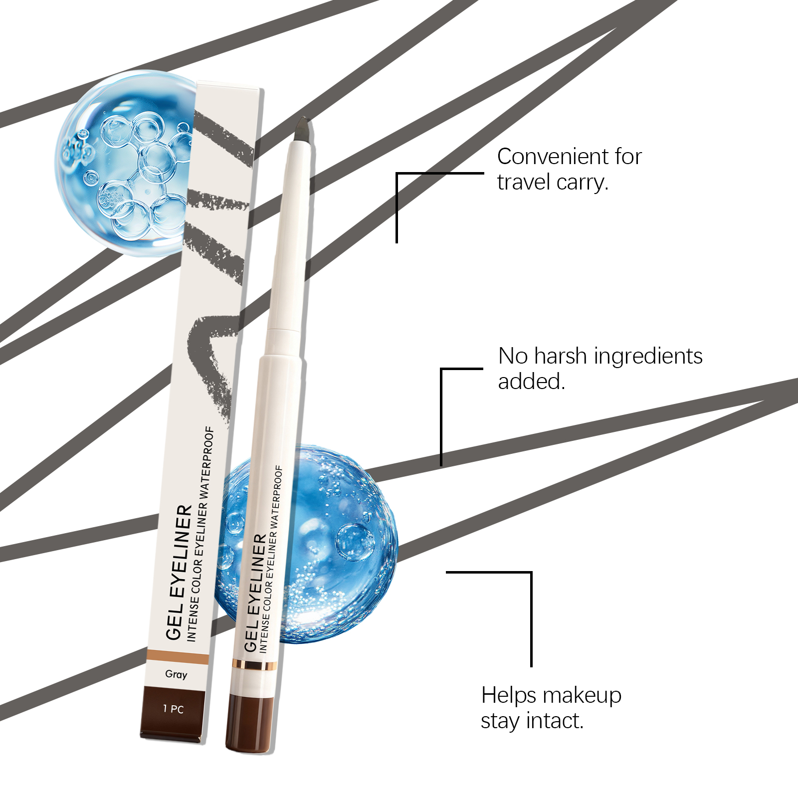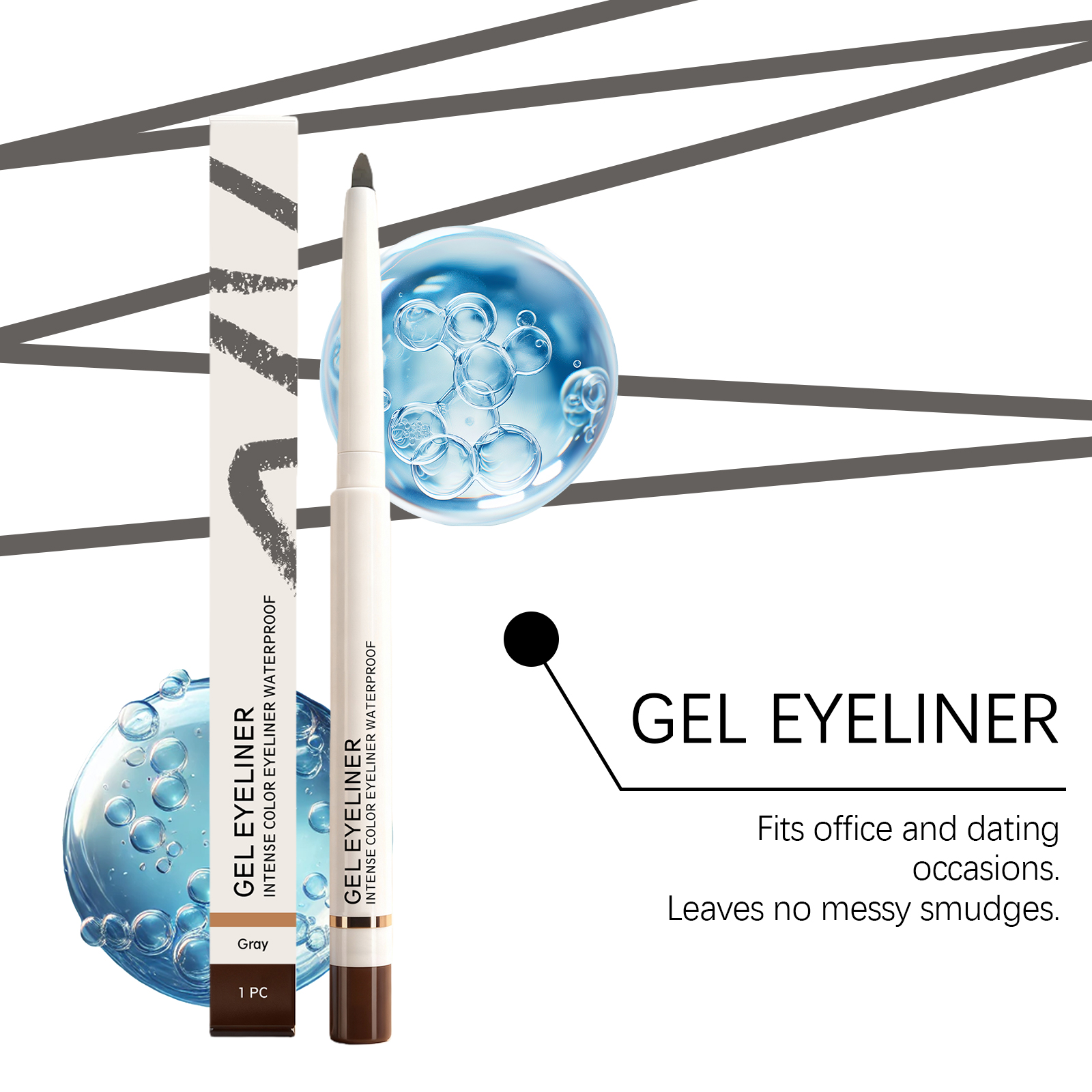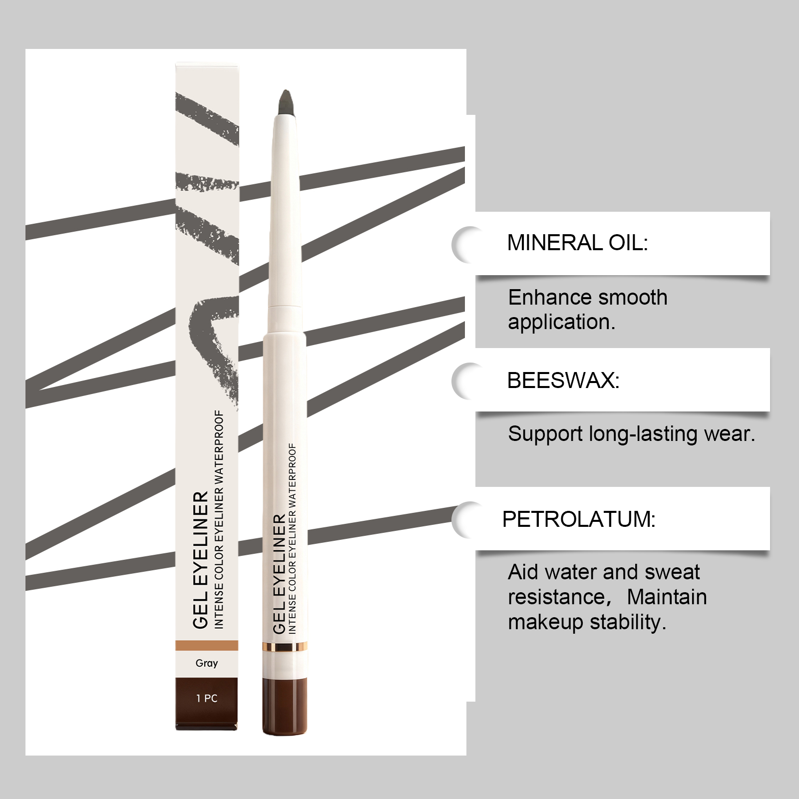我们的灰色哑光防水眼线笔,由矿油、蜂蜡精心调配而成。专为防水防汗,长效不易晕染设计。使用方法极为便捷:打开盖子,旋出适量膏体,紧贴睫毛根部,从眼尾向眼头轻描。并且它顺滑易涂抹,眼部轮廓清晰。