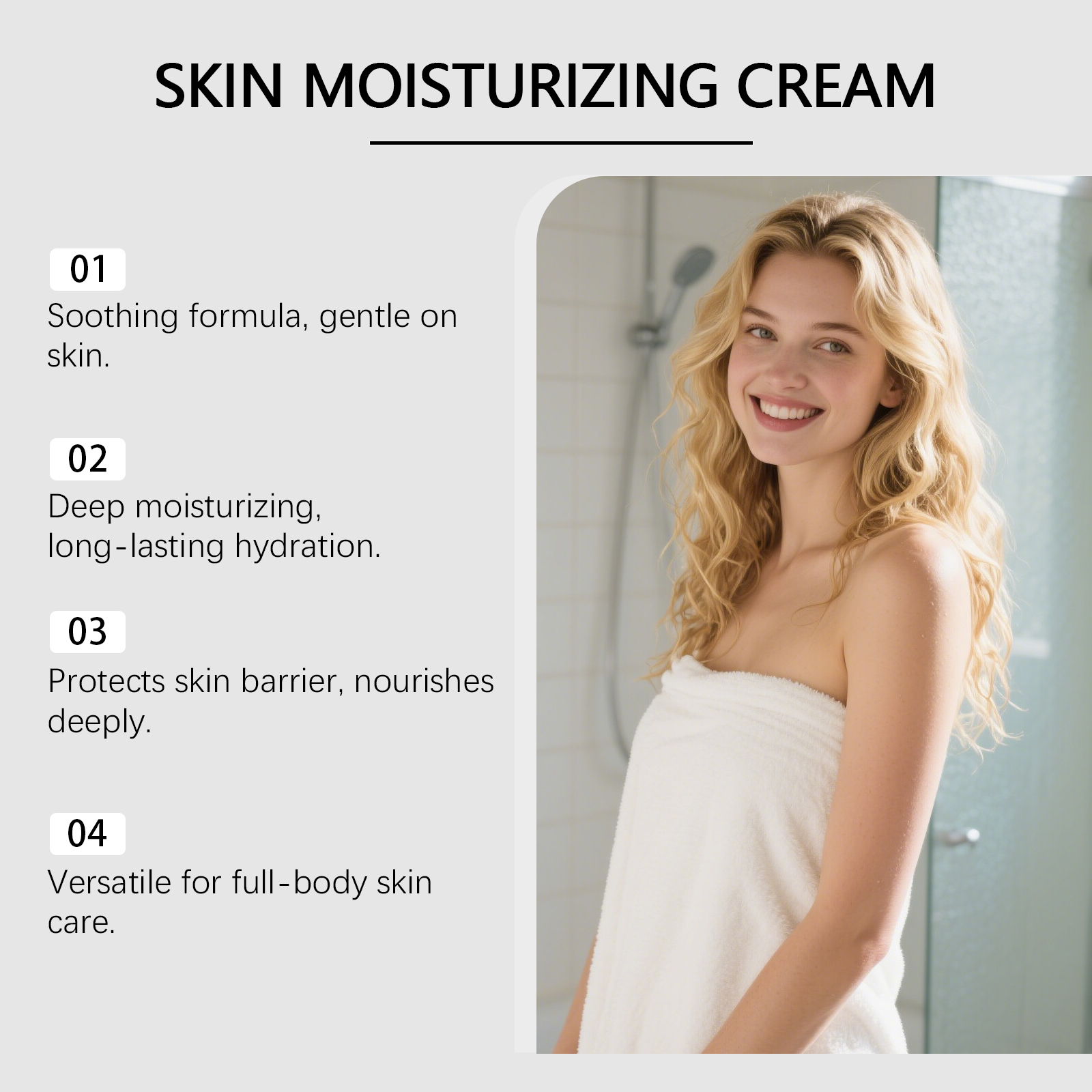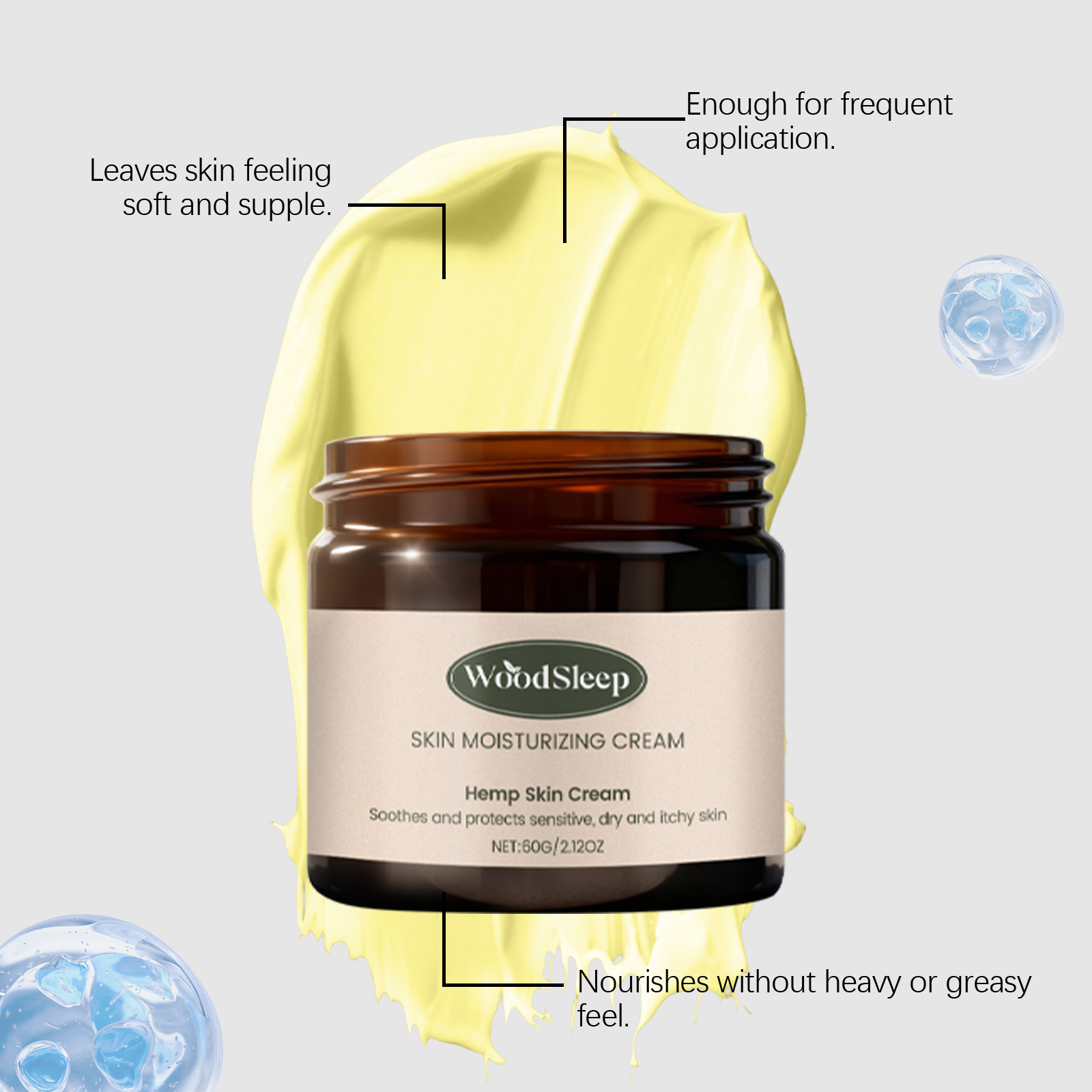 我们的肌肤滋润霜,由矿油、甘油精心调配而成。专为能够快速舒缓身体各处肌肤的刺激、皲裂和瘙痒设计。使用方法极为便捷:1.沐浴后,擦净身体水分,保持身体干燥。2.取适量本产品均匀涂抹在身体所需的肌肤位置上。3.轻轻按摩促进完全吸收。并且它可以滋润保湿的同时保护皮肤屏障,令肌肤不再干痒起屑。