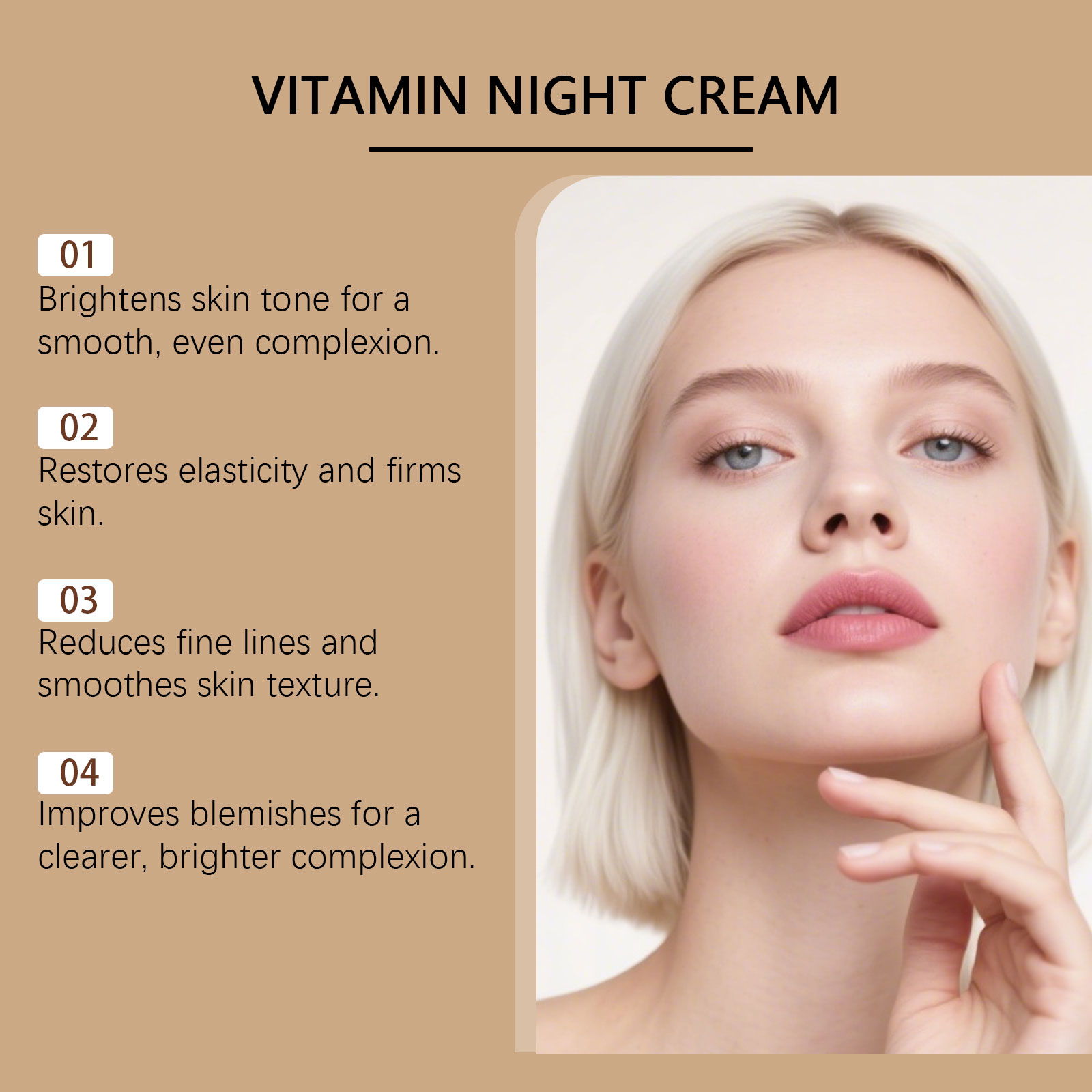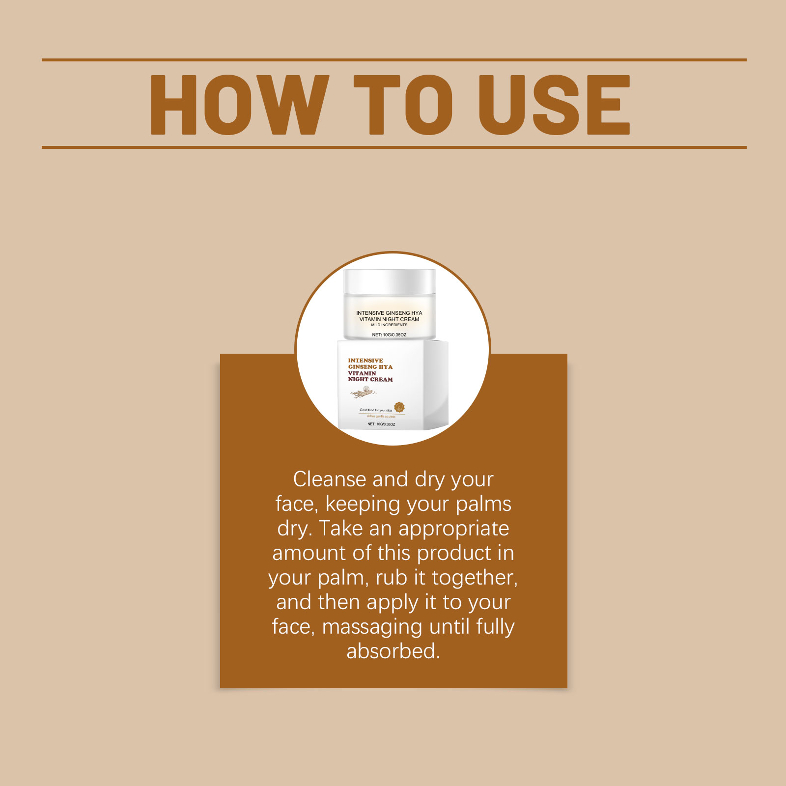 我们的维生素晚霜,由人参根提取物、透明质酸精心调配而成。专为减少暗沉,使肌肤焕发光泽、更加明亮设计。使用方法极为便捷:清洁并擦干面部,保持手掌干燥。取适量本产品于掌心,揉搓均匀后涂抹于面部,并按摩至完全吸收。并且可以增强皮肤紧致度,减少松弛,并保持皮肤活力。