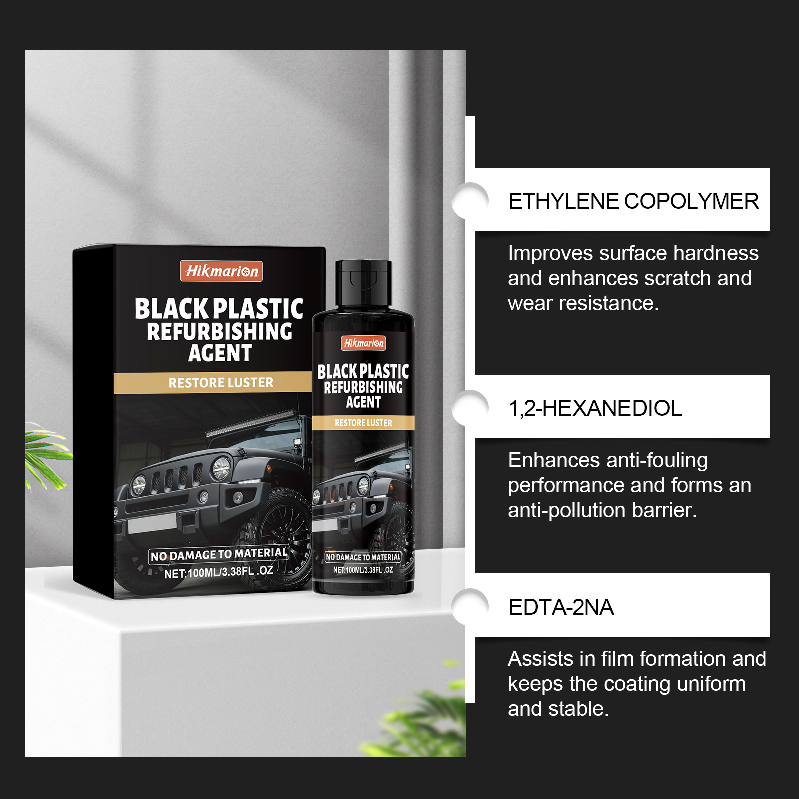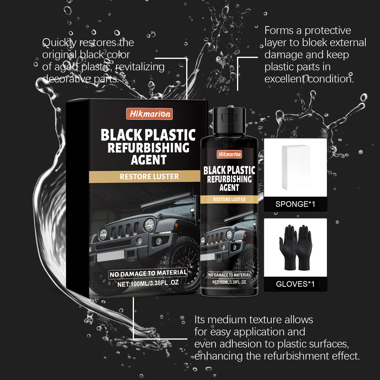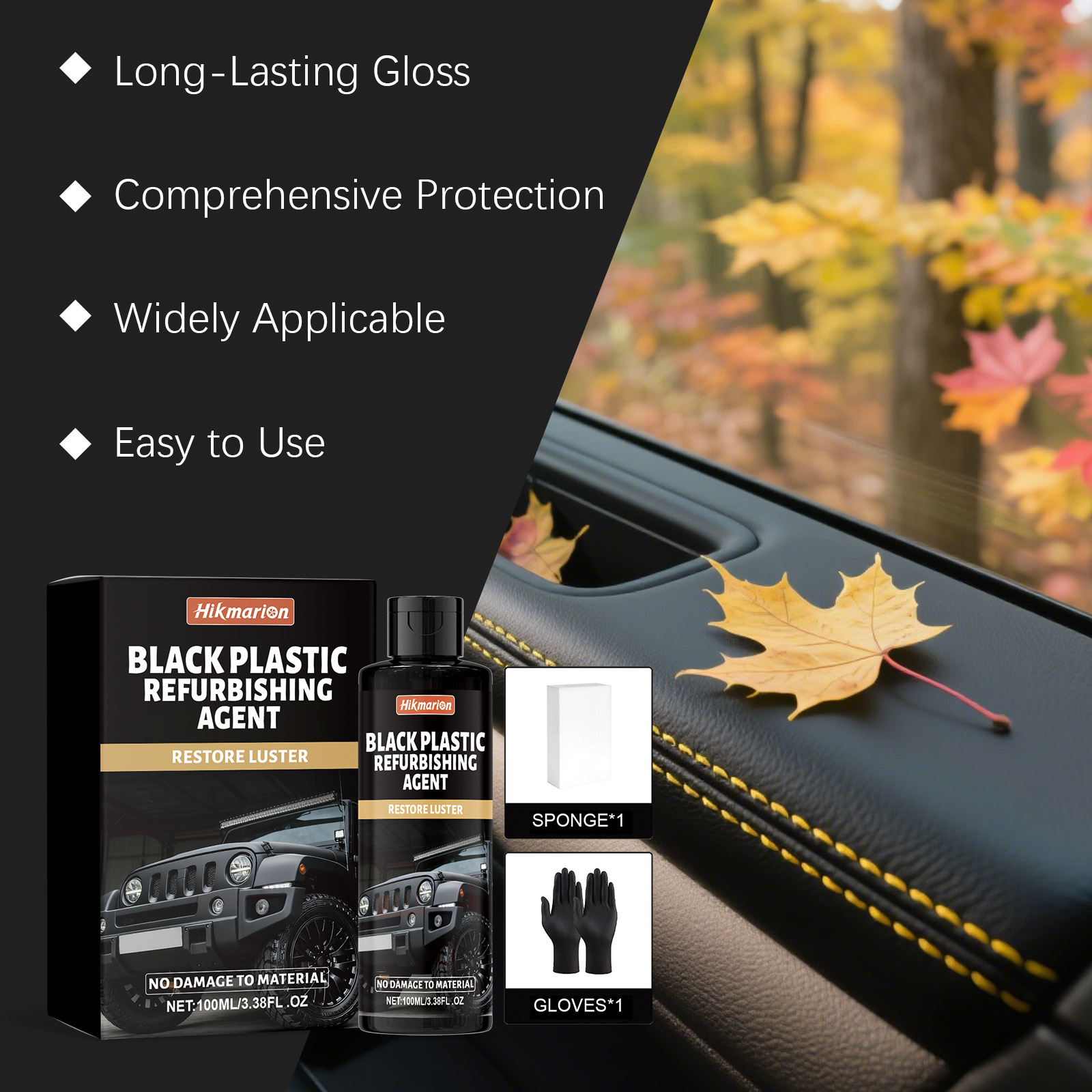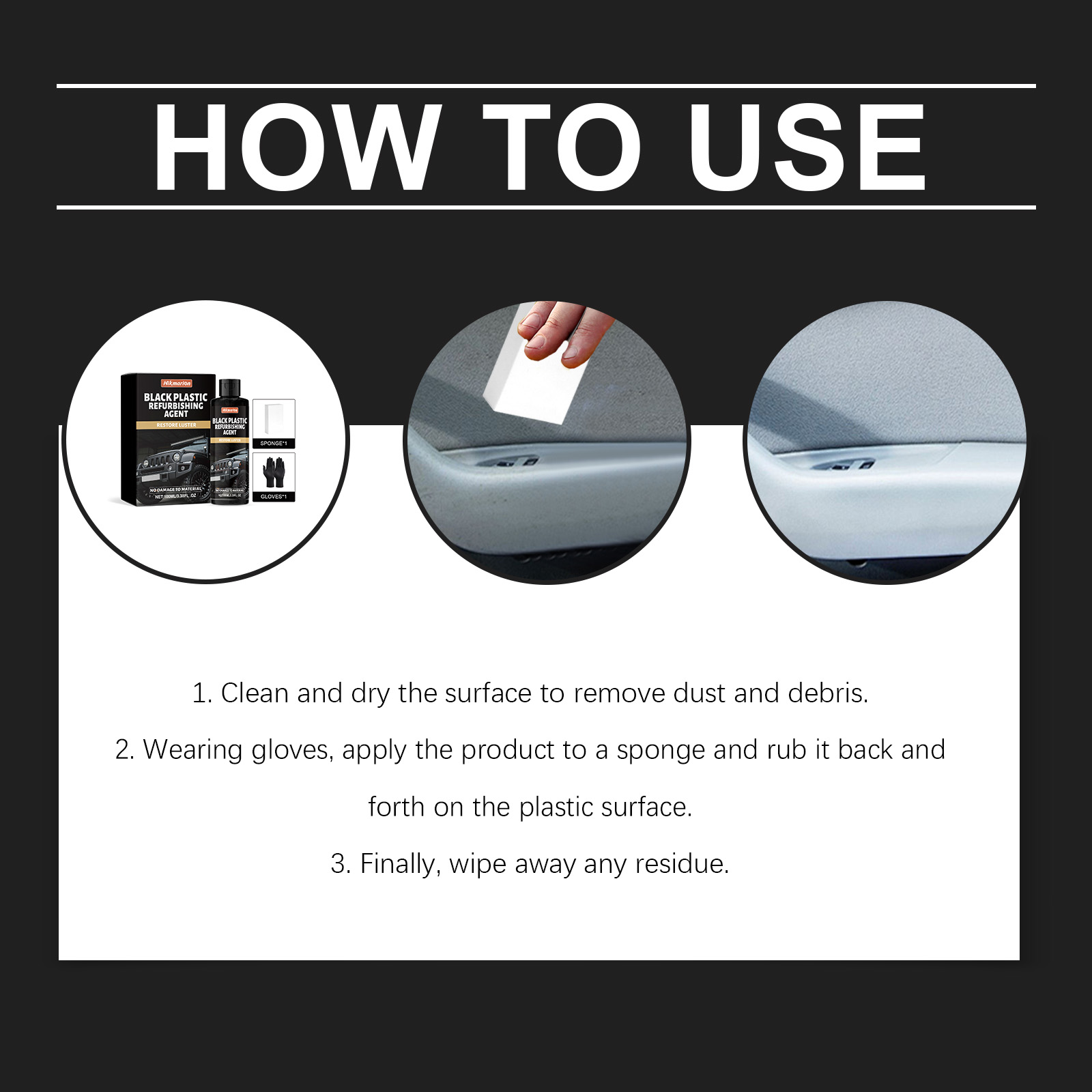 我们的汽车黑色塑料翻新剂,由乙烯共聚物 、1,2-己二醇精调配而成。专为恢复车辆塑料饰条的黑色表面,重现其光泽质感设计。使用方法极为便捷:1.清洁并擦干表面,以去除灰尘和碎屑。2.戴上手套,将产品涂抹在海绵上,并来回擦拭塑料表面。3.最后,擦去任何残留物。并且可以抵抗日常磨损,防止塑料老化和褪色,延长其使用寿命。