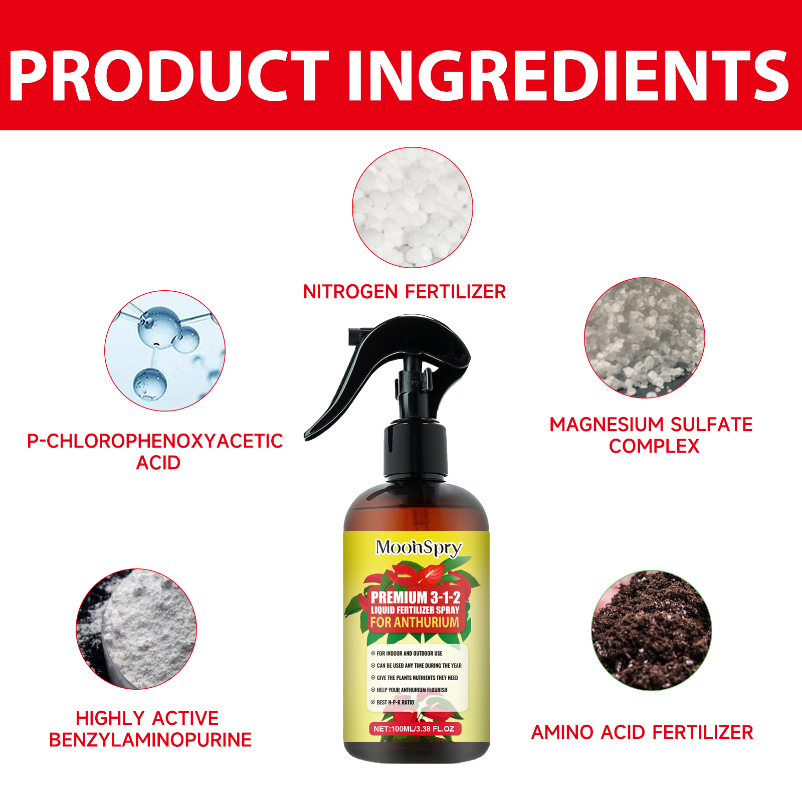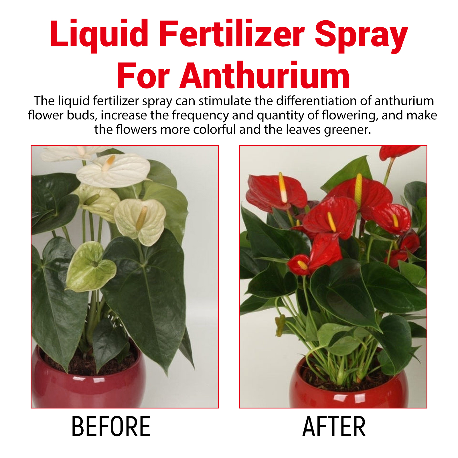 我们的红掌肥料喷雾含有高活性苄氨基嘌呤,硫酸镁配合物,对氯苯氧乙酸。它可以改善红掌土壤质地,提高土壤肥力和渗透性,刺激红掌花芽分化,提高开花频率和数量,使花更鲜艳,叶更绿。它的使用方法很简单:使用前摇匀,确保充分混合,将喷雾瓶放置在离叶子和茎大约12英寸的地方,均匀地喷洒溶液,确保完全覆盖。每周或每次浇水时使用本产品,以获得最佳效果,但要避免过度浇水。可以为其他植物提供稳定的营养,帮助它们更好地生长发育。