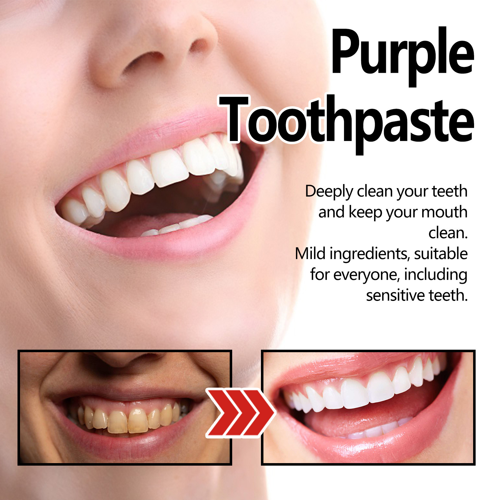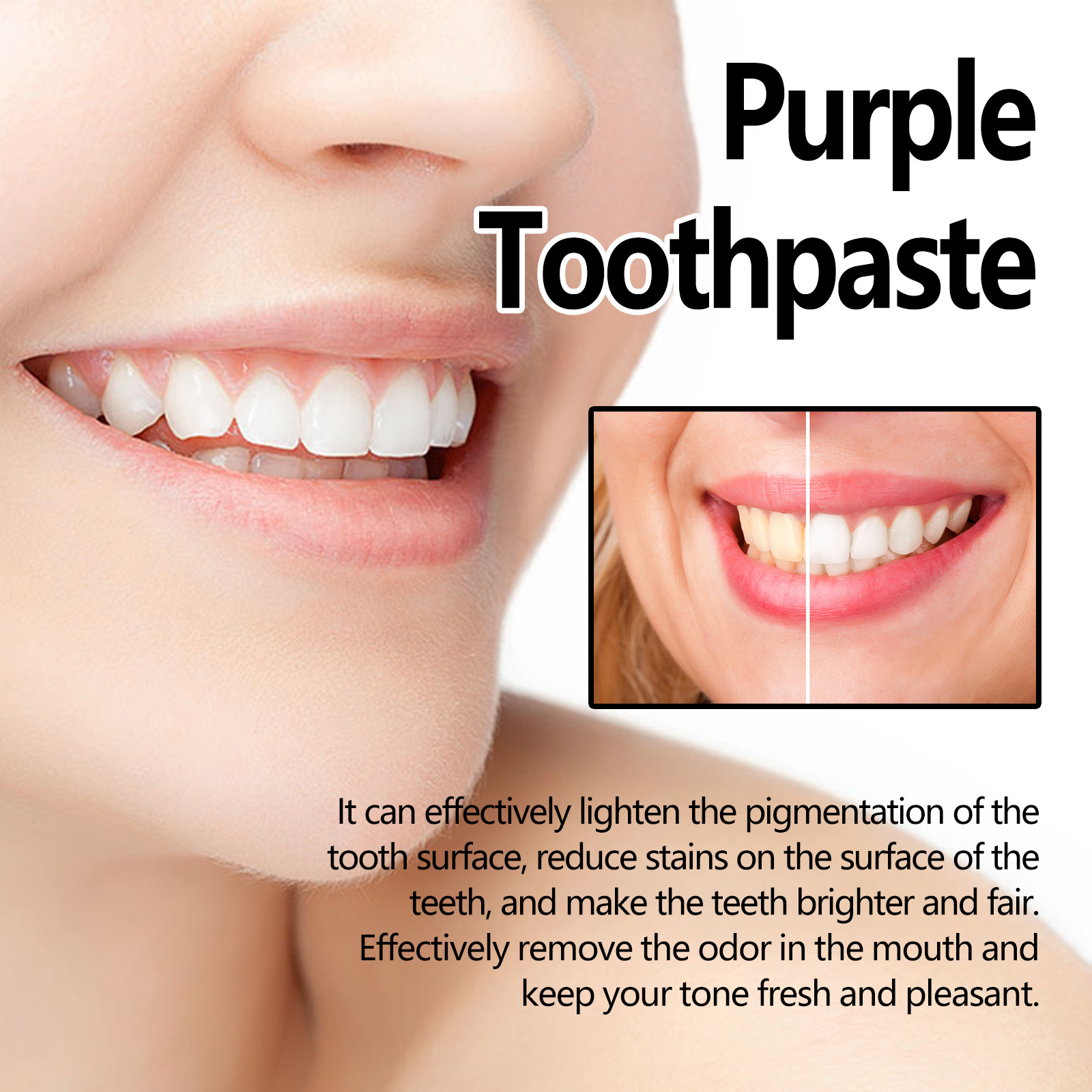 我们的紫色牙齿焕白牙膏含有甘油、聚甘油山梨醇、薄荷提取物。它可以深度清洁牙齿,保持口腔清洁,有效地减轻牙齿表面的色素沉着,减少牙齿表面的色斑,使牙齿更加明亮白皙。有效去除口腔异味,保持口气清新怡人。它的使用方法很简单:挤适量牙膏到牙刷上,用正确的方法刷2-3分钟,最后用清水漱口即可。可以能有效减轻牙齿表面的色素沉着,减少牙齿表面的色斑,使牙齿更亮更白。