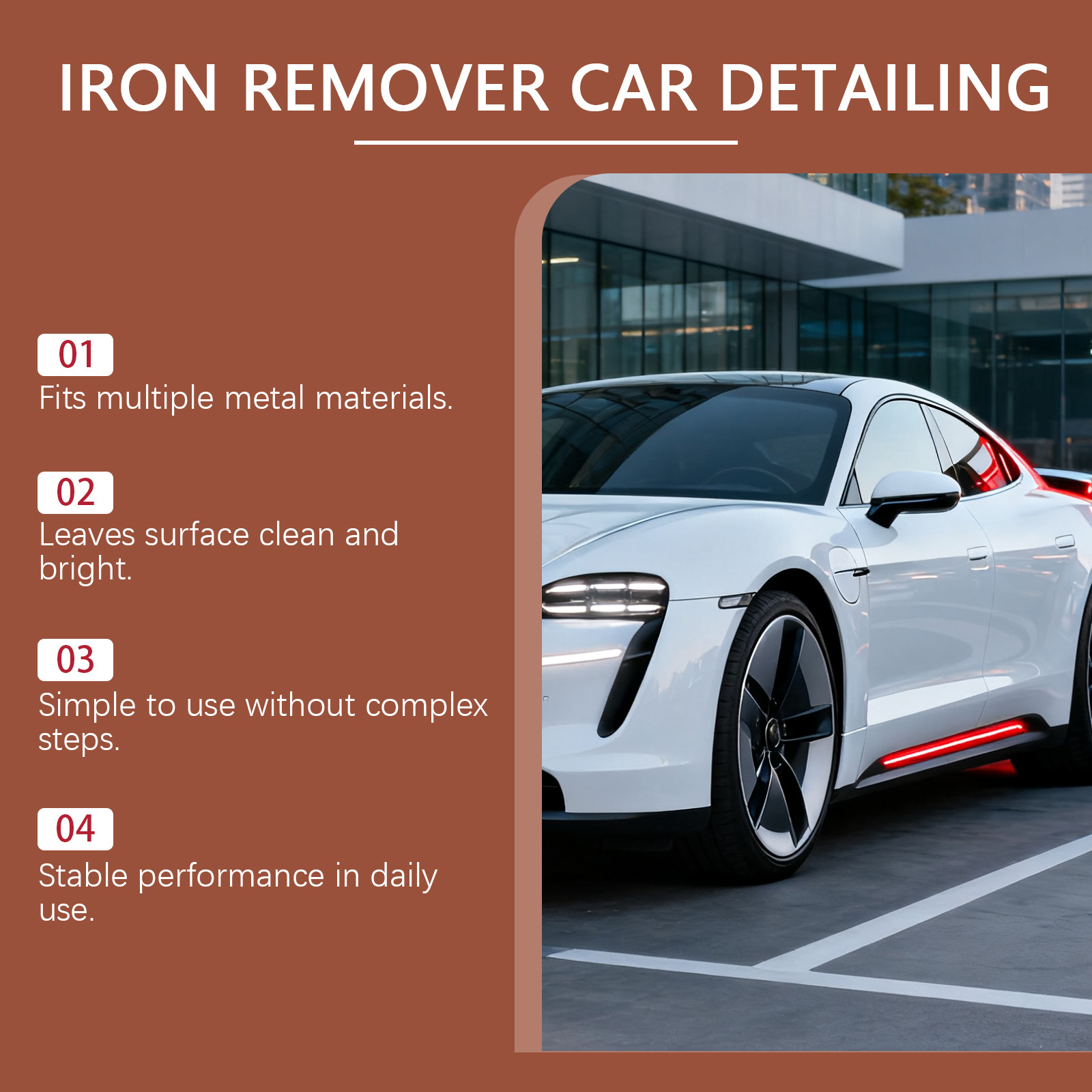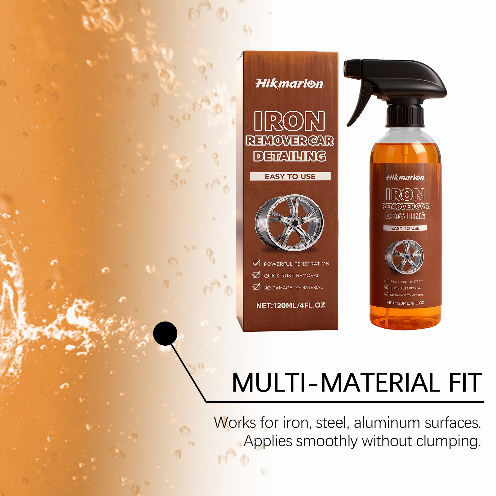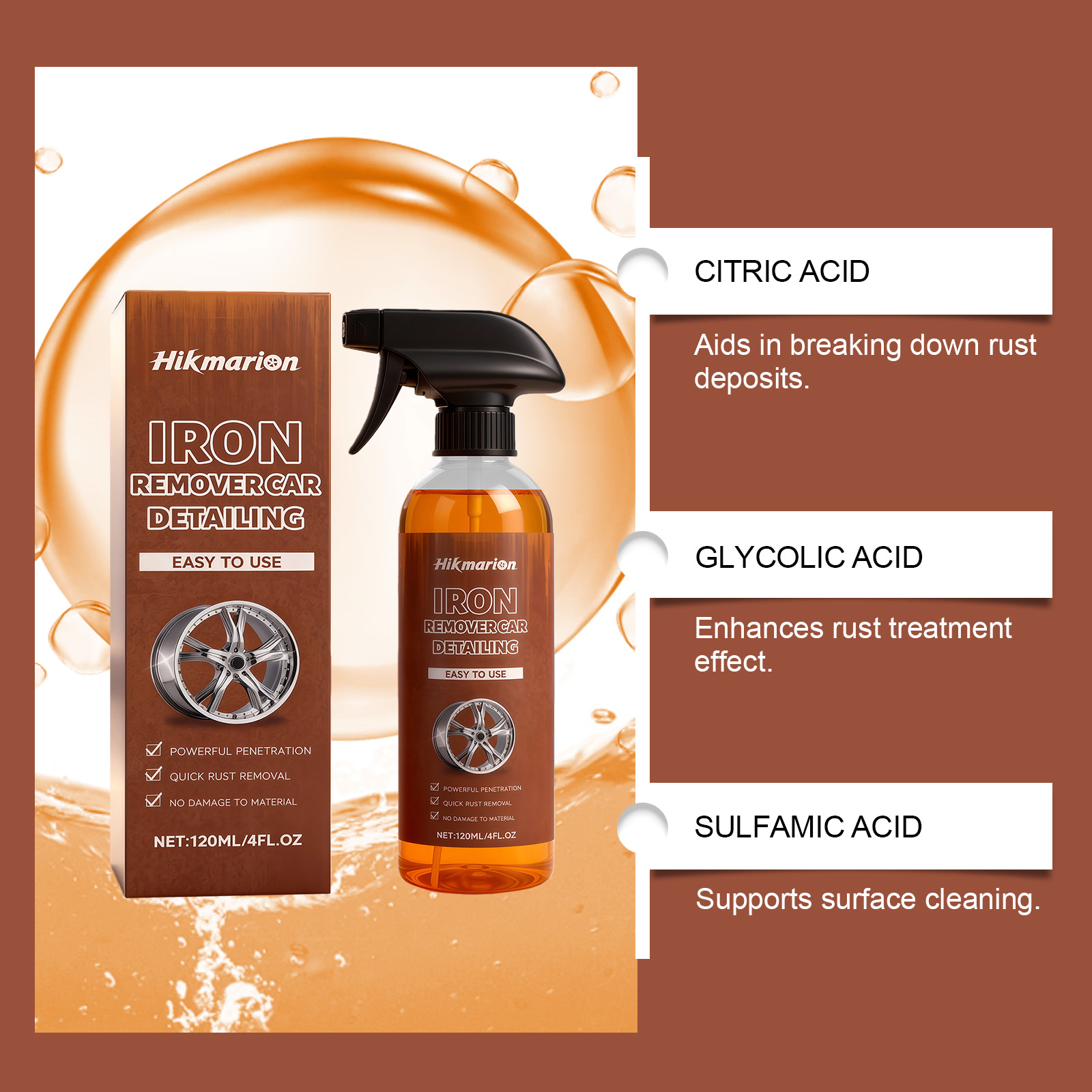我们的除锈喷雾,由羟基乙酸 、羟基乙叉二磷酸精心调配而成。专为有效分解锈迹沉积物设计。使用方法极为便捷:首先,清除车身上的灰尘或污垢。将产品喷洒在漆面。用毛巾或海绵擦拭。再用清水彻底冲洗干净。并且可以彻底清洁金属表面。