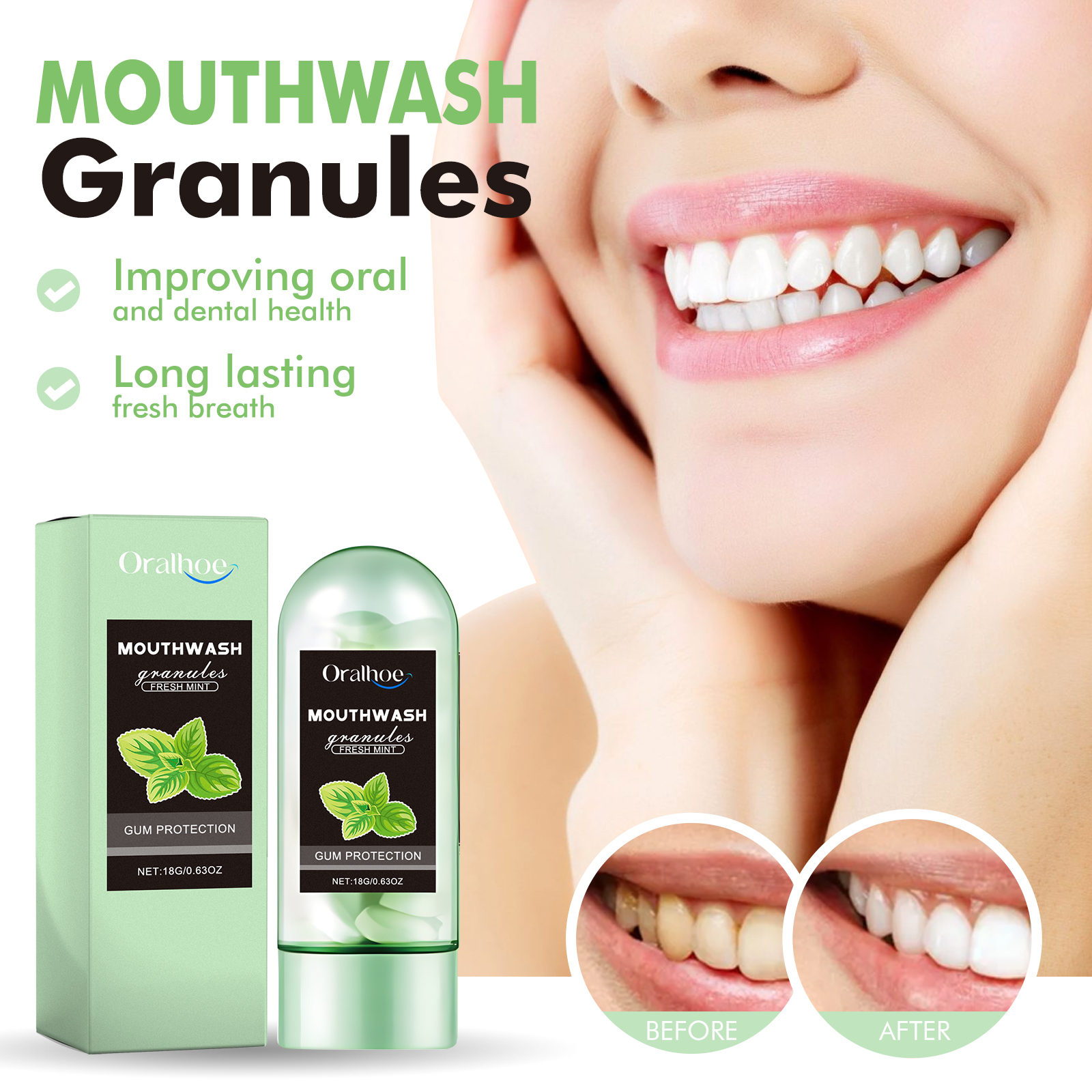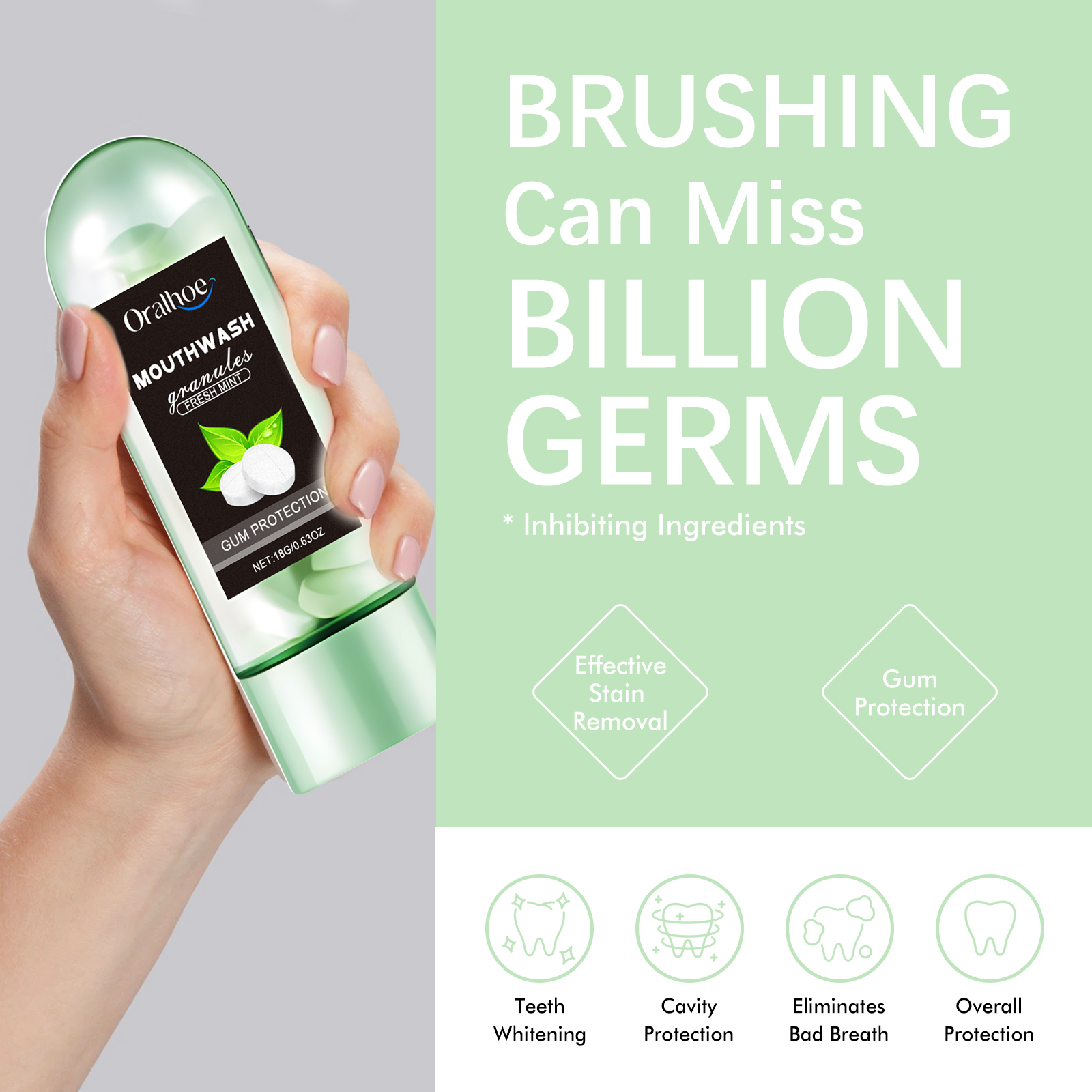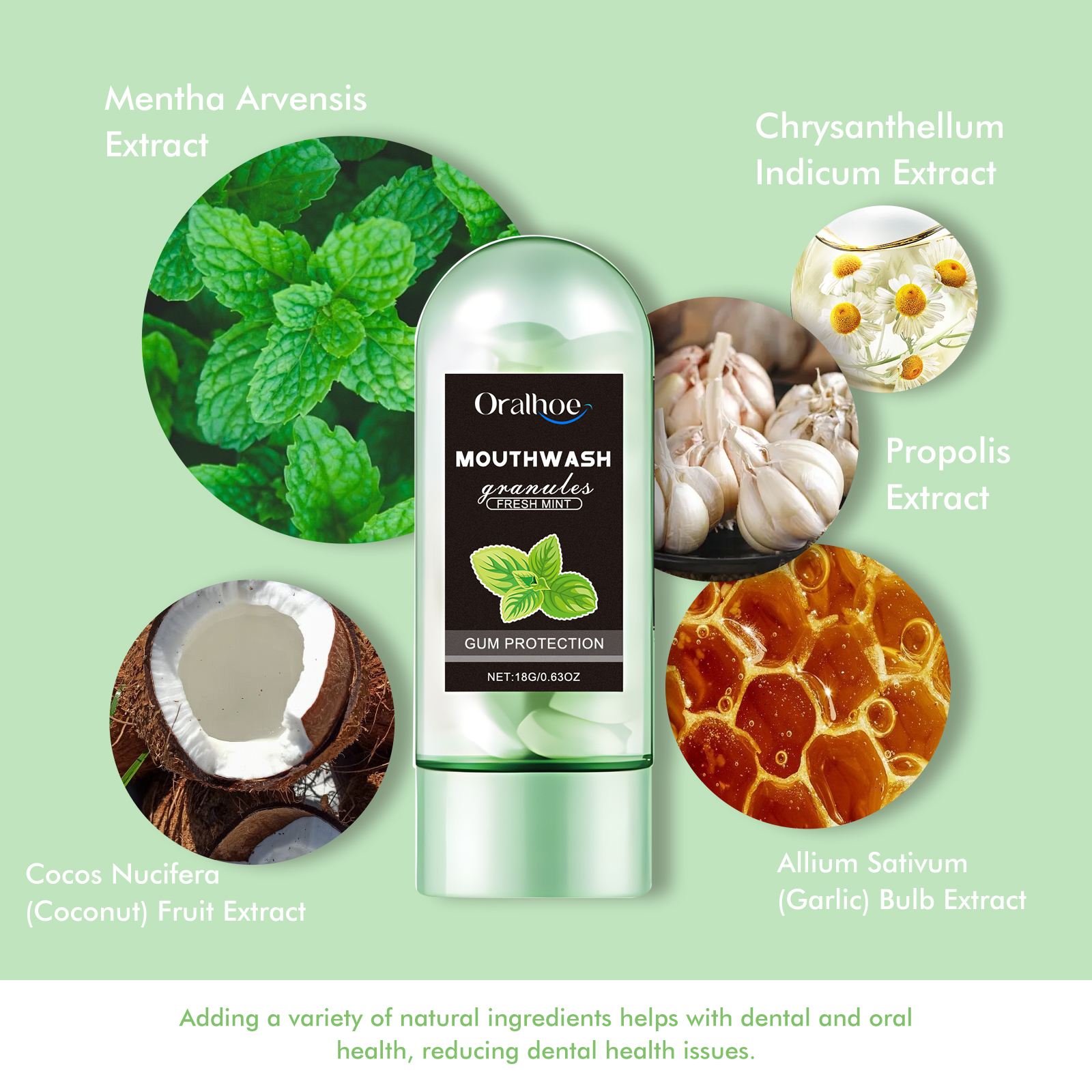 我们的薄荷味洁牙漱口粒含有薄荷提取物、大蒜提取物、蜂胶提取物。它可以清除牙菌斑和顽固牙石,恢复牙齿洁白和健康,缓解口腔溃疡引起的不适,促进溃疡愈合,减轻疼痛。它的使用方法很简单:当您需要清洁口腔时,服用1~2片,咀嚼直至泡沫充满口腔,用牙刷清洁牙齿,清洁口腔后吐出泡沫,最后用清水漱口即可。有助于牙齿和口腔健康,减少牙齿健康问题。