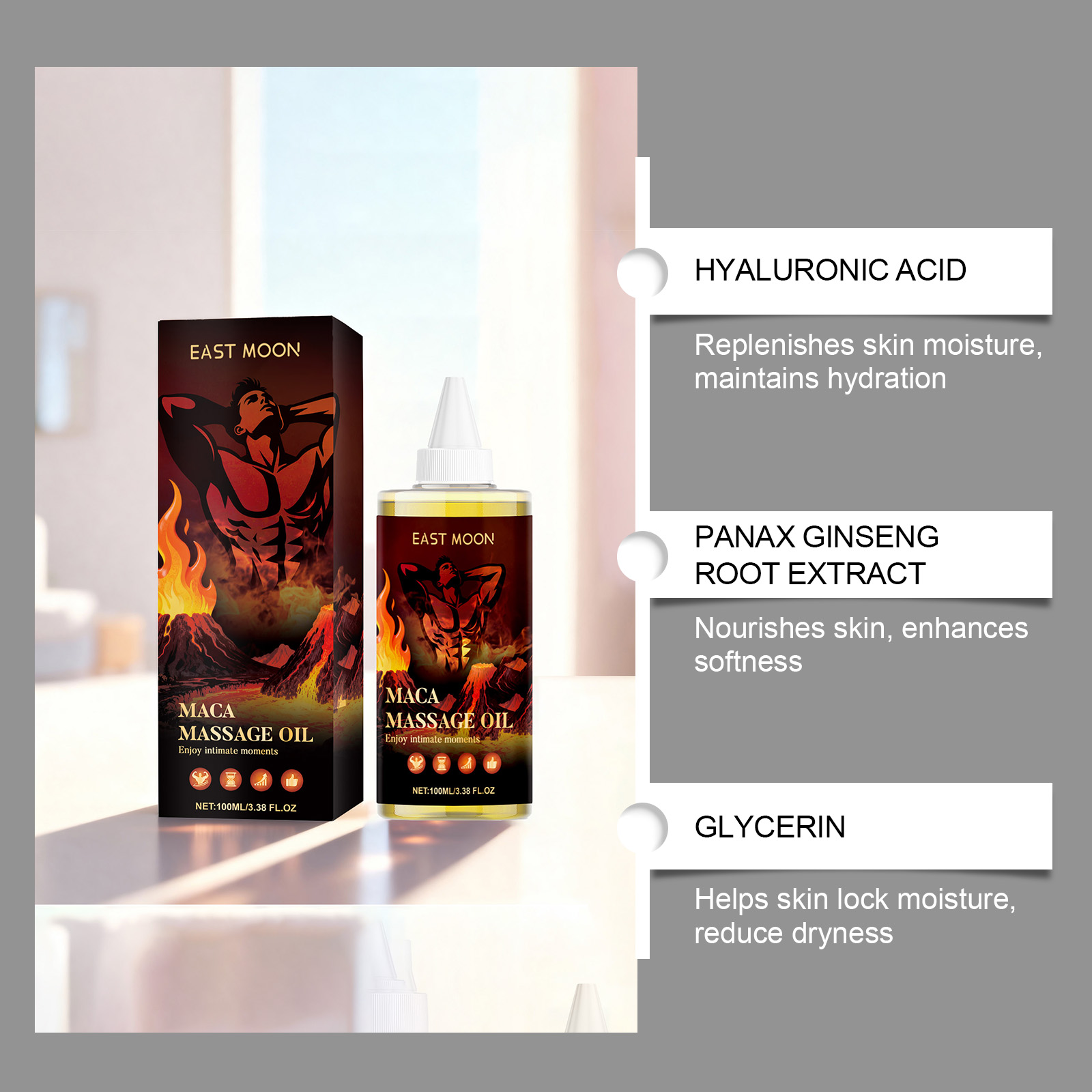 我们的玛卡按摩精油,由甘油、1,2-己二醇精心调配而成。专为提升亲密时光,温暖心情设计。使用方法极为便捷:清洁并擦干皮肤。将适量本产品均匀涂抹于皮肤表面,轻轻以打圈的方式按摩,直至吸收。并且可以保持皮肤光滑。