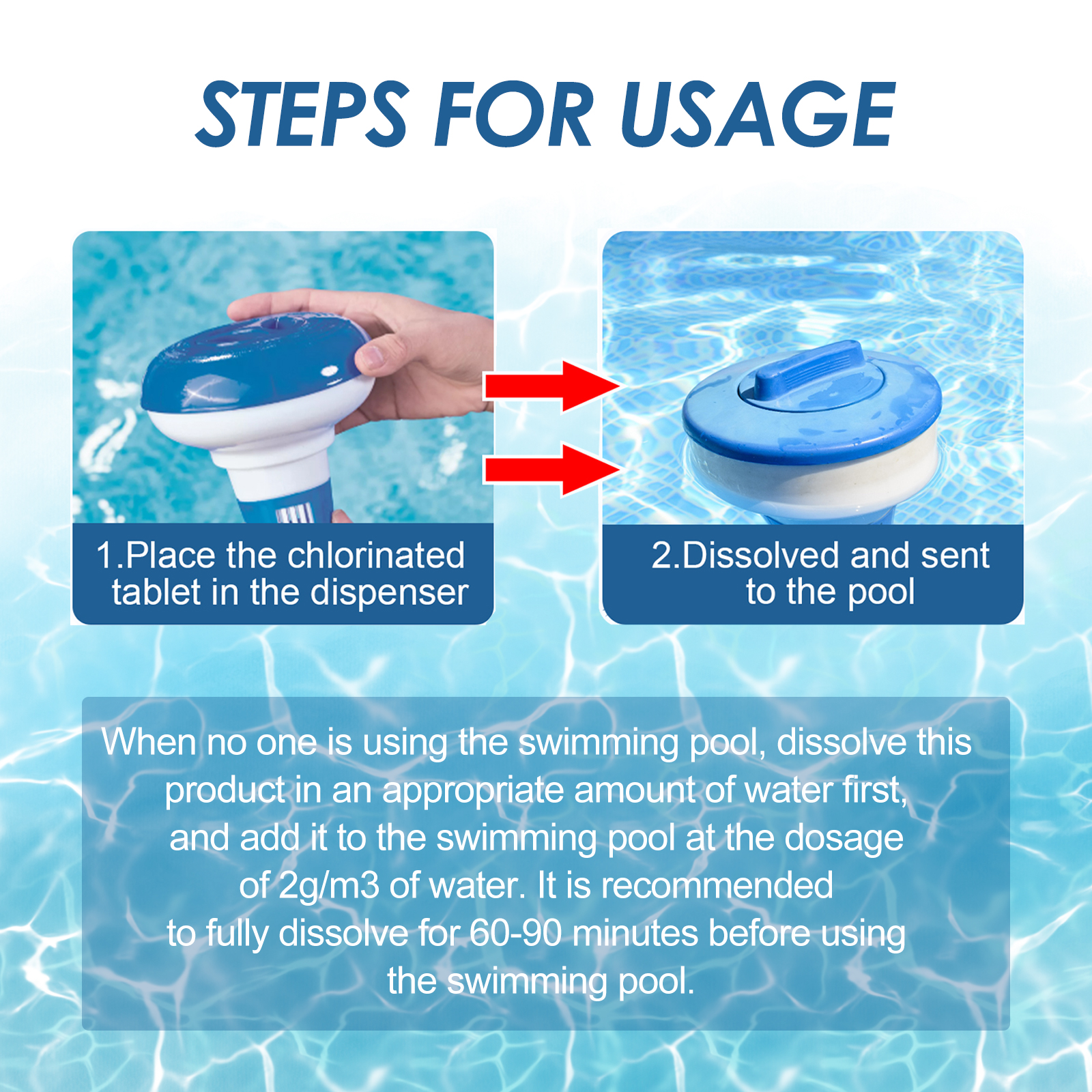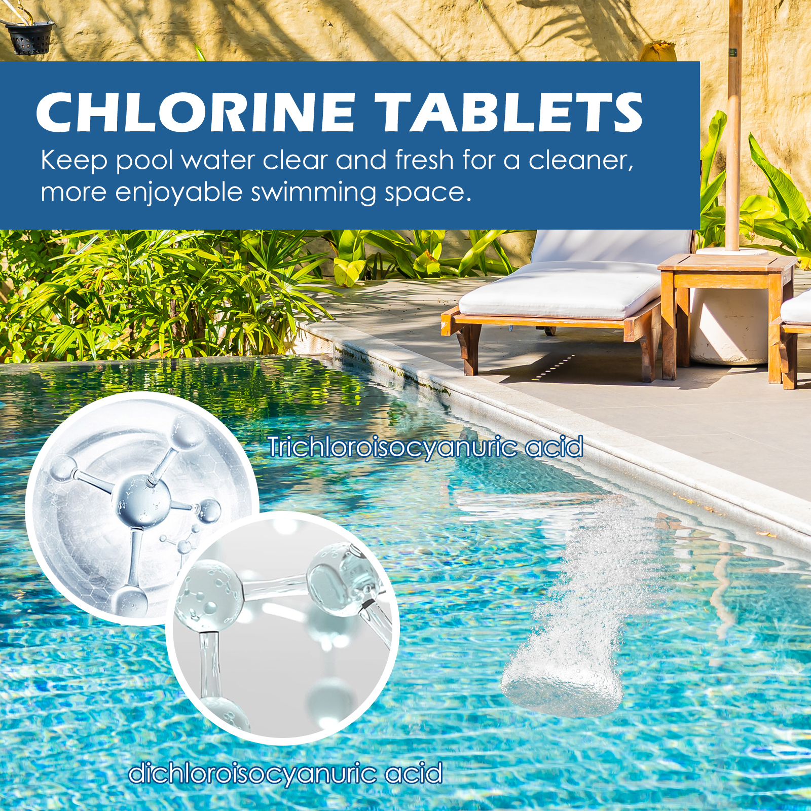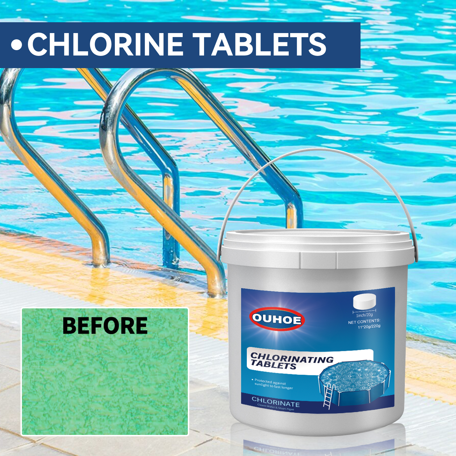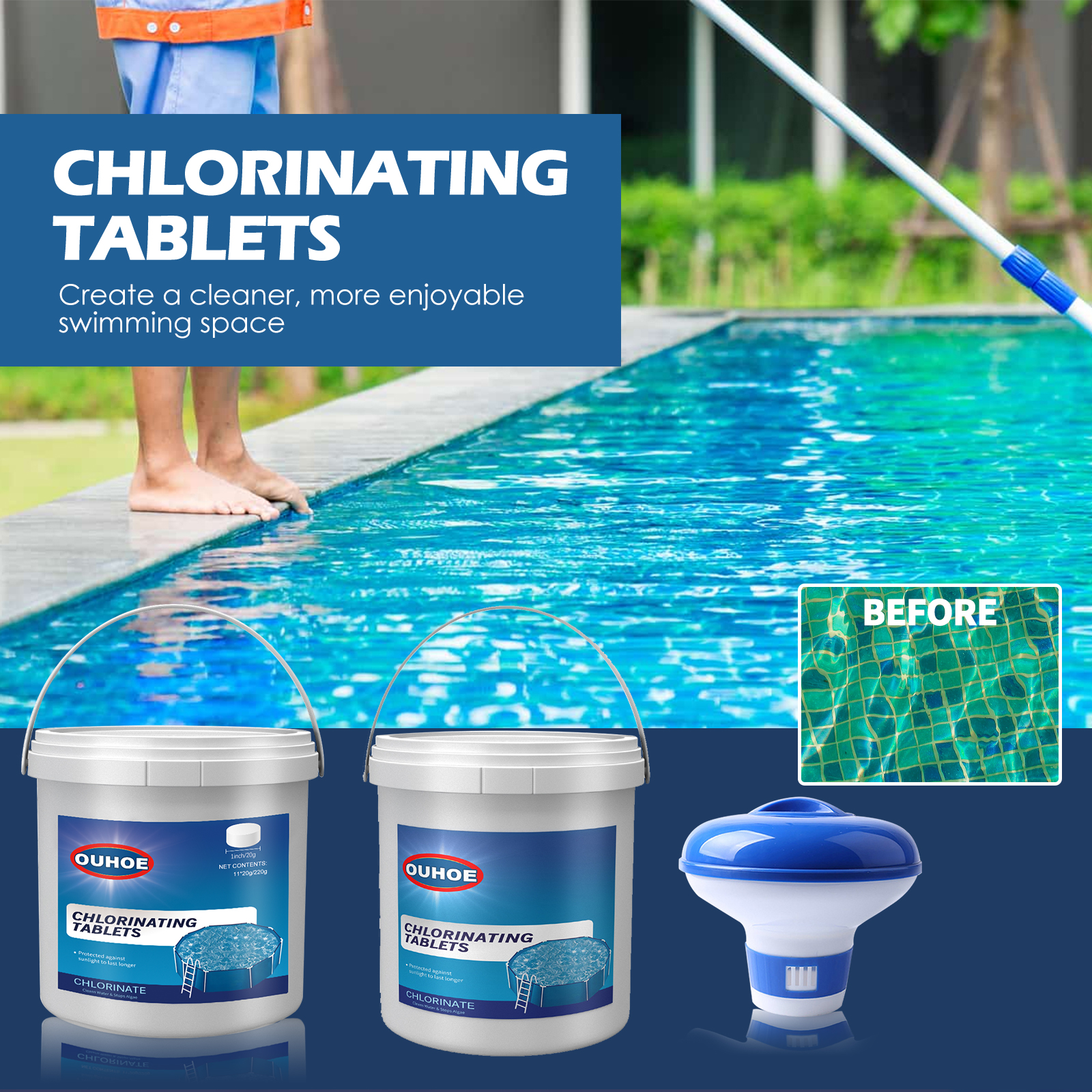 我们的泳池清洁泡腾片(300pcs)含有十二烷基苯磺酸钠、EDTA 二钠、香精。它可以保持泳池水的清洁和新鲜,更愉快的游泳空间。它的使用方法很简单:将氯化药片放入分配器中,溶解后被送到水池里。并且可以澄清水质。