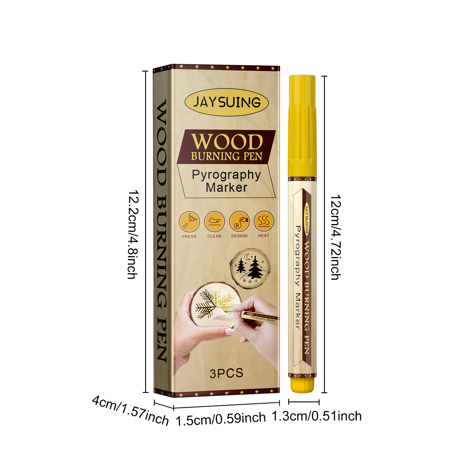 我们的燃烧标记笔含有热敏感颜料、溶剂。它可以应用于各种表面,非常适合diy项目。它的使用方法很简单:用砂纸把木头表面磨光滑, 使用前摇匀本品,调整纸上水分, 使用本品在木材表面绘制图案,用热风枪加热图案,使其显示烧伤痕迹。并且可以燃烧烙画。
