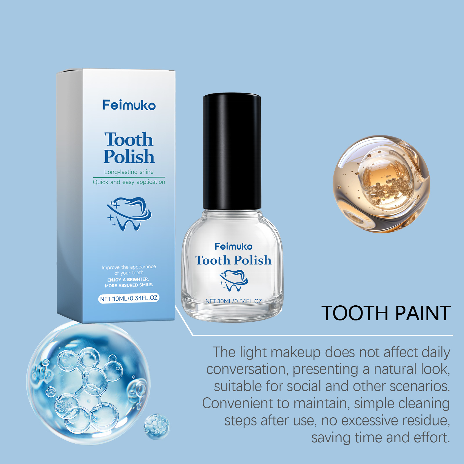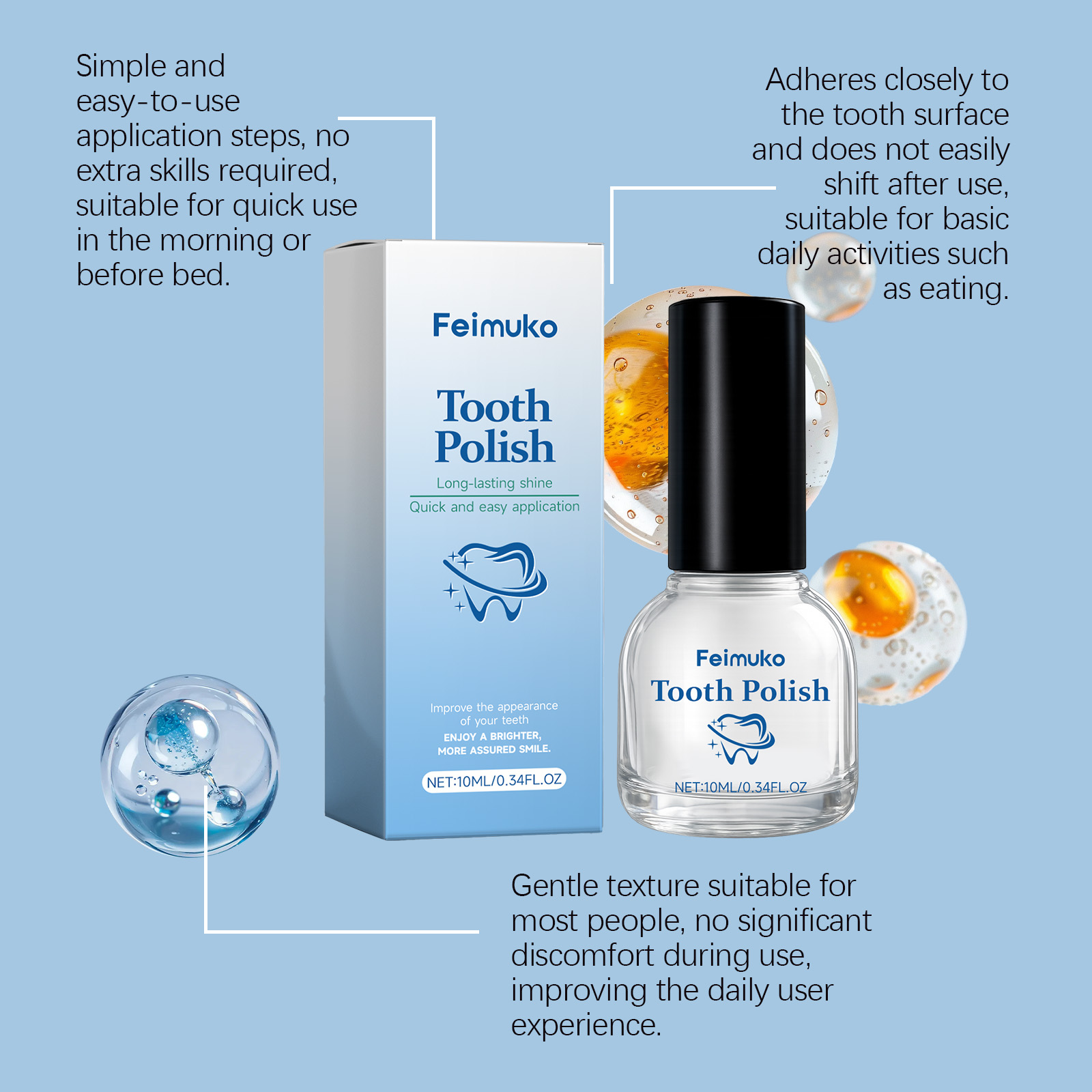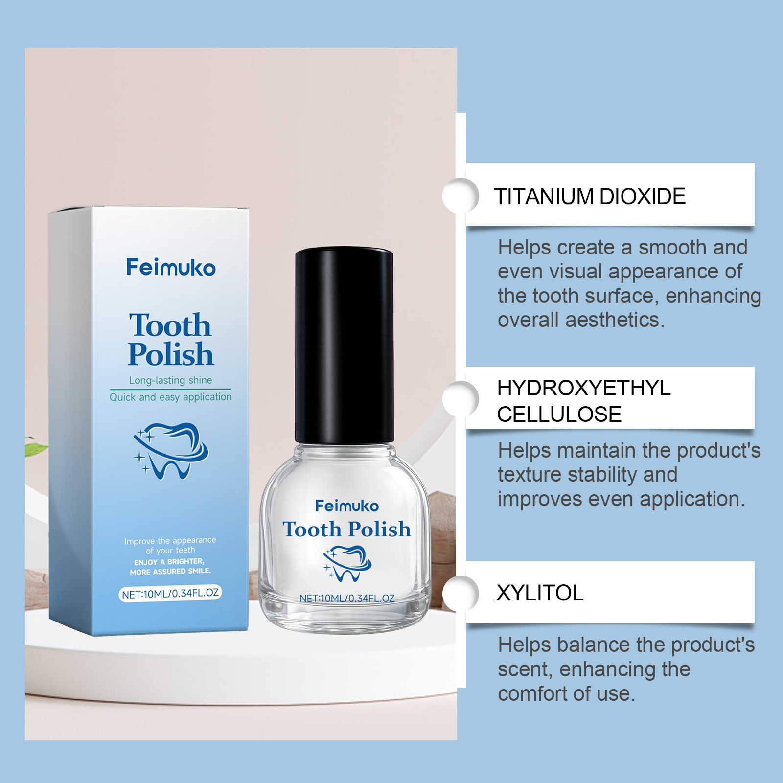 我们的牙齿清洁漆,由山梨酸钾、二氧化钛精心调配而成。专为创造牙齿表面光滑均匀的视觉效果,提升整体美观度设计。使用方法极为便捷:1.清洁牙齿表面并保持干燥。2.将本产品均匀涂抹于牙齿表面,每颗牙涂1-3次,每次间隔10秒,并让其自然风干。并且可以平衡产品的气味,提升使用舒适度。