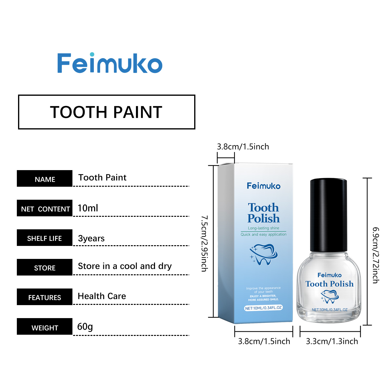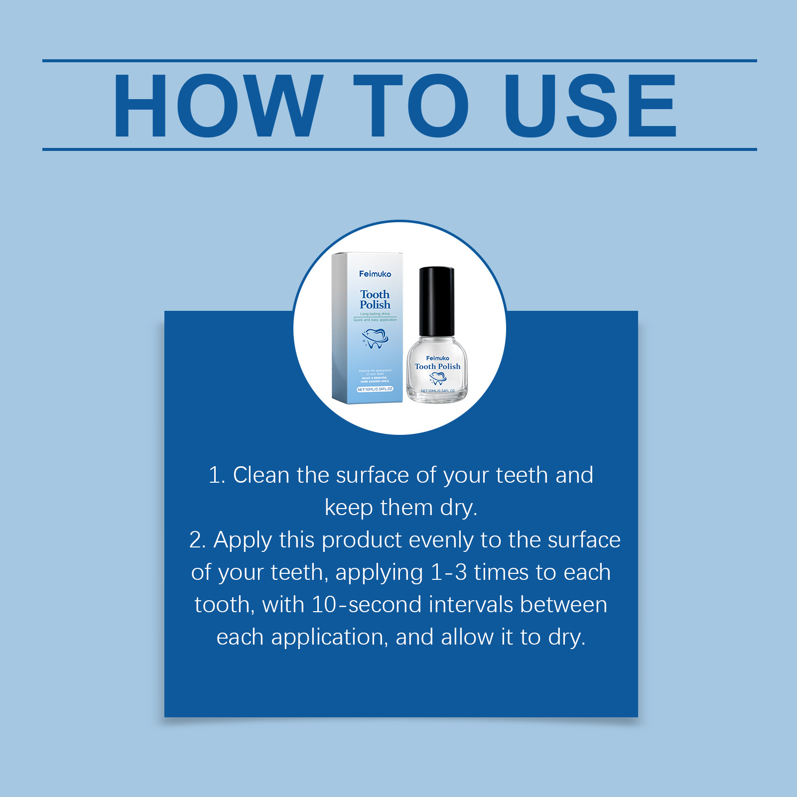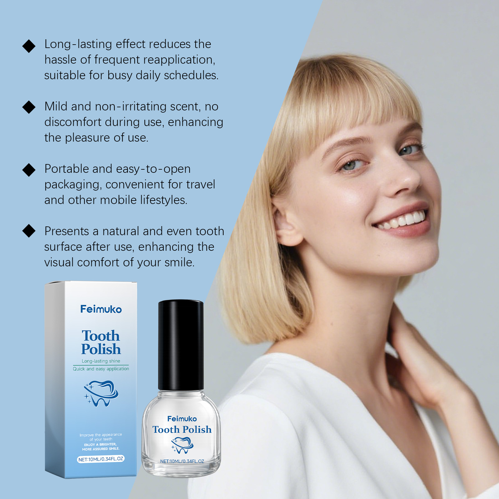 我们的牙齿清洁漆,由山梨酸钾、二氧化钛精心调配而成。专为创造牙齿表面光滑均匀的视觉效果,提升整体美观度设计。使用方法极为便捷:1.清洁牙齿表面并保持干燥。2.将本产品均匀涂抹于牙齿表面,每颗牙涂1-3次,每次间隔10秒,并让其自然风干。并且可以平衡产品的气味,提升使用舒适度。