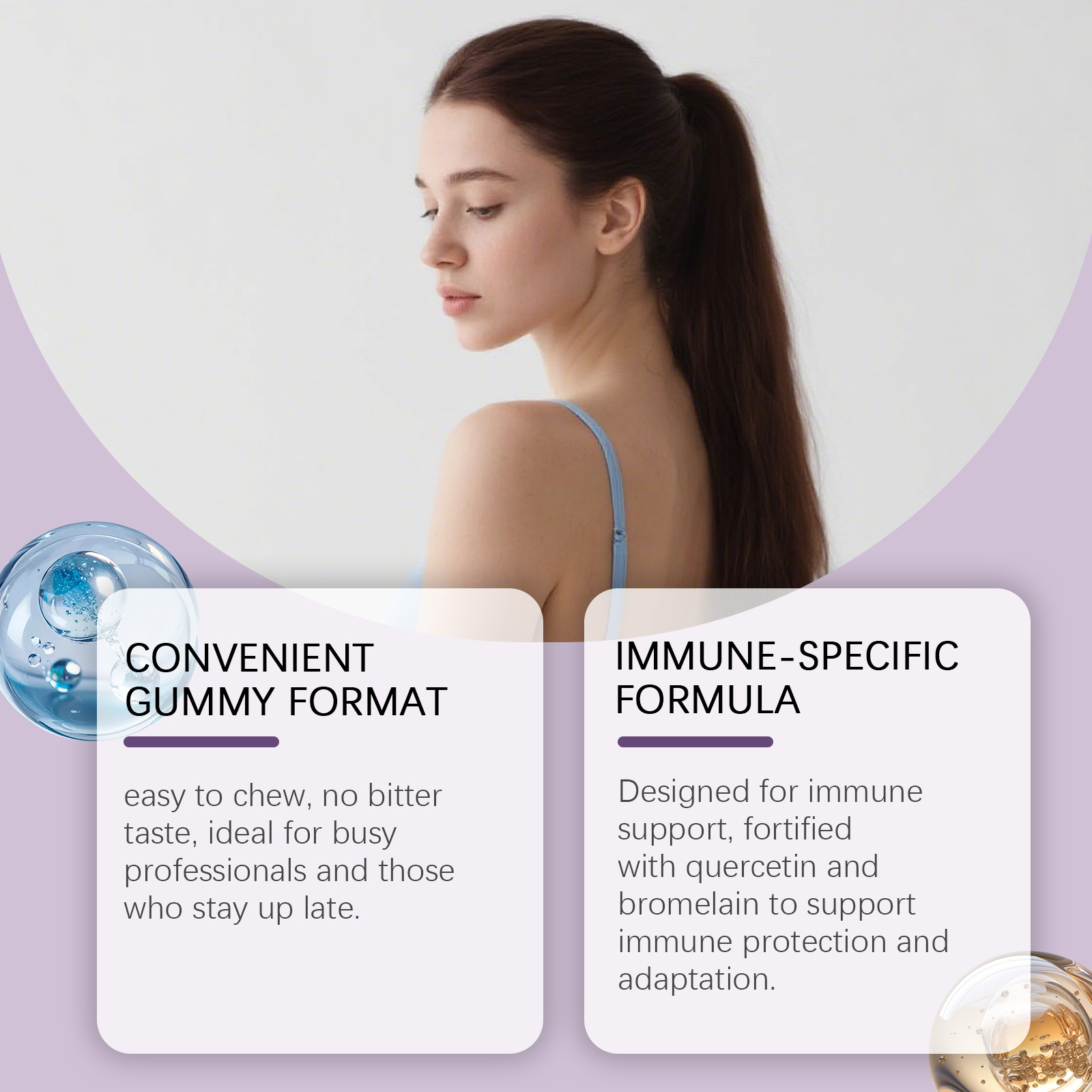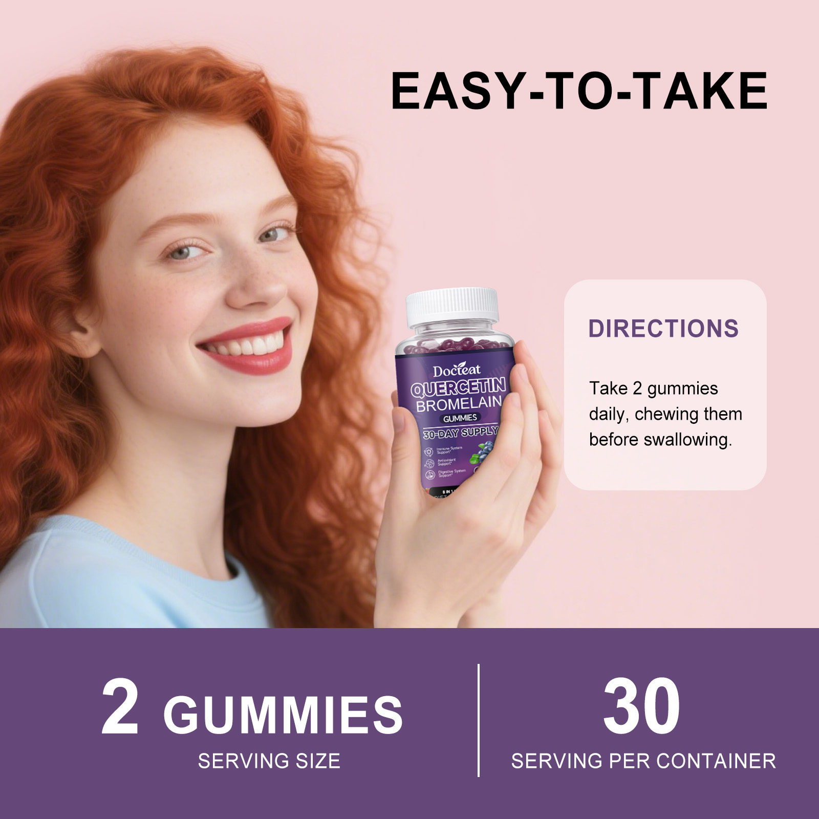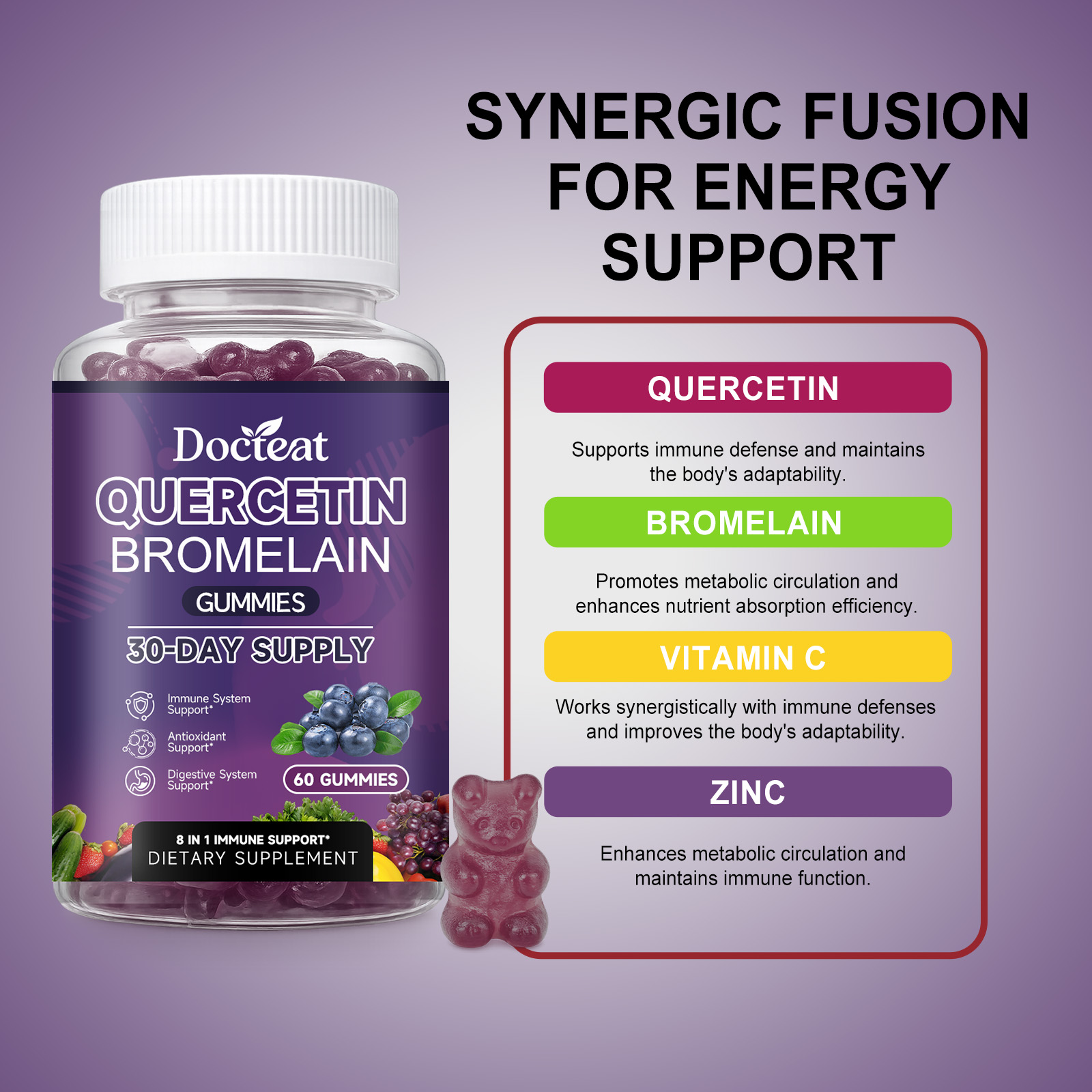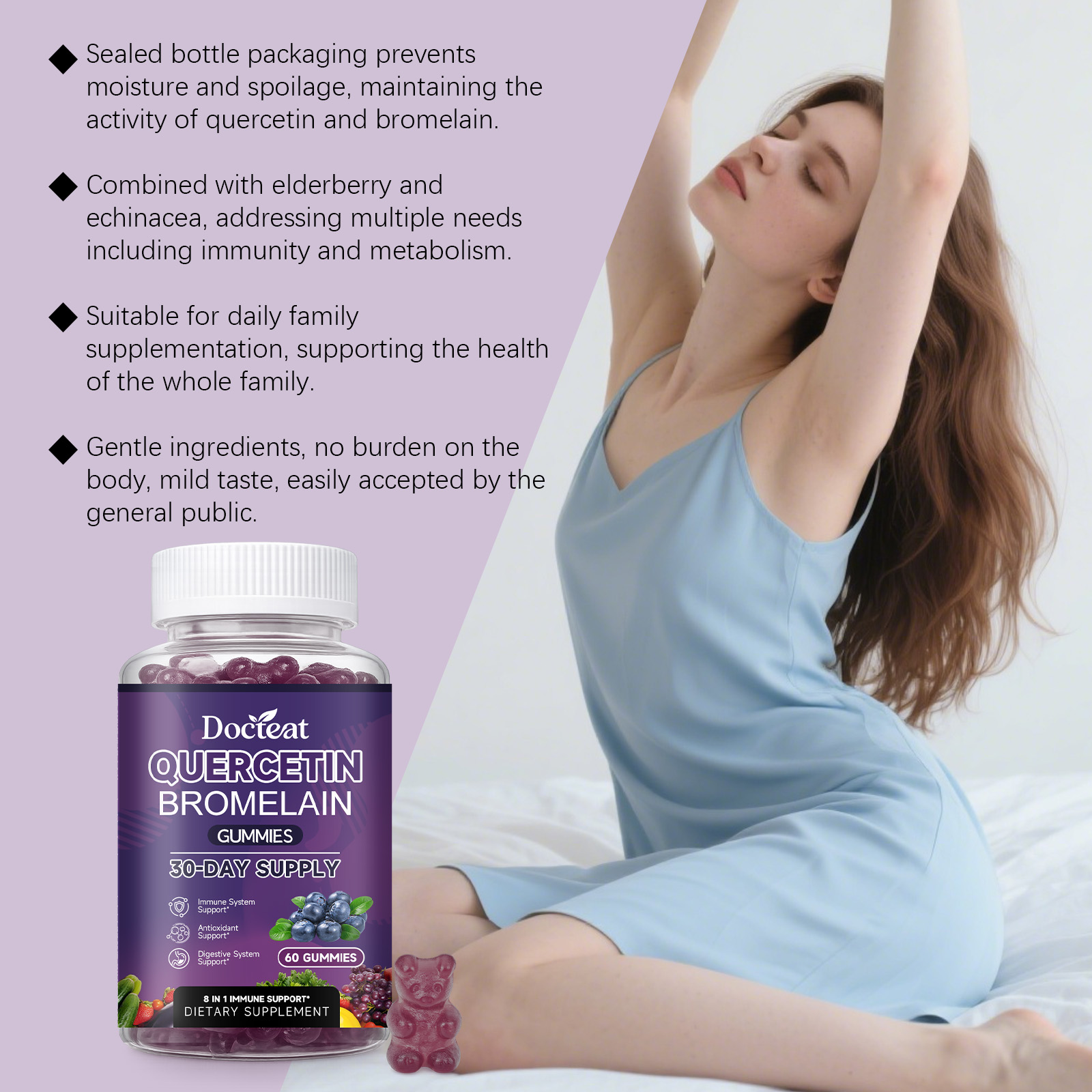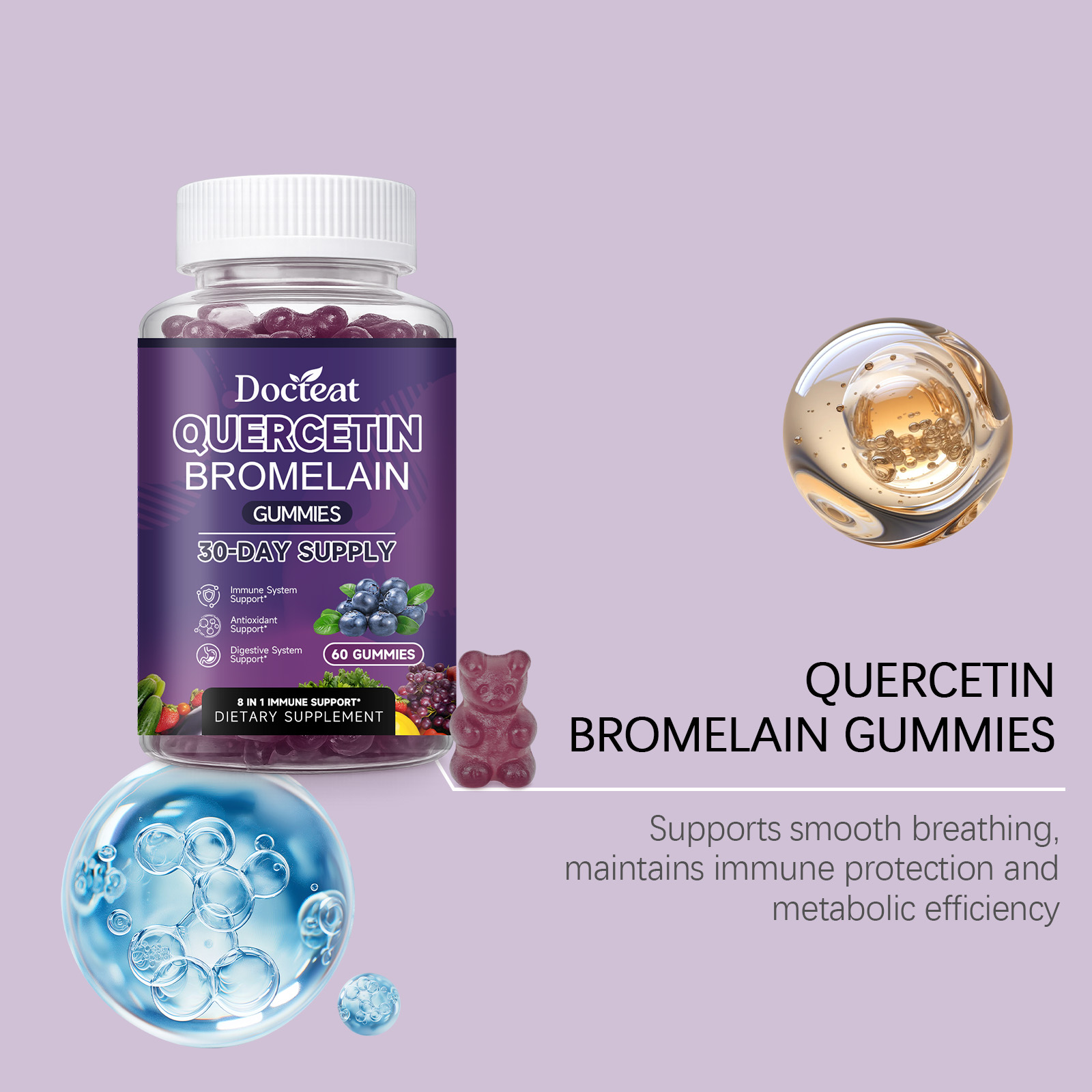 我们的槲皮素菠萝蛋白酶软糖,由维生素C、维生素K2精心调配而成。专为维持免疫,防护状态,心脏健康,提升认知设计。使用方法极为便捷:每日服用 2 颗软糖,服用前先咀嚼,然后吞咽。并且它可以促进代谢,提升活力,支持消化,促进吸收。