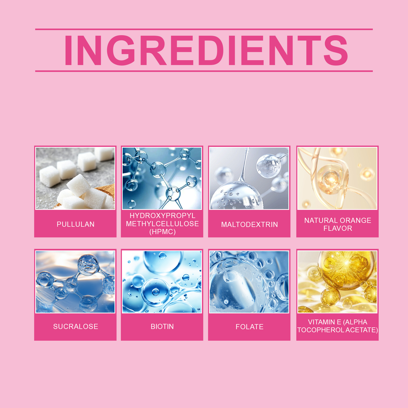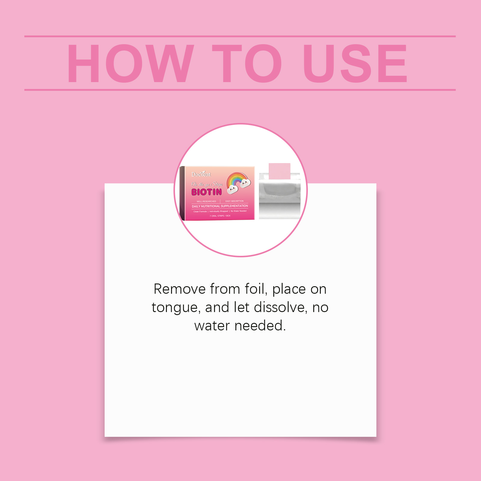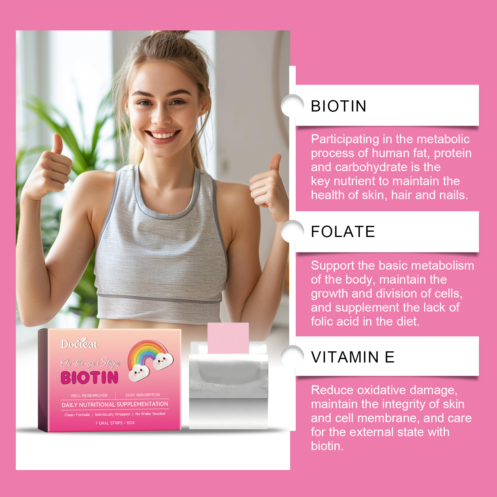 我们的生物素便携速溶片,由普鲁兰多糖、羟丙基甲基纤维素精心调配而成。专为参与人体脂肪、蛋白质和碳水化合物的代谢过程,是维持皮肤、头发和指甲健康的关键营养素设计。使用方法极为便捷:从锡纸中取出,放在舌头上,使其溶解——无需加水。并且它可以支持身体的基本代谢,维持细胞的生长和分裂,并补充饮食中缺乏的叶酸。