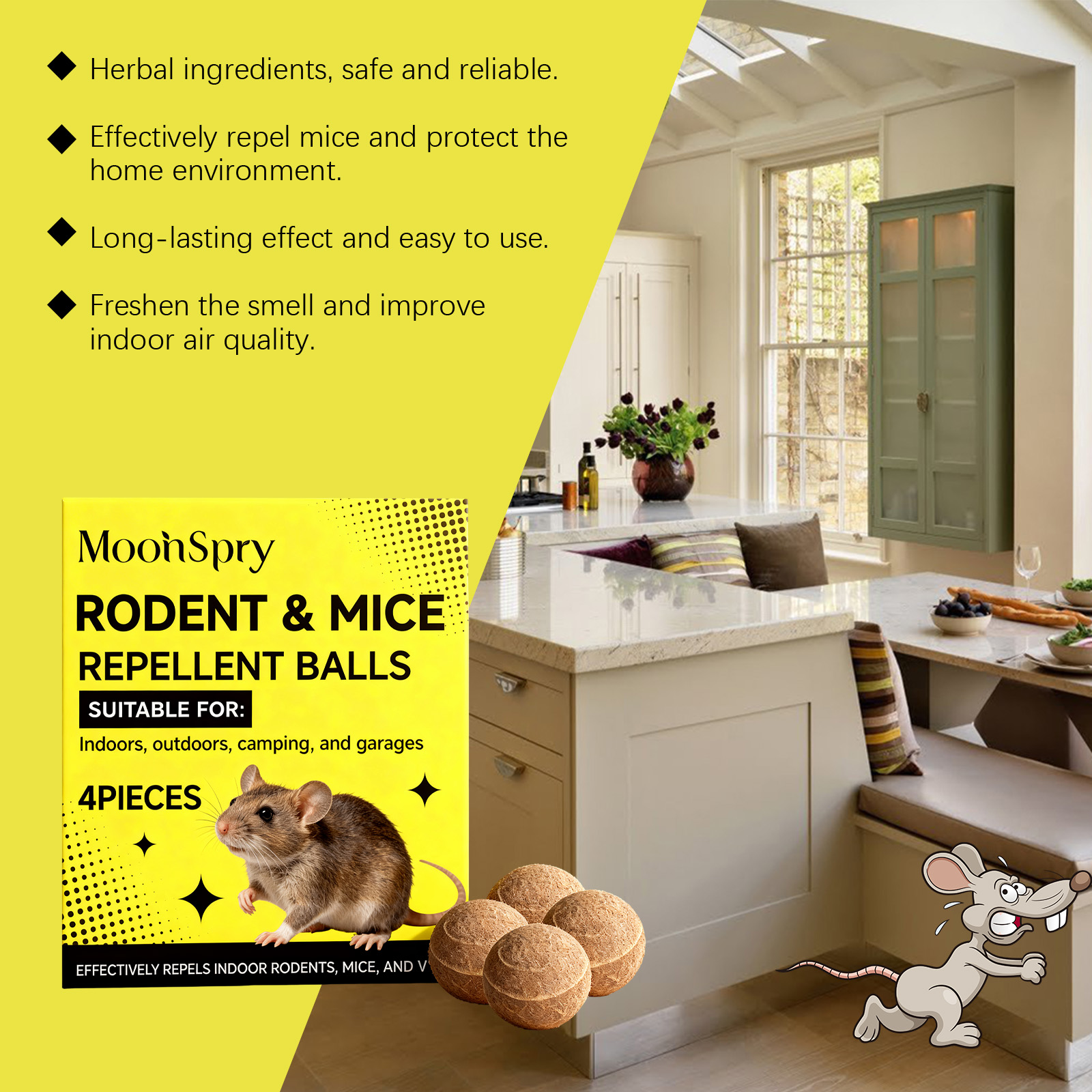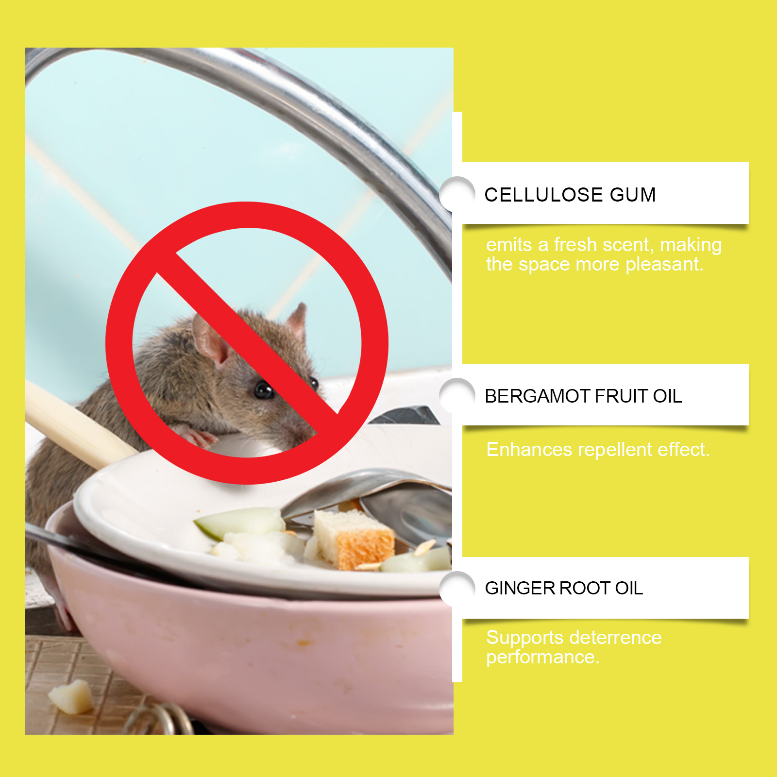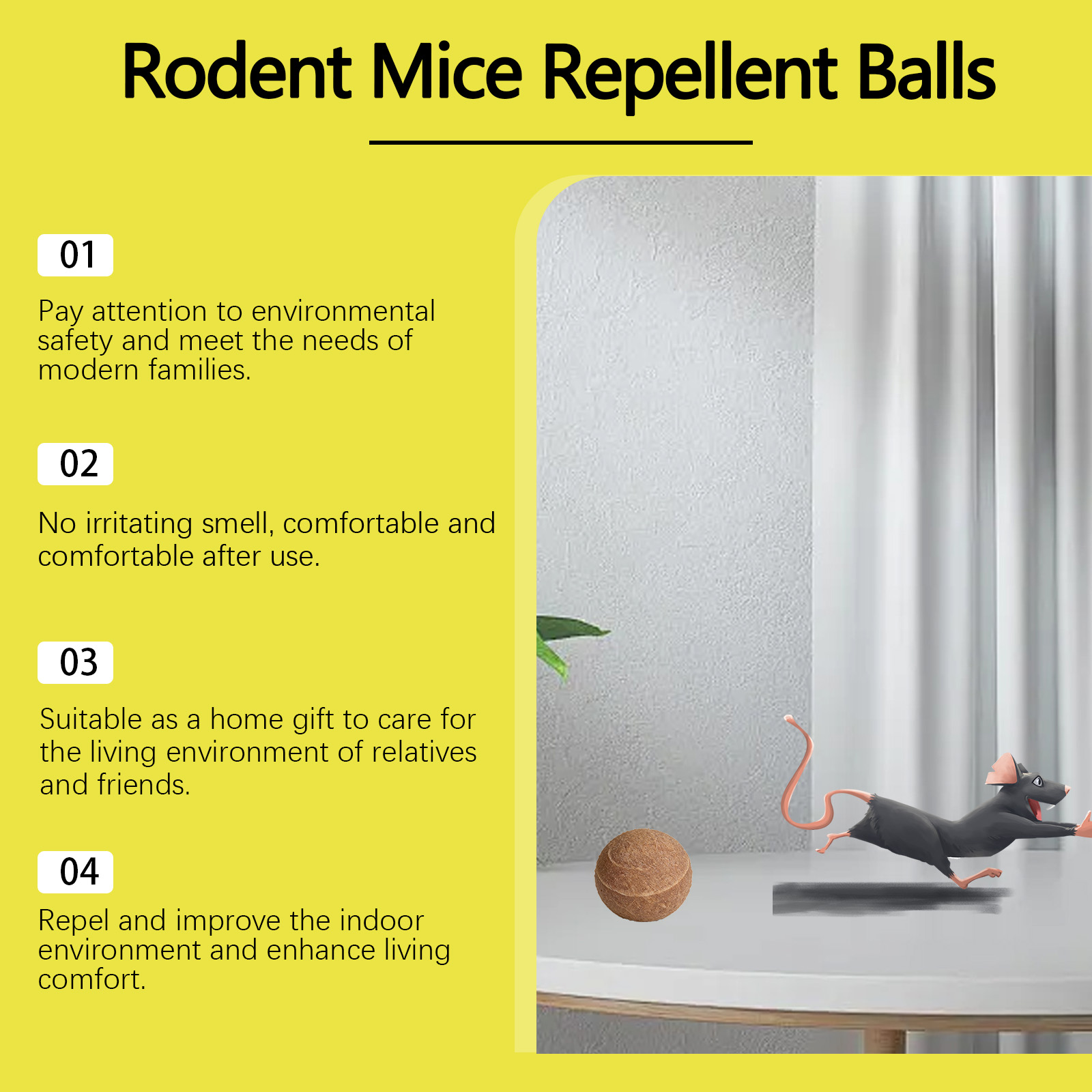 我们的老鼠驱避丸,由香柠檬果油 、姜根油精心调配而成。专为有效驱赶老鼠并确保家庭安全设计。使用方法极为便捷:将此产品放入提供的网袋中。通常,每5-10平方米放置1-2个单位。具体数量将取决于环境。并且它可以散发出宜人的气味,改善室内空气。