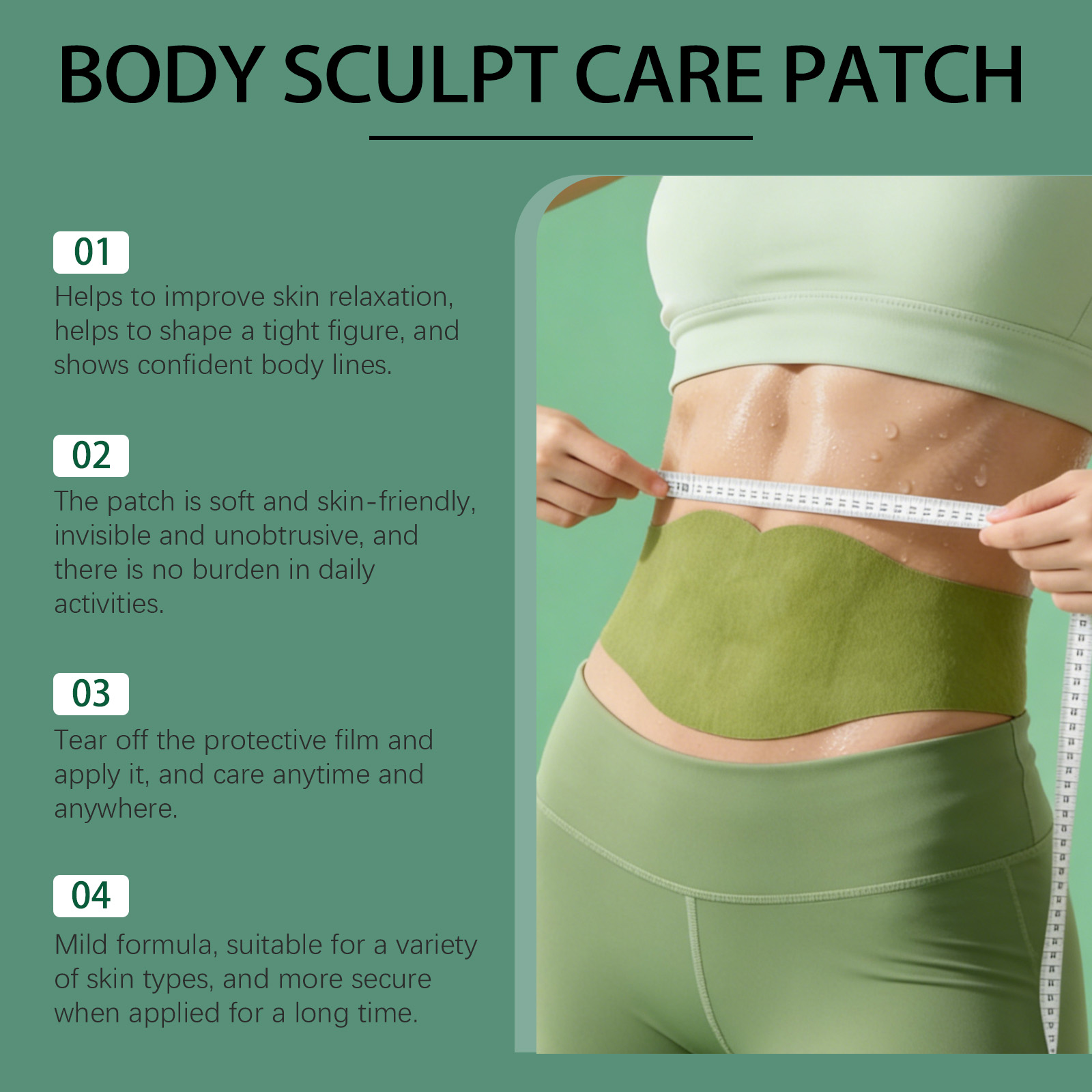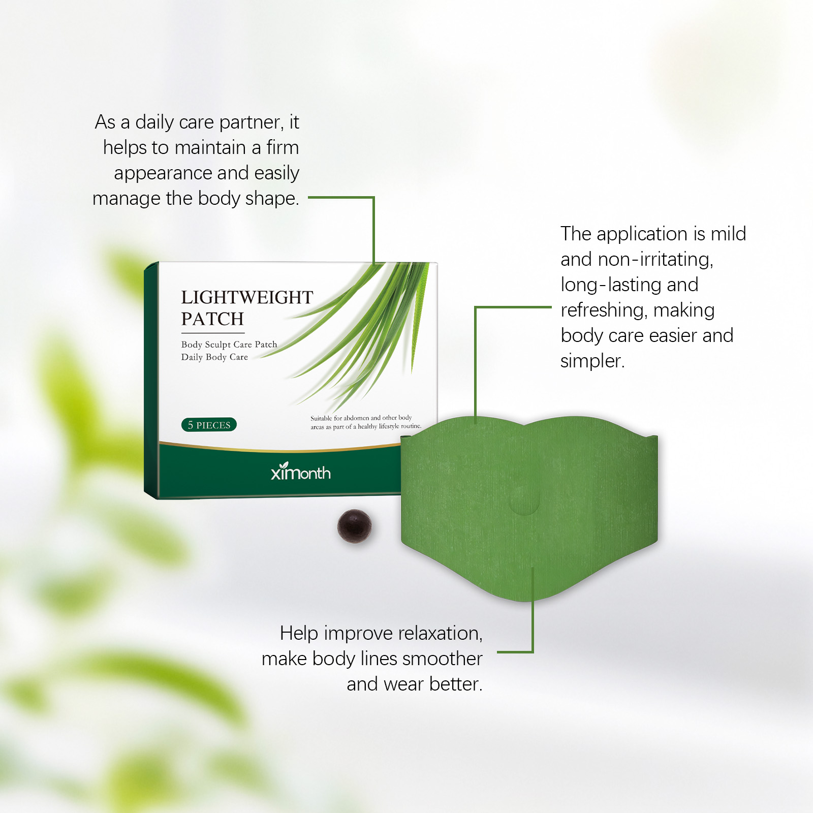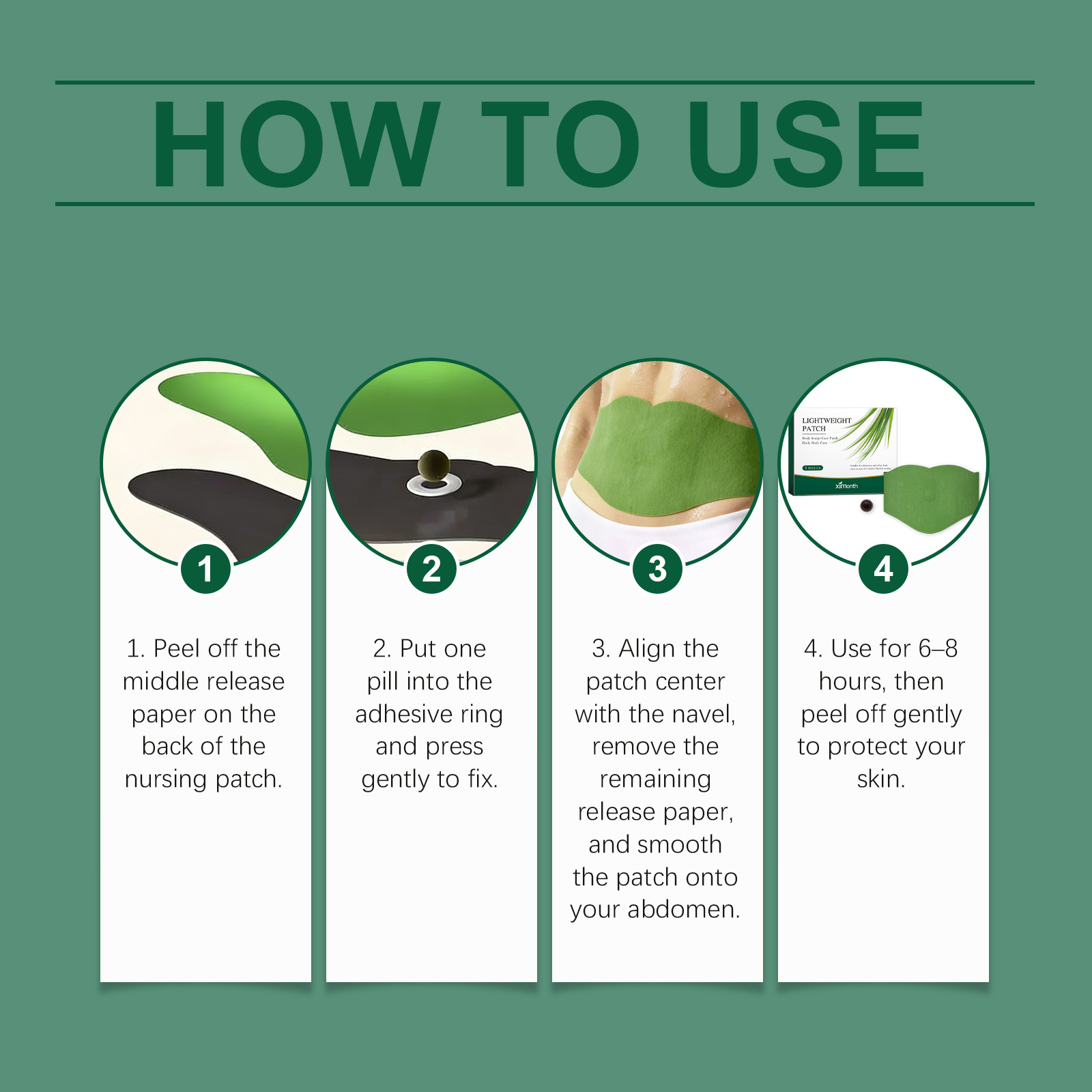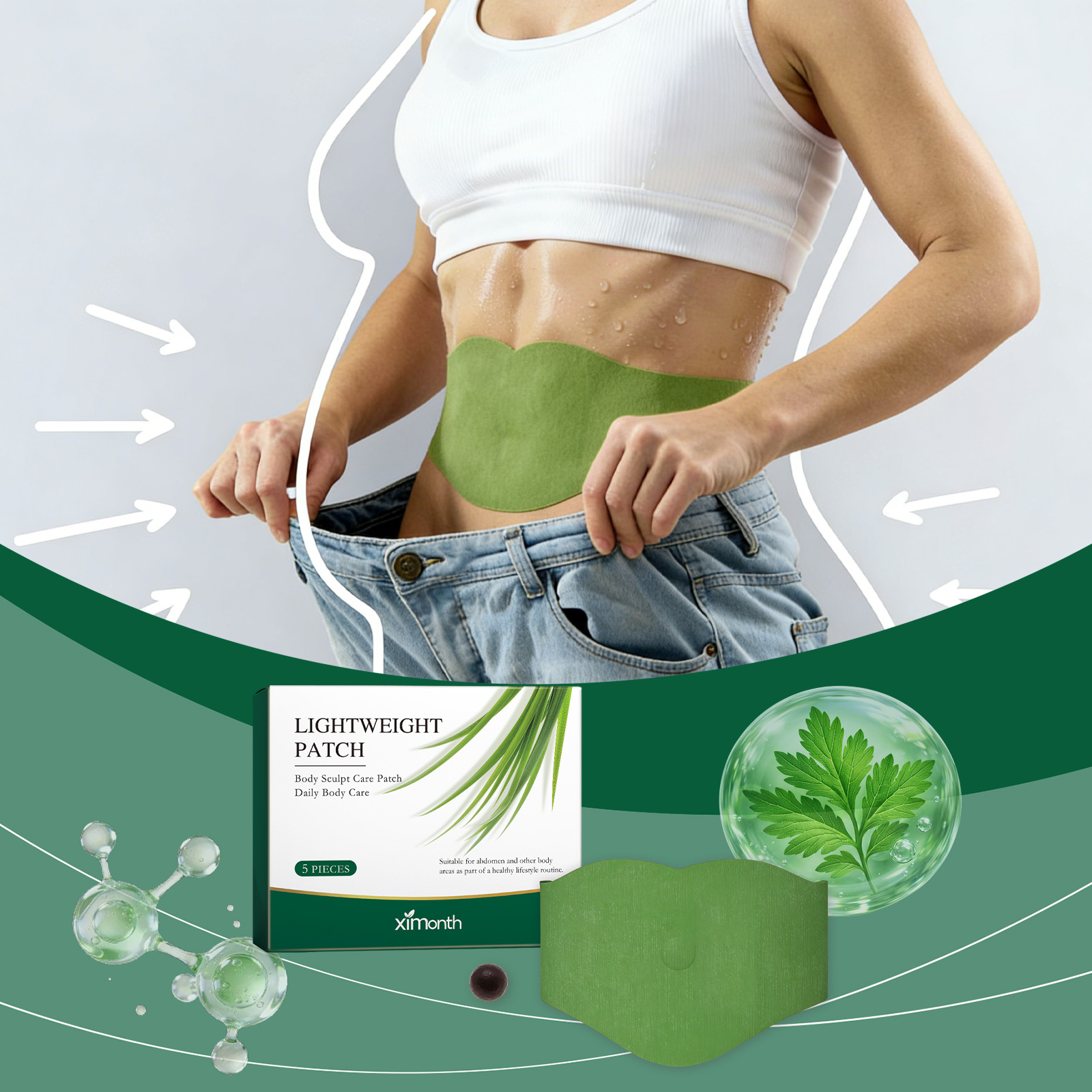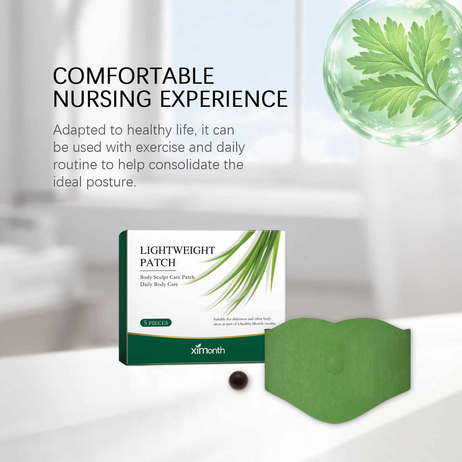 我们的身体护理贴,由艾草、决明子精心调配而成。专为帮助塑造紧致身形、改善肌肤松弛、展现自信曲线设计。使用方法极为便捷:撕下护理贴背面的中间离型纸,放入一颗药丸到粘性环中并轻压固定,将贴片中心对准肚脐,移除剩余离型纸,将贴片平滑贴在腹部,使用6-8小时后轻轻撕下。使用后帮助塑造紧致身形,展现自信线条,贴片轻薄柔软,可贴于衣物下方不易察觉,适合日常活动,温和配方适合多种肤质,长时间佩戴舒适无束缚。