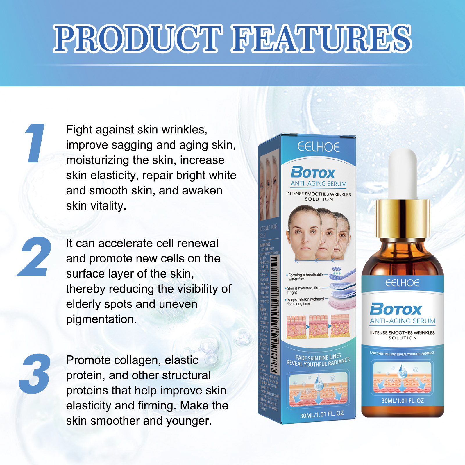 我们的胶原蛋白抗皱精华素含有胶原肽、烟酰胺、赖氨酸多肽。它可以对抗肌肤皱纹,改善松弛老化肌肤,滋润肌肤,增加肌肤弹性,修复亮白光滑肌肤,唤醒肌肤活力。还可以加速细胞更新,促进皮肤表层的新细胞,从而减少老年斑的可见性和不均匀的色素沉着。促进胶原蛋白、弹性蛋白和其他有助于改善皮肤弹性和紧致的结构蛋白。使皮肤更光滑,更年轻。它的使用方法很简单:1. 洁面后,取适量精华液和润肤露于掌心。2. 轻轻地将精华液从下巴向中心向外按压到脸颊和前额。3. 用指尖轻轻按压脸部,帮助吸收。胶原蛋白抗皱精华素形成透气水膜,多补水锁水;皮肤表面水润,肌肉底部光滑明亮;水渗透到肌肉的底部,并保持长时间的水分。