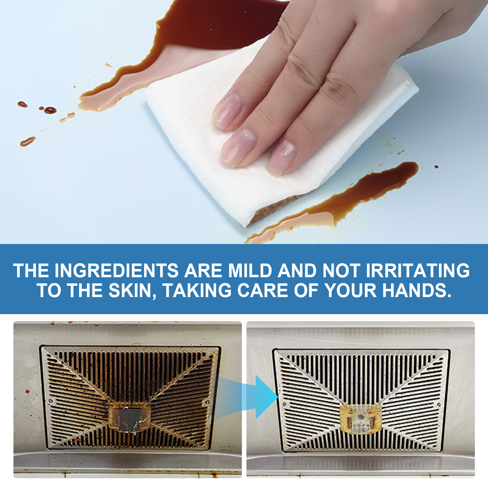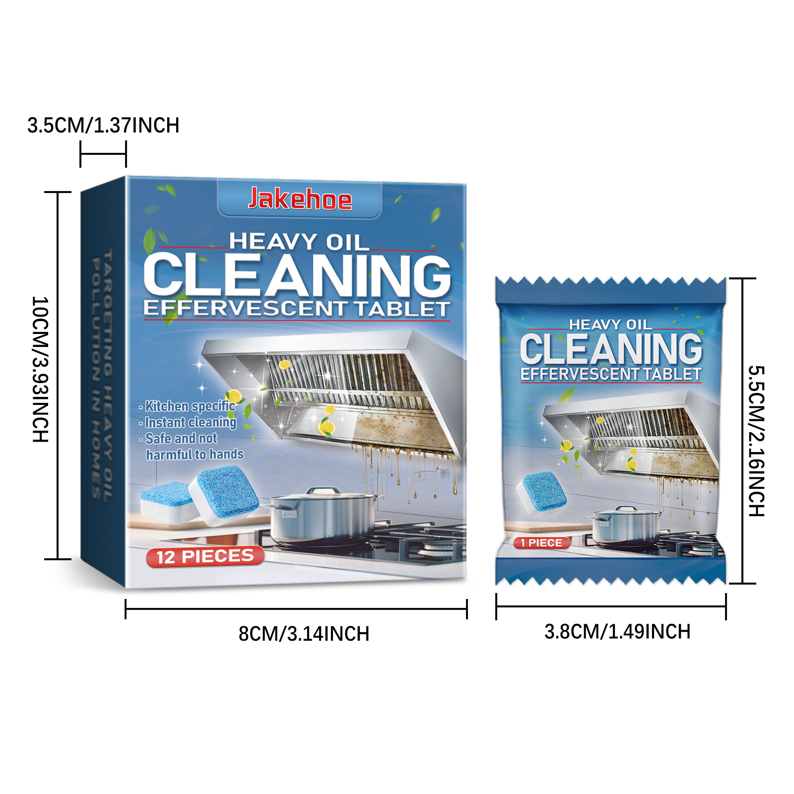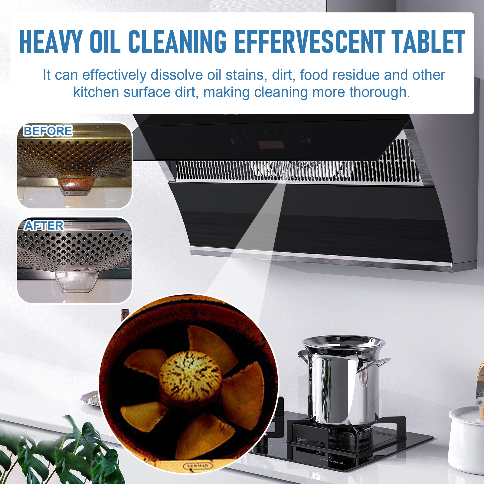 我们的厨房清洁泡腾片(盒装)含有小苏打、柠檬提取物。它可以具有广泛的适用性,可以轻松去除墙壁、炉灶和吸烟机上的油渍。它的使用方法很简单:1.取一片泡腾片,放在盛满水的盆里。2.等泡腾片溶解后,用抹布蘸着用。你可以反复擦拭油腻的地方,直到污渍去除。3.用干净的布擦干。并且可以快速溶解,消除等待时间,让您立即开始清洁。
