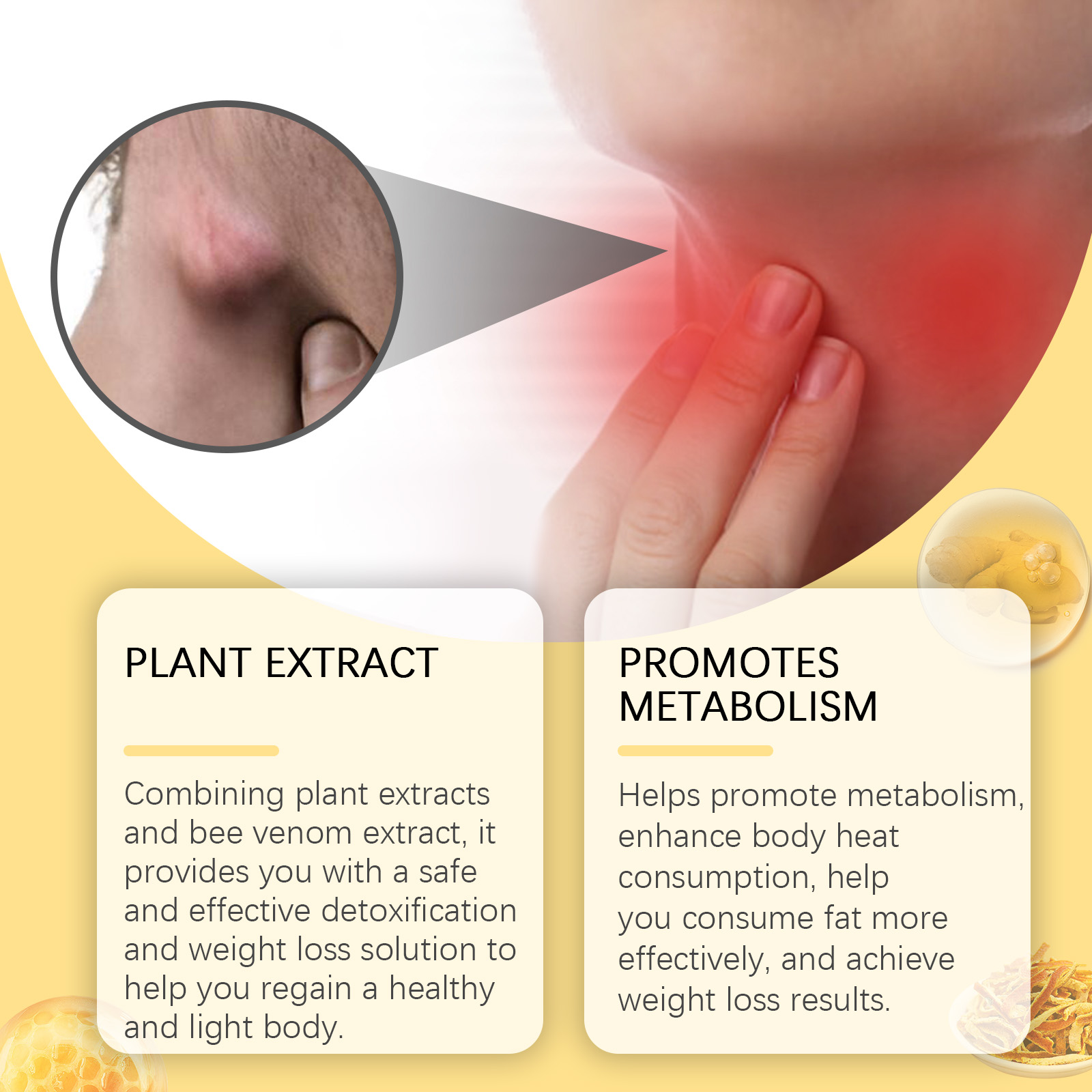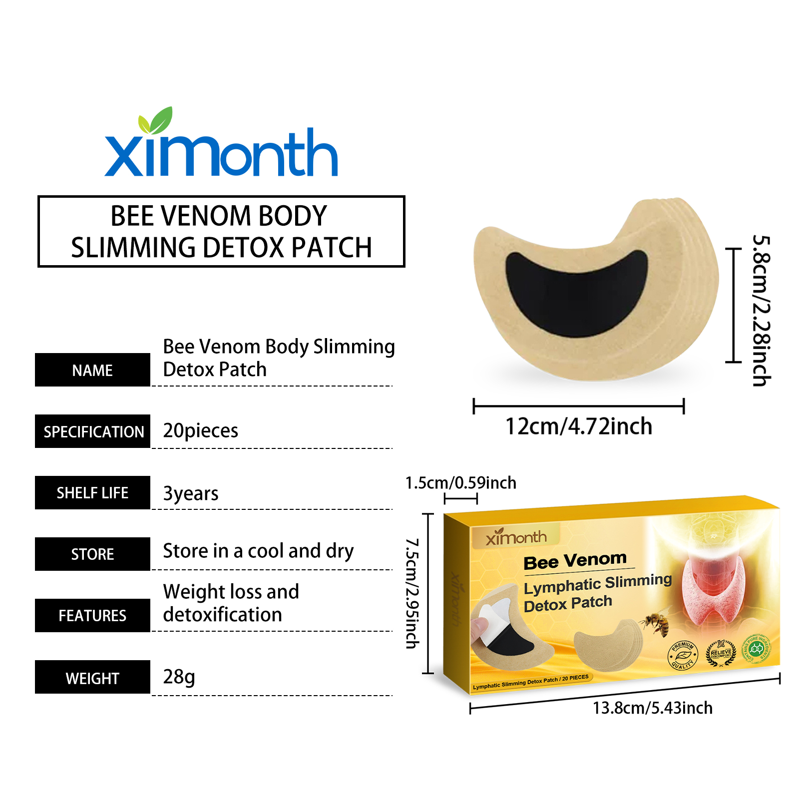 我们的蜂毒淋巴美体贴含有陈皮、蜂毒提取物、红花提取物。它可以有助于促进新陈代谢,提高身体热量消耗,帮助你更有效地消耗脂肪,达到减肥的效果。有助于促进淋巴循环,清除体内废物和毒素,减少水肿,帮助你排出多余的水分和废物。它的使用方法很简单:1.清洁和干燥颈部皮肤。2.取出贴片,贴在肿大的淋巴结或甲状腺部位。静置8-12小时。3.取下贴片后再次清洁皮肤。蜂毒淋巴美体贴结合植物提取物和蜂毒提取物,为您提供安全有效的排毒和减肥解决方案,帮助您重获健康轻盈的身体。