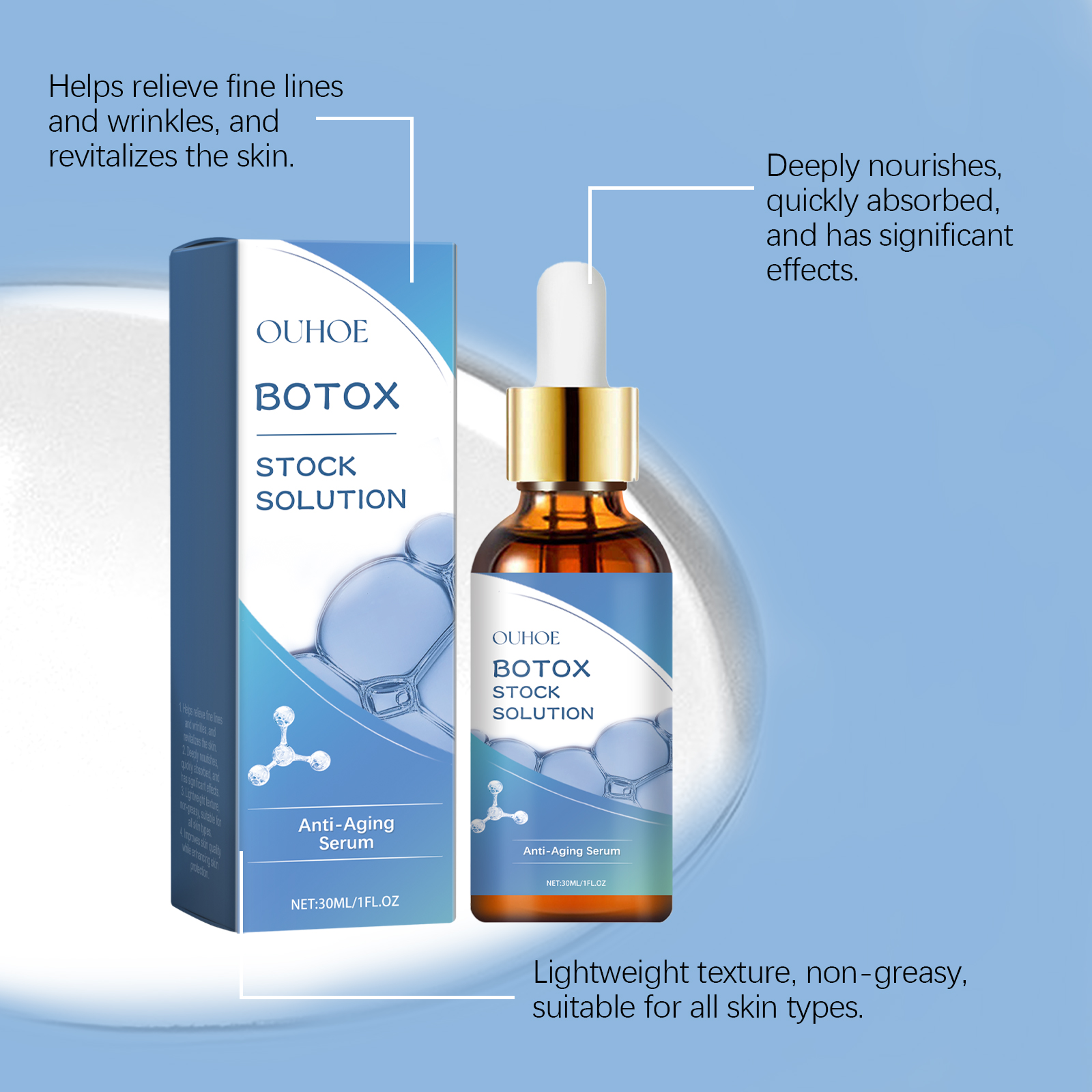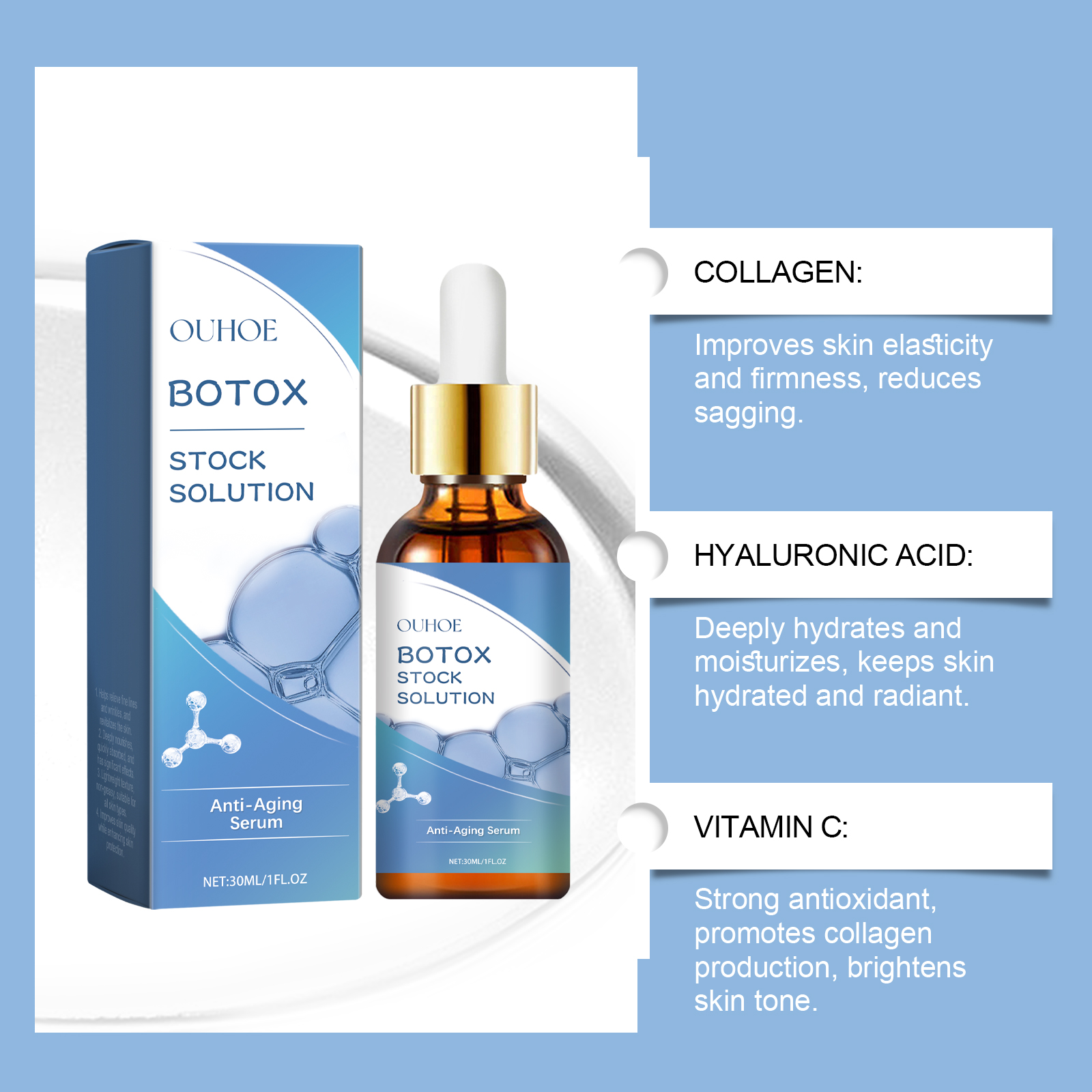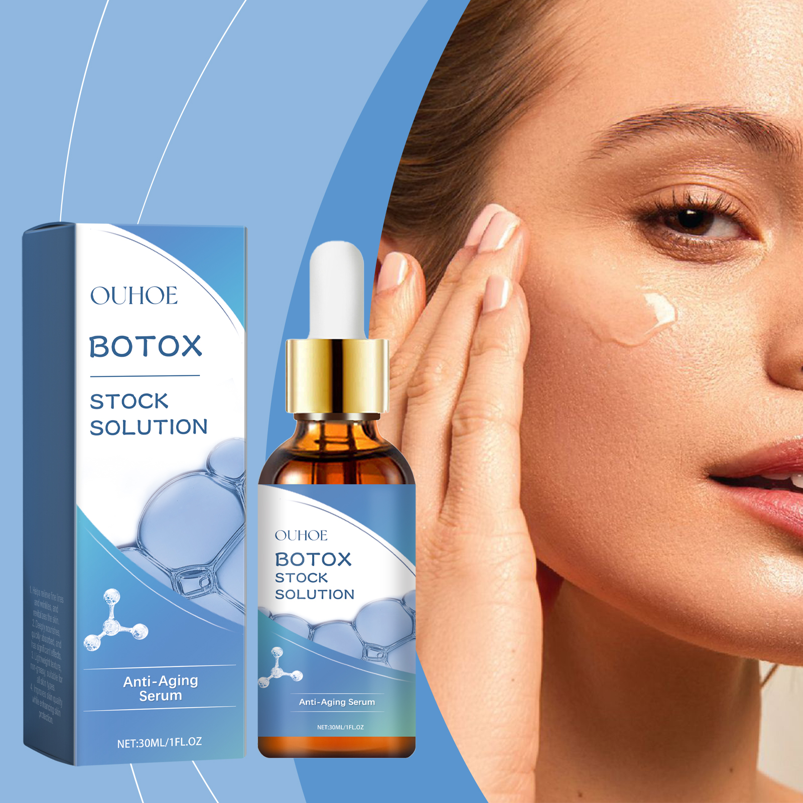 我们的淡化细纹面部精华液含有胶原蛋白、透明质酸、维生素C。它可以显着减少细纹和皱纹,恢复皮肤光滑。添加胶原蛋白,增强皮肤弹性,重塑面部轮廓。它的使用方法很简单:1.洗脸。2.取适量精华液用滴管均匀涂抹于面部。3.从脸的中心向外做一个圆圈轻轻地按摩运动直到完全吸收。深层补水,持久保湿,锁紧饱满透亮的肌肤。