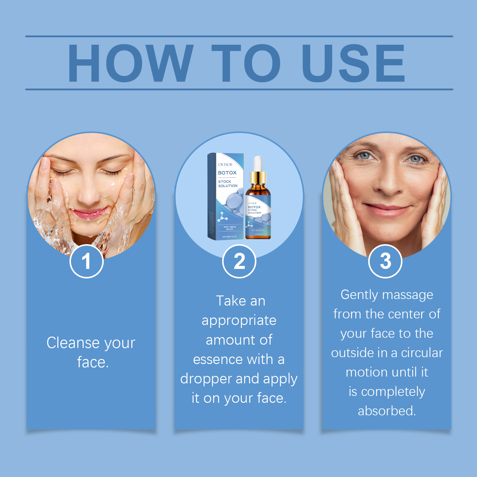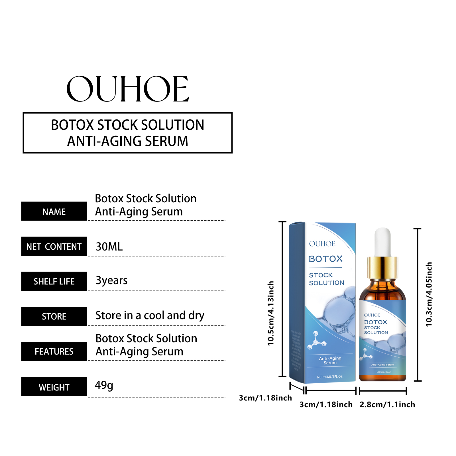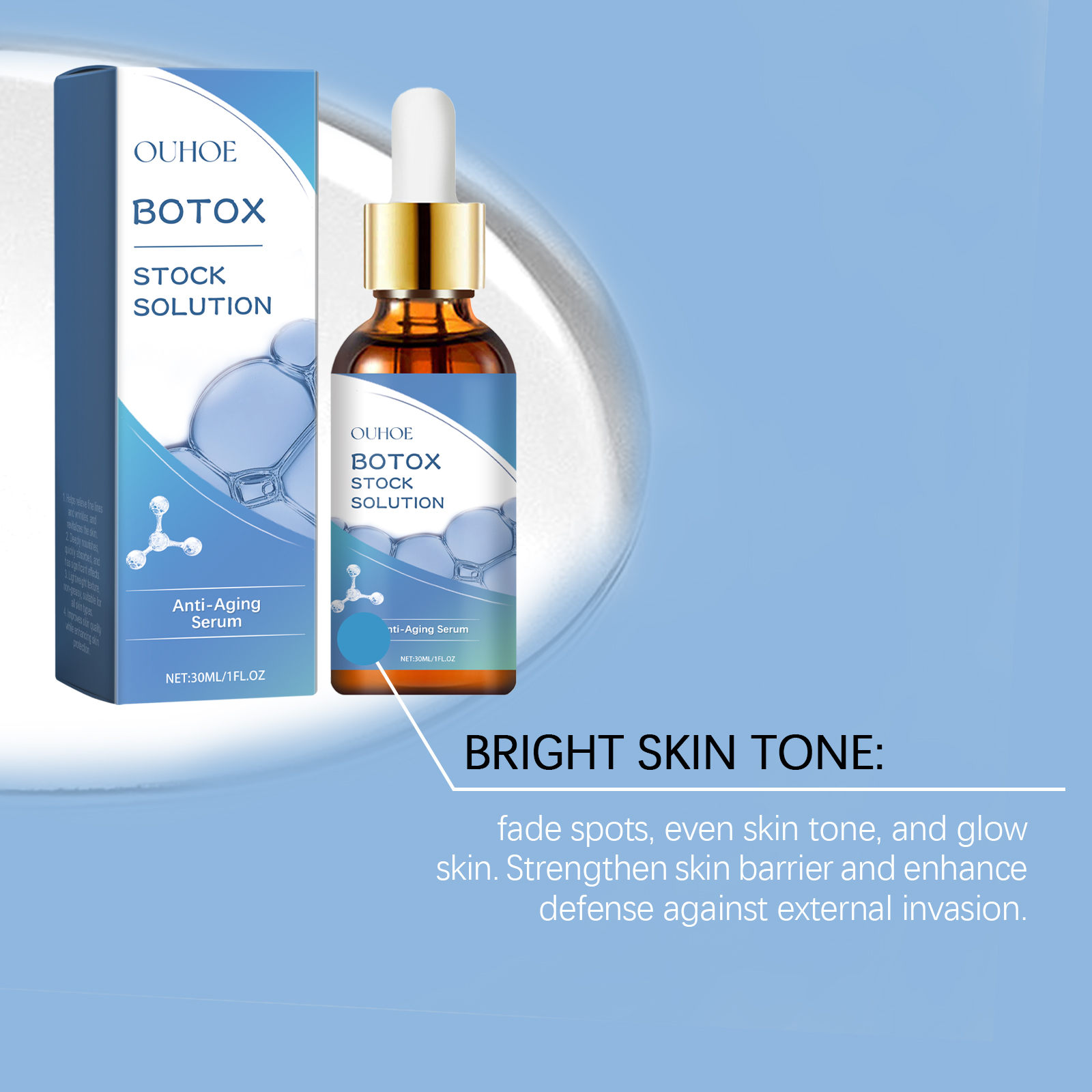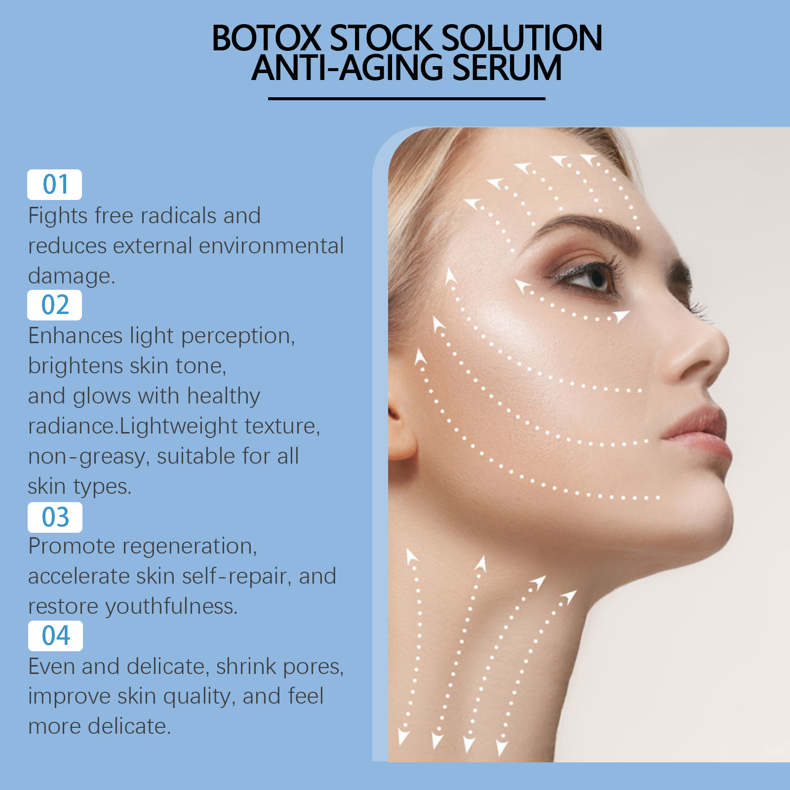 我们的淡化细纹面部精华液含有胶原蛋白、透明质酸、维生素C。它可以显着减少细纹和皱纹,恢复皮肤光滑。添加胶原蛋白,增强皮肤弹性,重塑面部轮廓。它的使用方法很简单:1.洗脸。2.取适量精华液用滴管均匀涂抹于面部。3.从脸的中心向外做一个圆圈轻轻地按摩运动直到完全吸收。深层补水,持久保湿,锁紧饱满透亮的肌肤。
