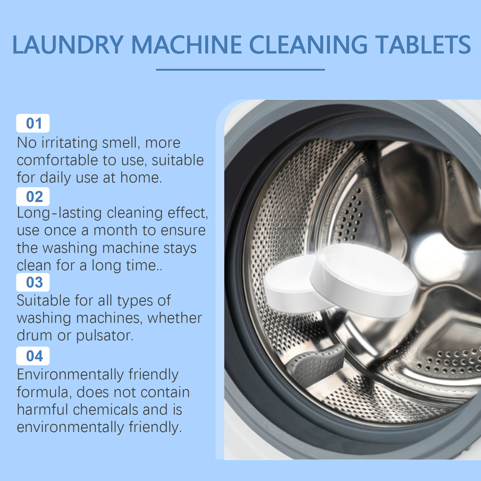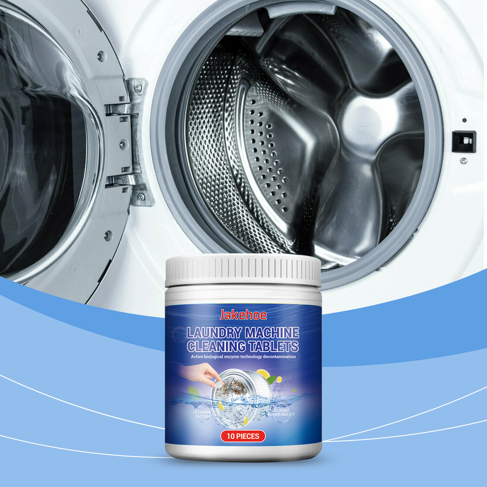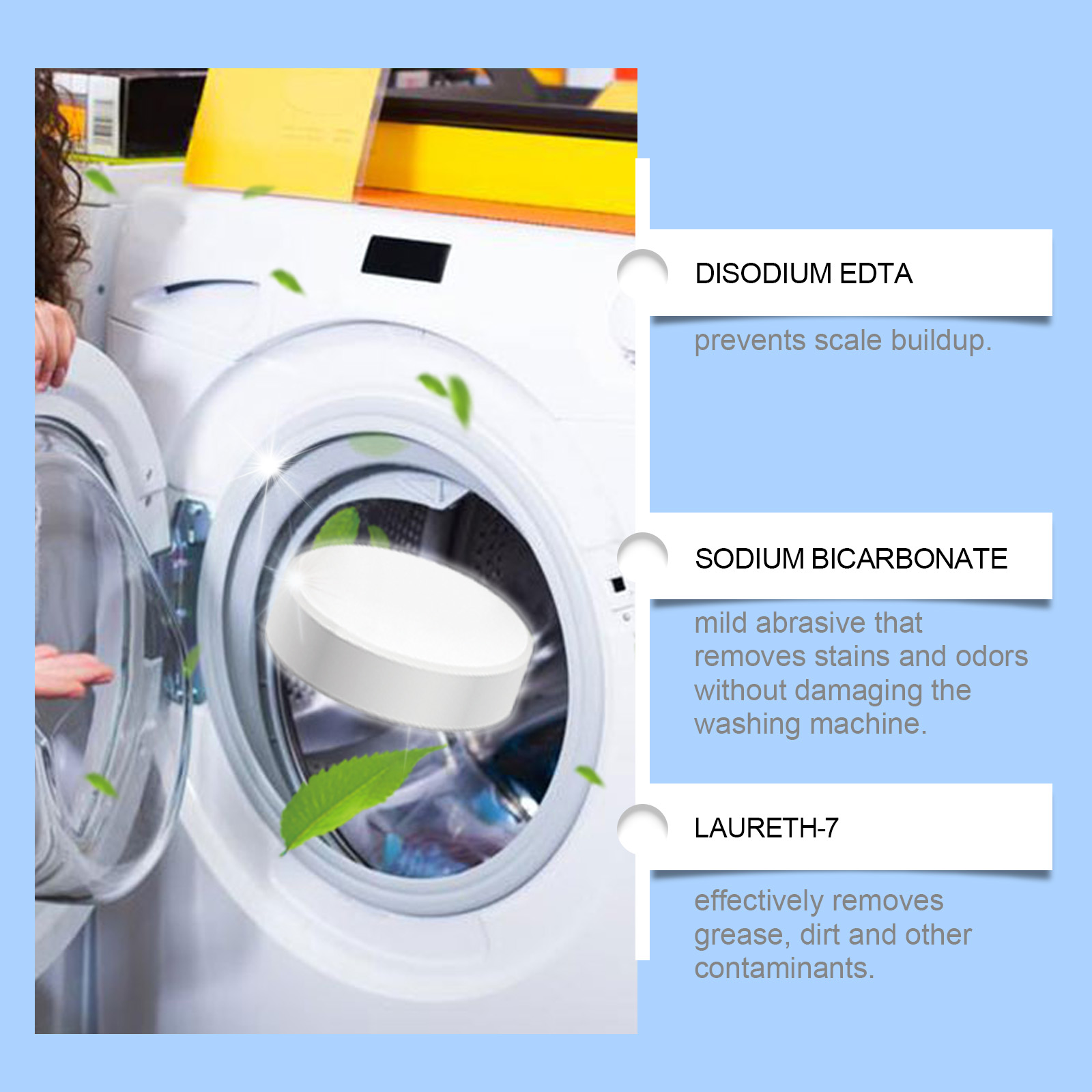 我们的洗衣机清洁泡腾片含有碳酸氢钠、柠檬酸。它可以轻易溶解洗衣机内的污垢,保持洗衣机清洁如新。高效杀菌,快速去除异味,持久保鲜。它的使用方法很简单:1.拿一块这种产品放在洗衣机里。2.打开正常的洗涤程序来清洗。配方温和,不损坏洗衣机内部零件,安全可靠。