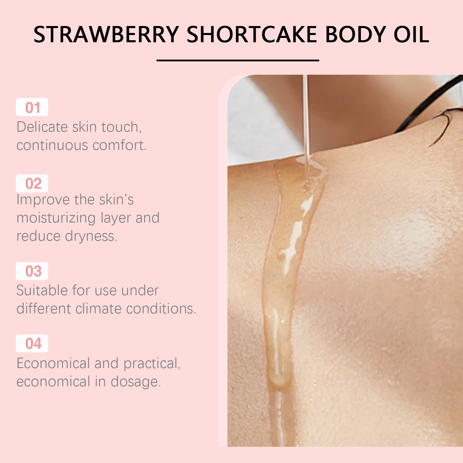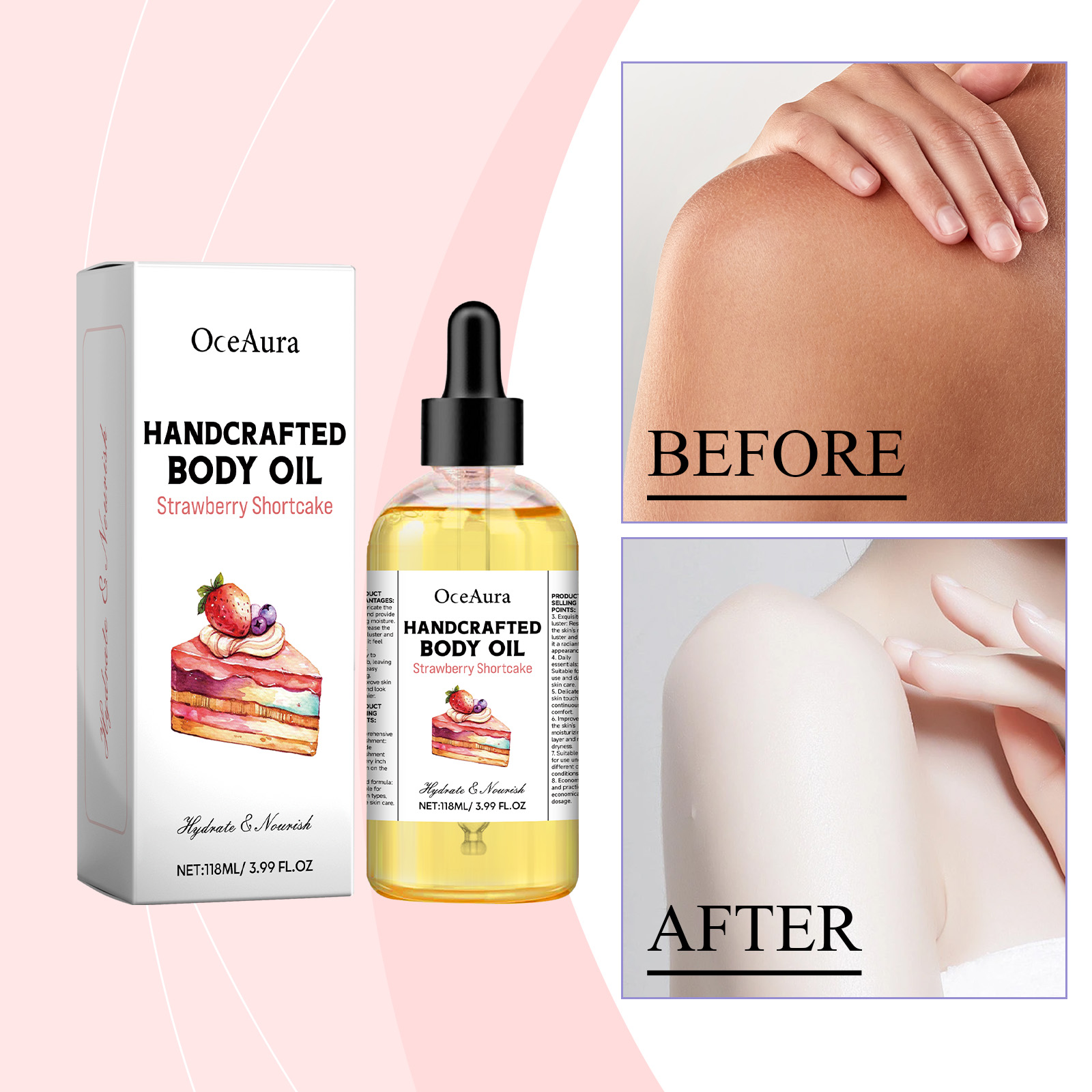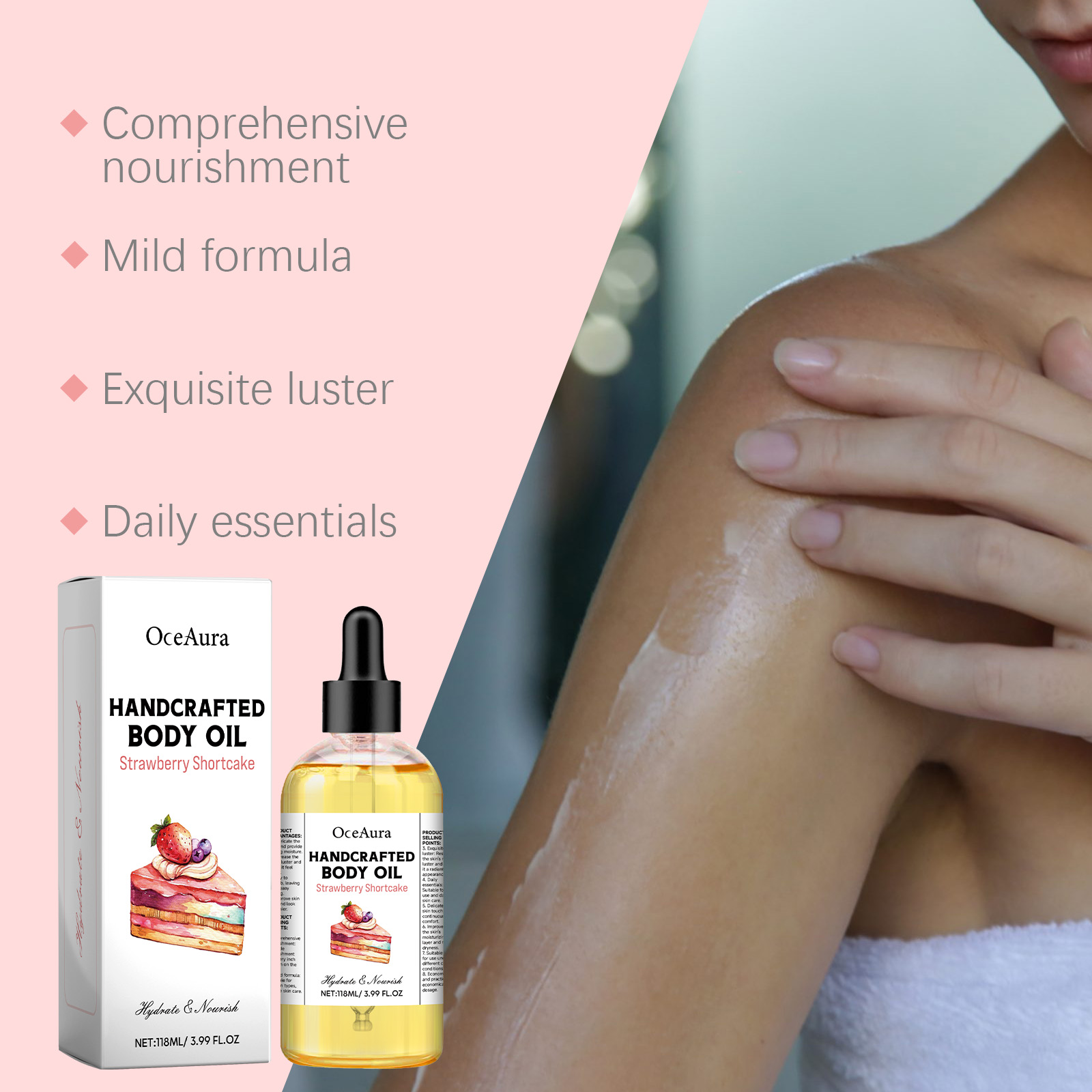 我们的草莓香酥身体油含有矿油、氢化蓖麻油、迷迭香叶油。它可以为身体的每一寸肌肤提供营养。它的使用方法很简单:清洁身体皮肤,保持干燥,取适量本品均匀涂抹于身体肌肤,轻轻打圈按摩至完全吸收。并且可以润滑肌肤,提供持久的水分。