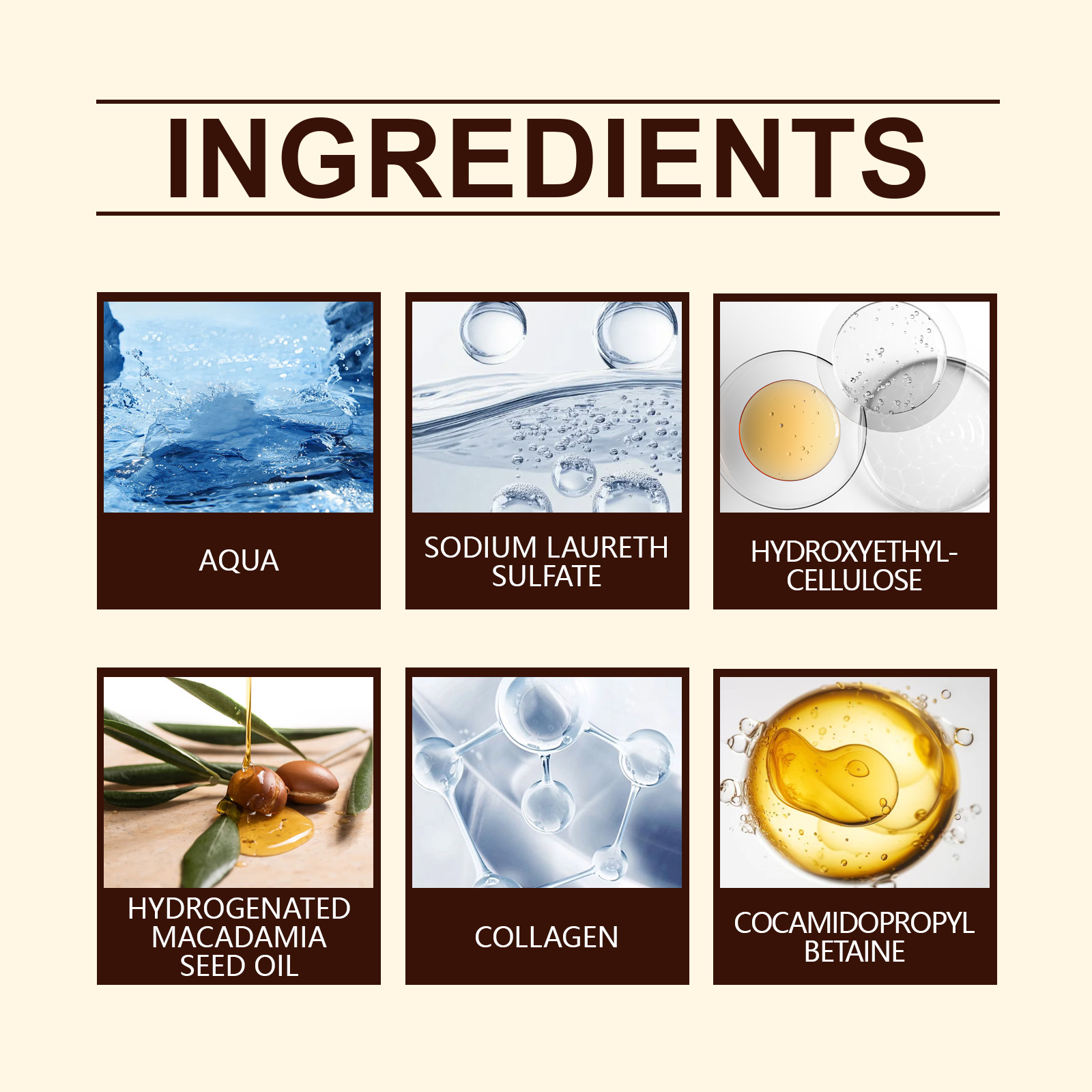 我们的胶原蛋白洗发水含有氢化澳洲坚果籽油、胶原。它可以深层滋养每根发丝,保持保湿。帮助修复受损的头发。易冲洗,无沉淀物。它的使用方法很简单:1.滋润头发;2.取适量本品于手心,轻轻揉搓成泡沫状。3.轻轻按摩成泡沫,涂抹于头皮和头发;4.按摩清洁头皮和头发,然后用清水冲洗干净,吹干。提供超强的水分,保持头发柔软有光泽。帮助深层清洁头发,保持头发清洁。