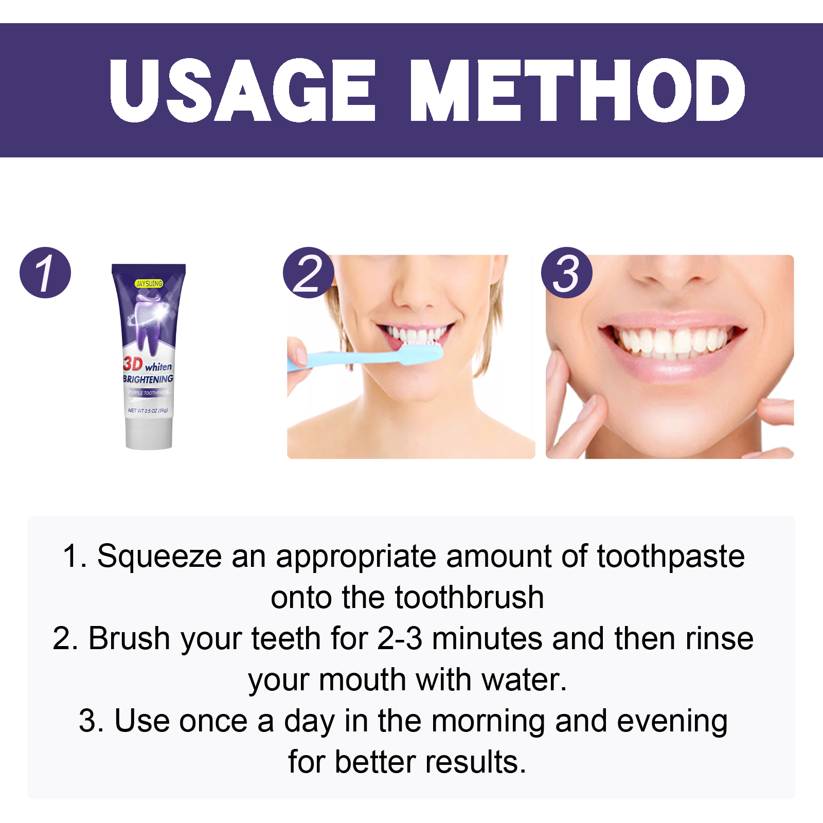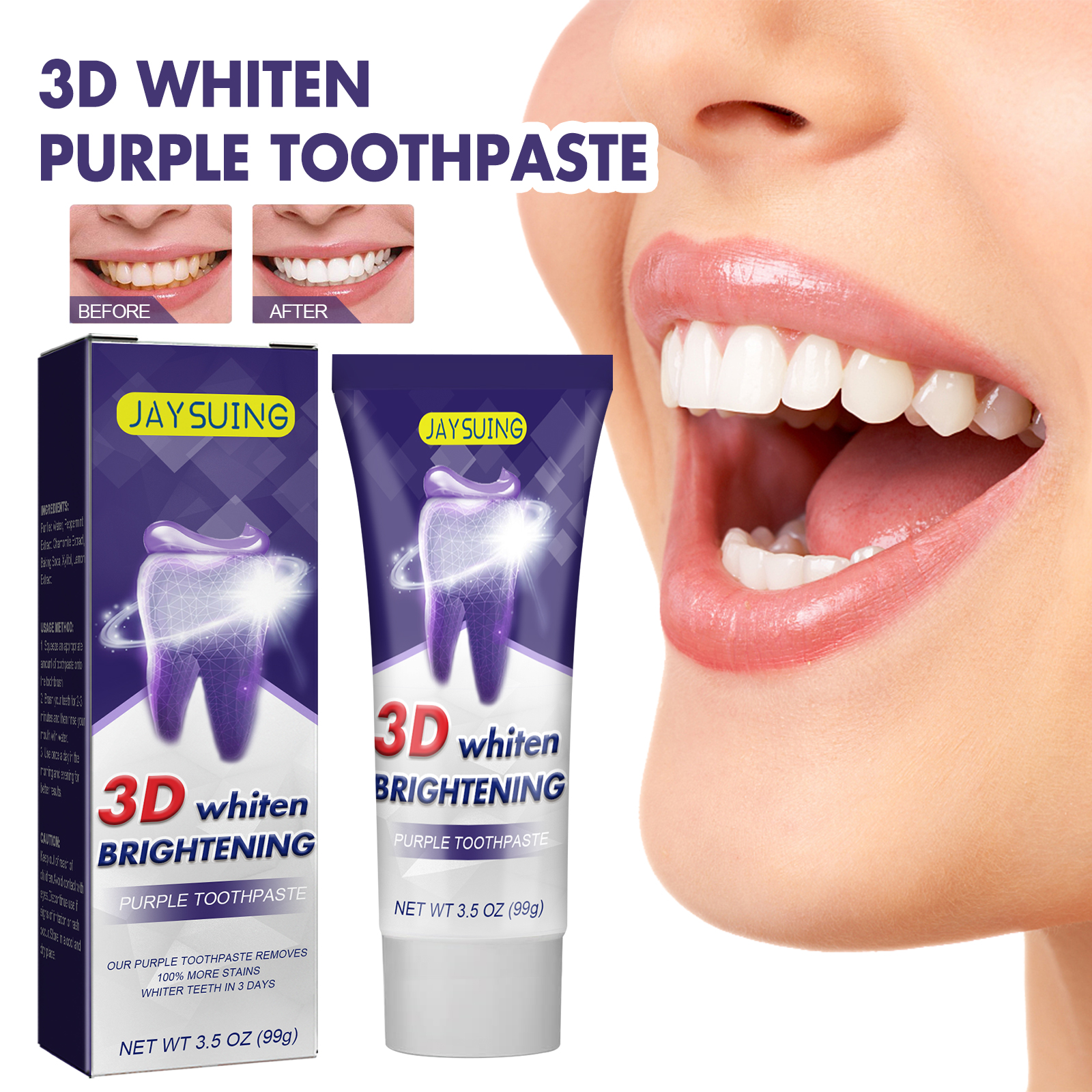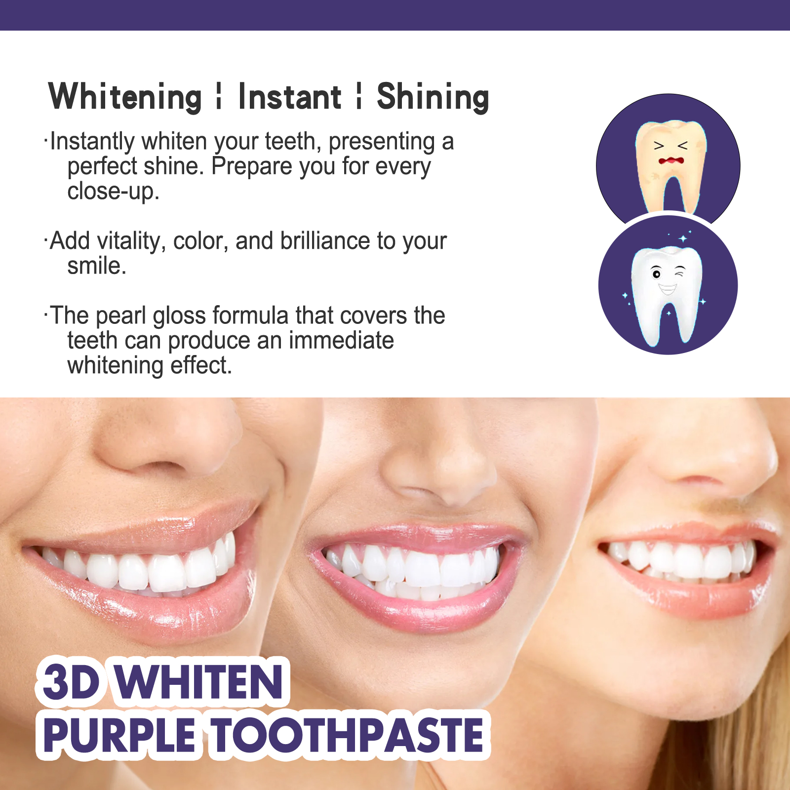 我们的牙齿焕白紫色牙膏含有薄荷提取物,洋甘菊提取物,小苏打。它可以美白牙齿,深层清洁,去除口腔异味,清新口气。它的使用方法很简单:在牙刷上挤适量的牙膏,刷牙2-3分钟,然后用清水漱口;每天早晚各使用一次,效果更好。牙齿焕白紫色牙膏有助于保护您的牙齿,清洗消毒,美白牙齿,缓解敏感牙齿,保持清新口气。