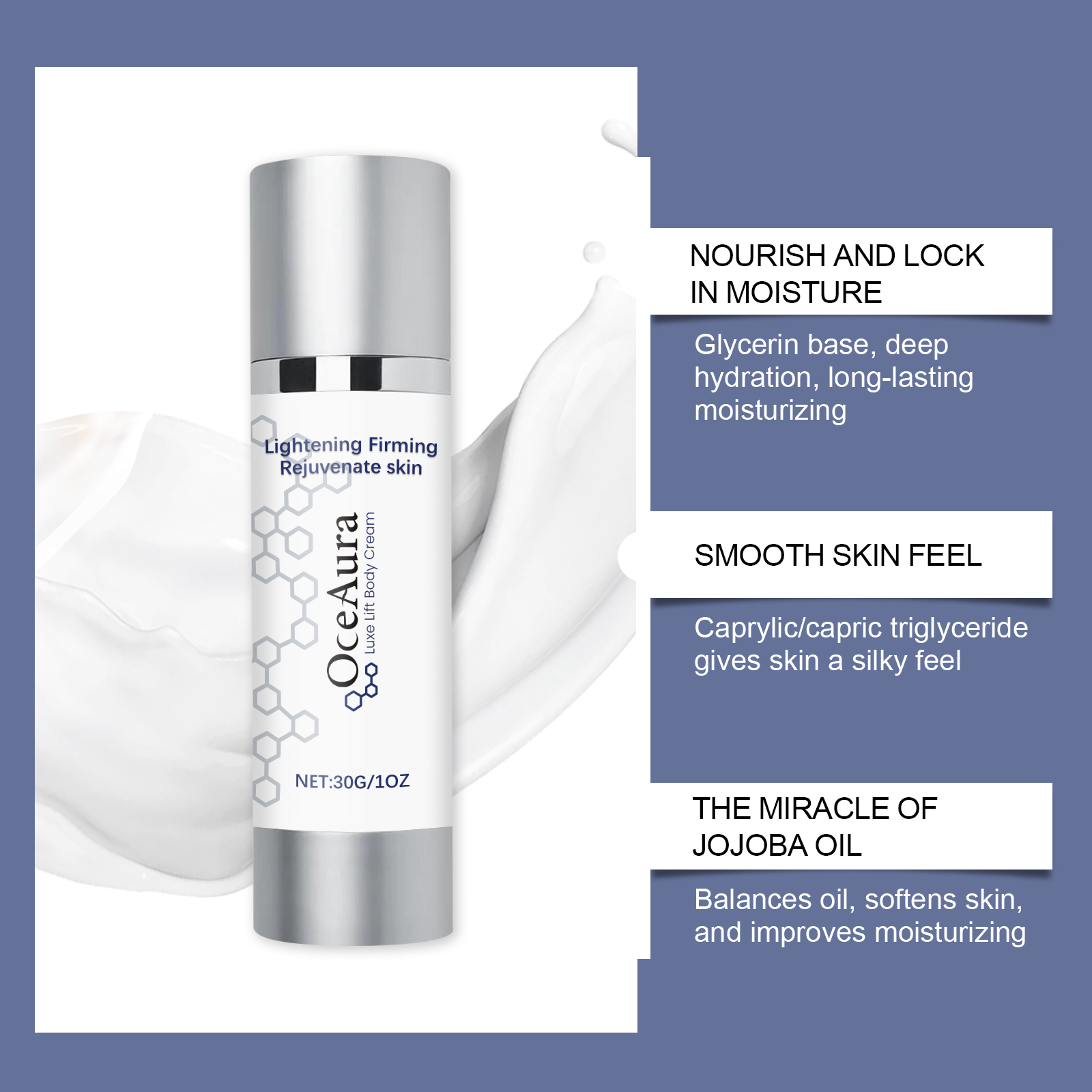 我们的身体护肤霜含有甘油、辛酸/癸酸甘油三酯、霍霍巴籽油。它可以改善整体肤质,均匀肤色,改善肤质。长期服用,皮肤会显得更年轻、更丰满。保护皮肤免受环境压力。有效改善肌肤干燥,令肌肤柔软光滑。它的使用方法很简单:清洁使用区域皮肤,取适量面霜涂抹于目标区域,如面部、颈部、大腿、手臂等。用手指轻轻按摩奶油,直到完全吸收。与胶原蛋白结合,增强肌肤弹性和紧致度。促进皮肤自我更新,自然焕发光彩。轻盈不油腻,吸收迅速,无负担。