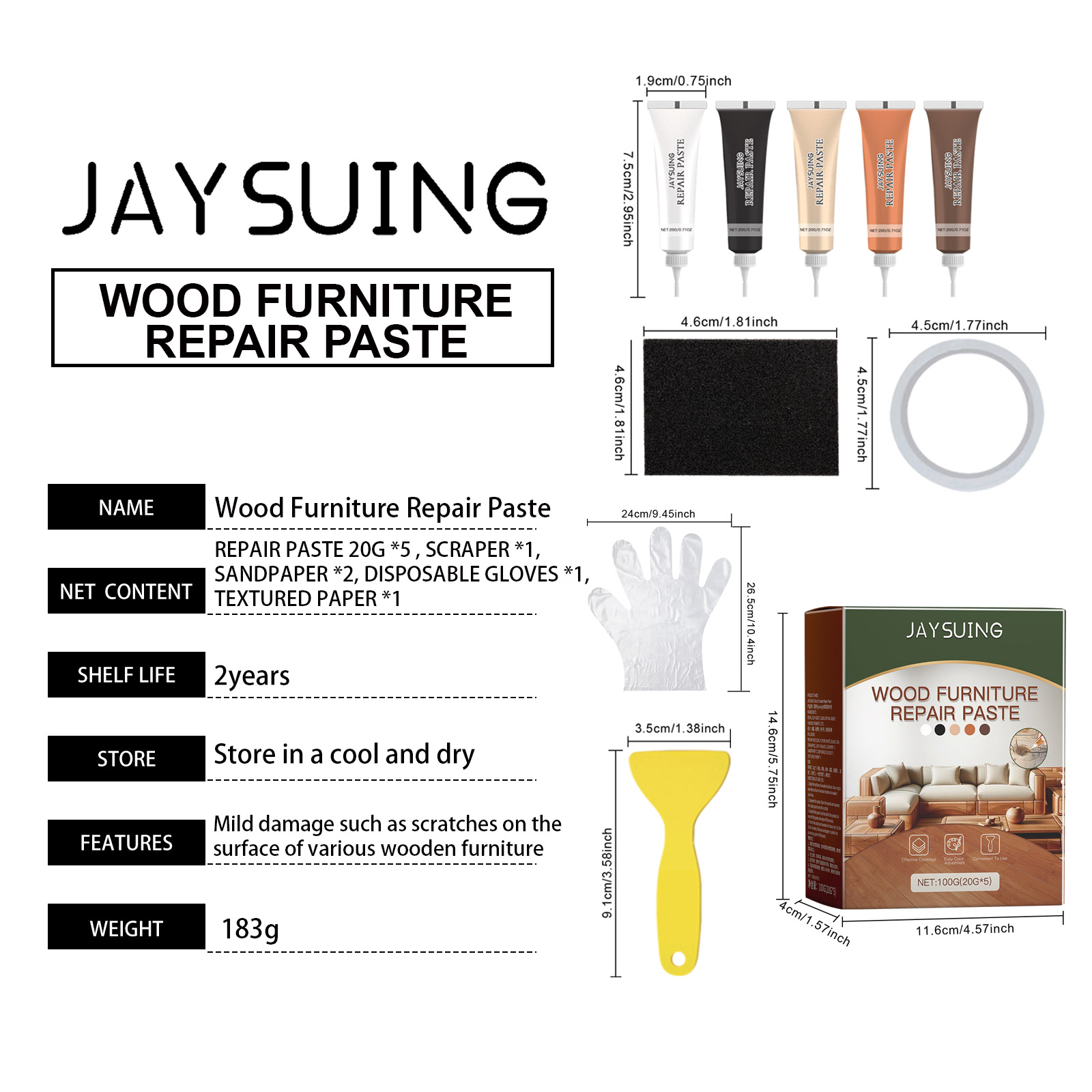 修复膏:1.9X7.5cm;刮板:9.1X3.5cm;砂纸:4.6x4.6cm ;美纹胶:4.5X4.5cm;一次性手套:24X26.5cm