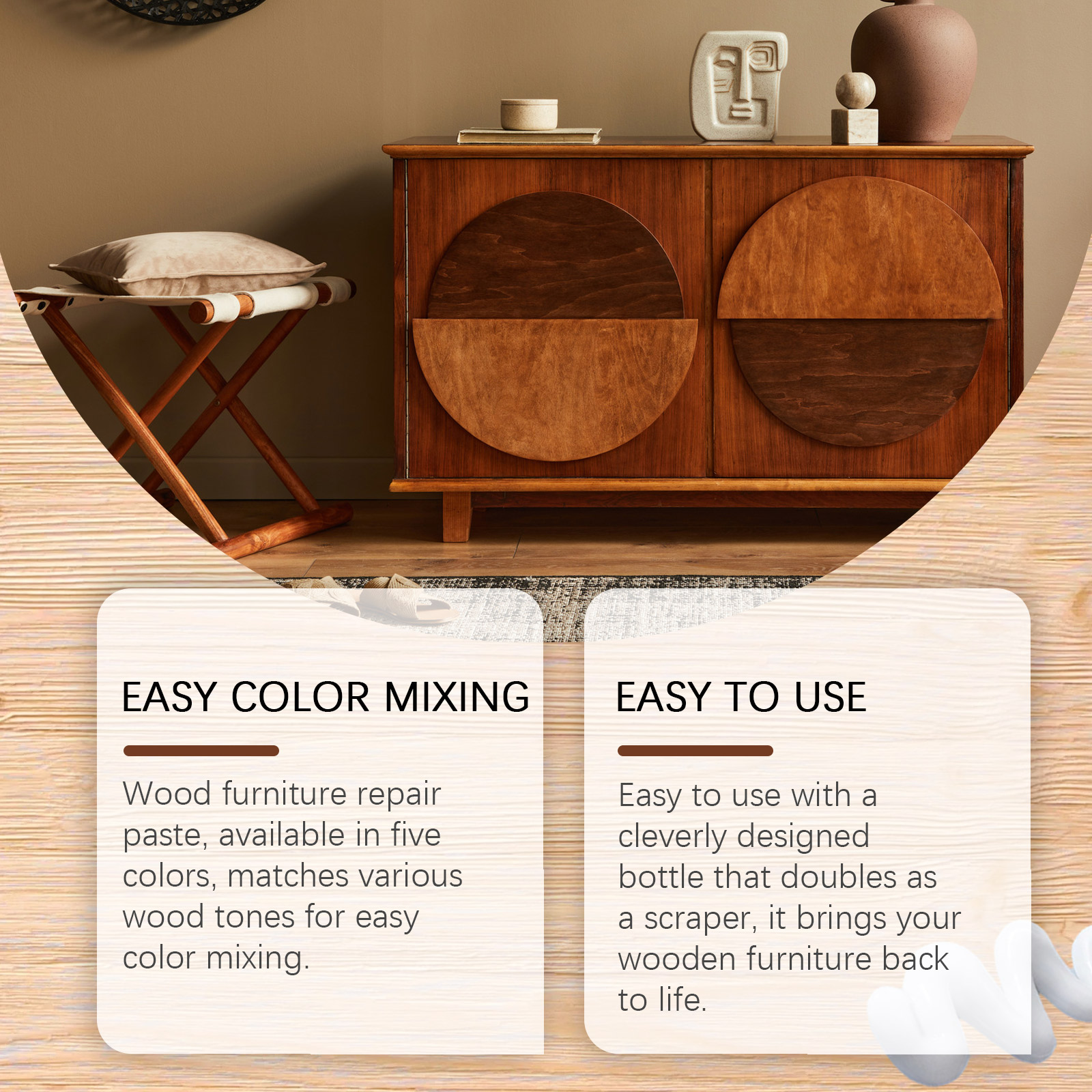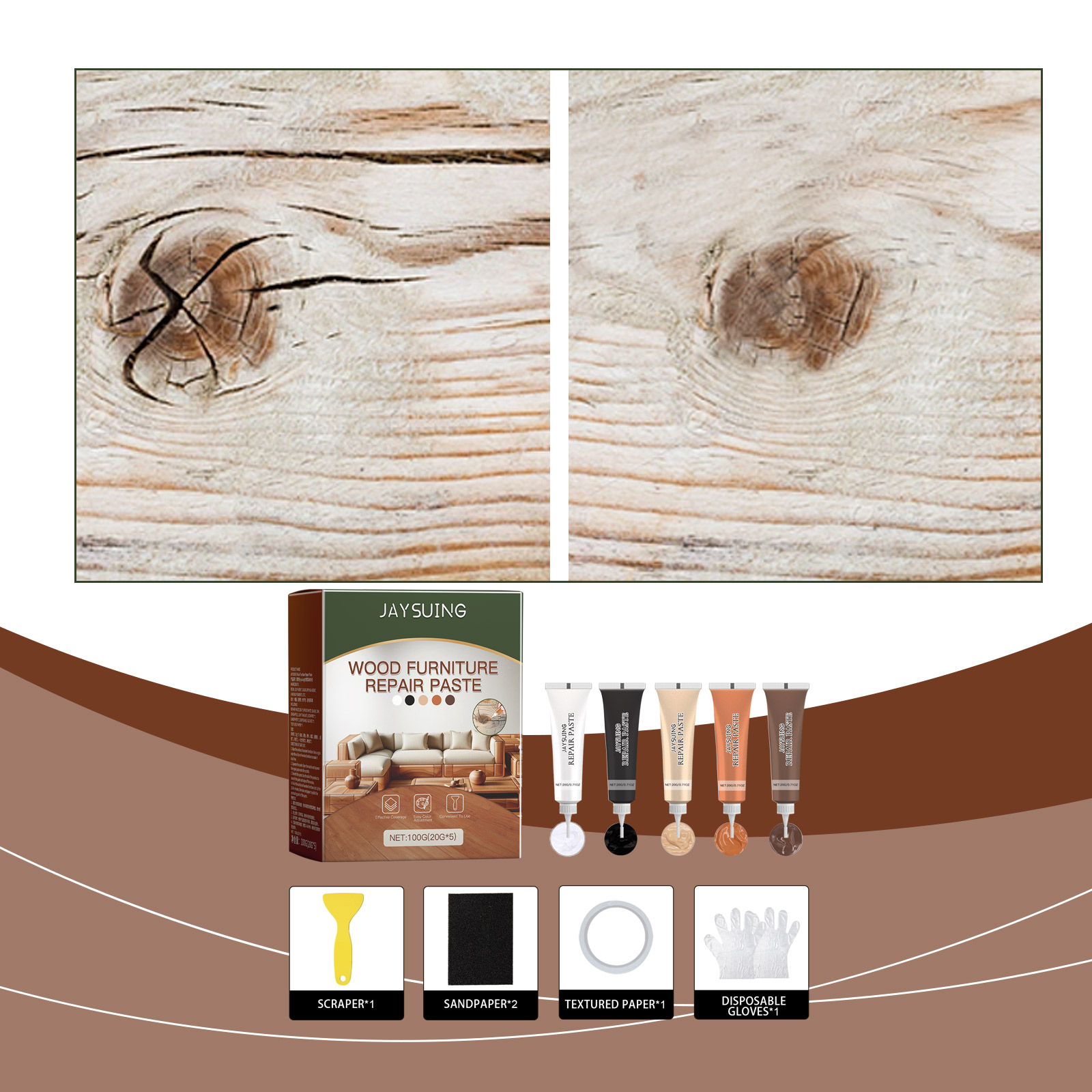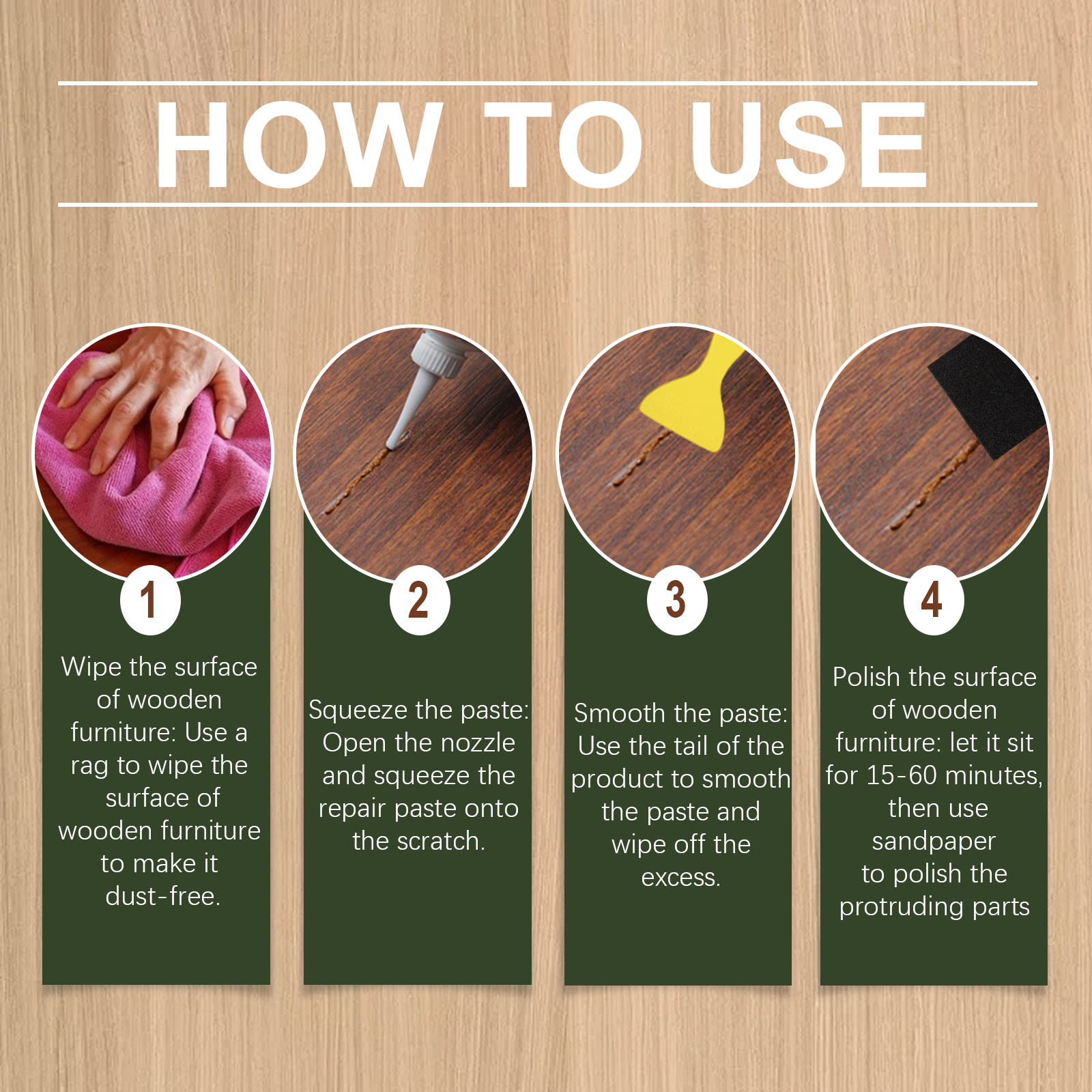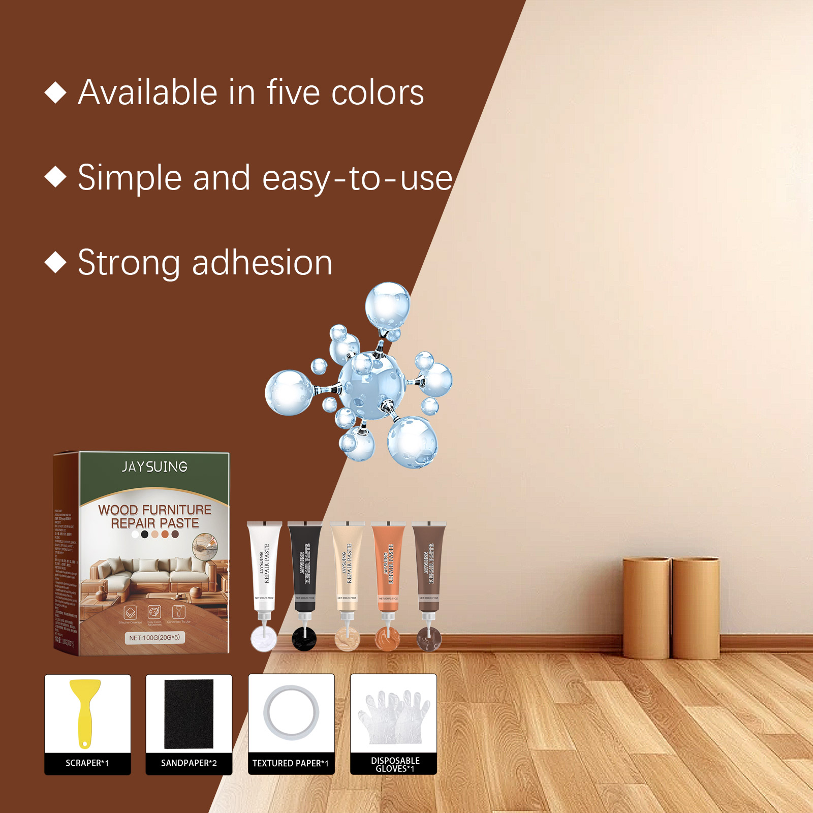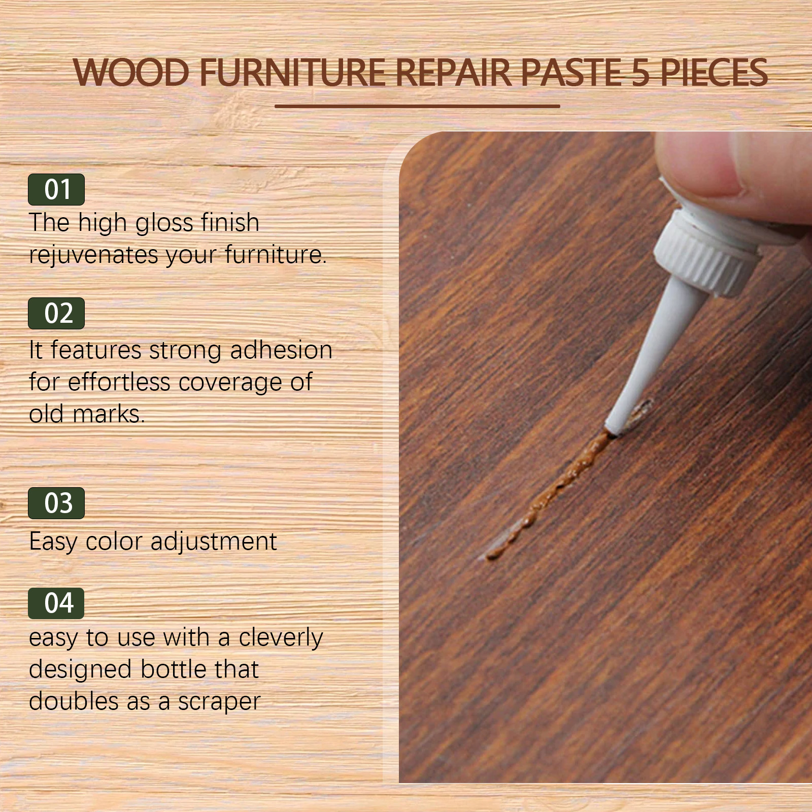 我们的木质家具修补膏含有助滑剂、快干剂。它可以,快速恢复木制品原有外观,有五种颜色可供免费调色。它的使用方法很简单:擦木制家具表面:用抹布擦木制家具表面使其无尘,挤压膏:打开喷嘴,将修复膏挤压到划痕上,抹平膏体:用产品的尾部抹平膏体,去掉多余的部分,对木家具表面进行抛光:让它静置15-60分钟,然后用砂纸对凸出的部分进行抛光。并且易于使用的设计巧妙的瓶子,兼作刮刀,它使您的木制家具起死回生。