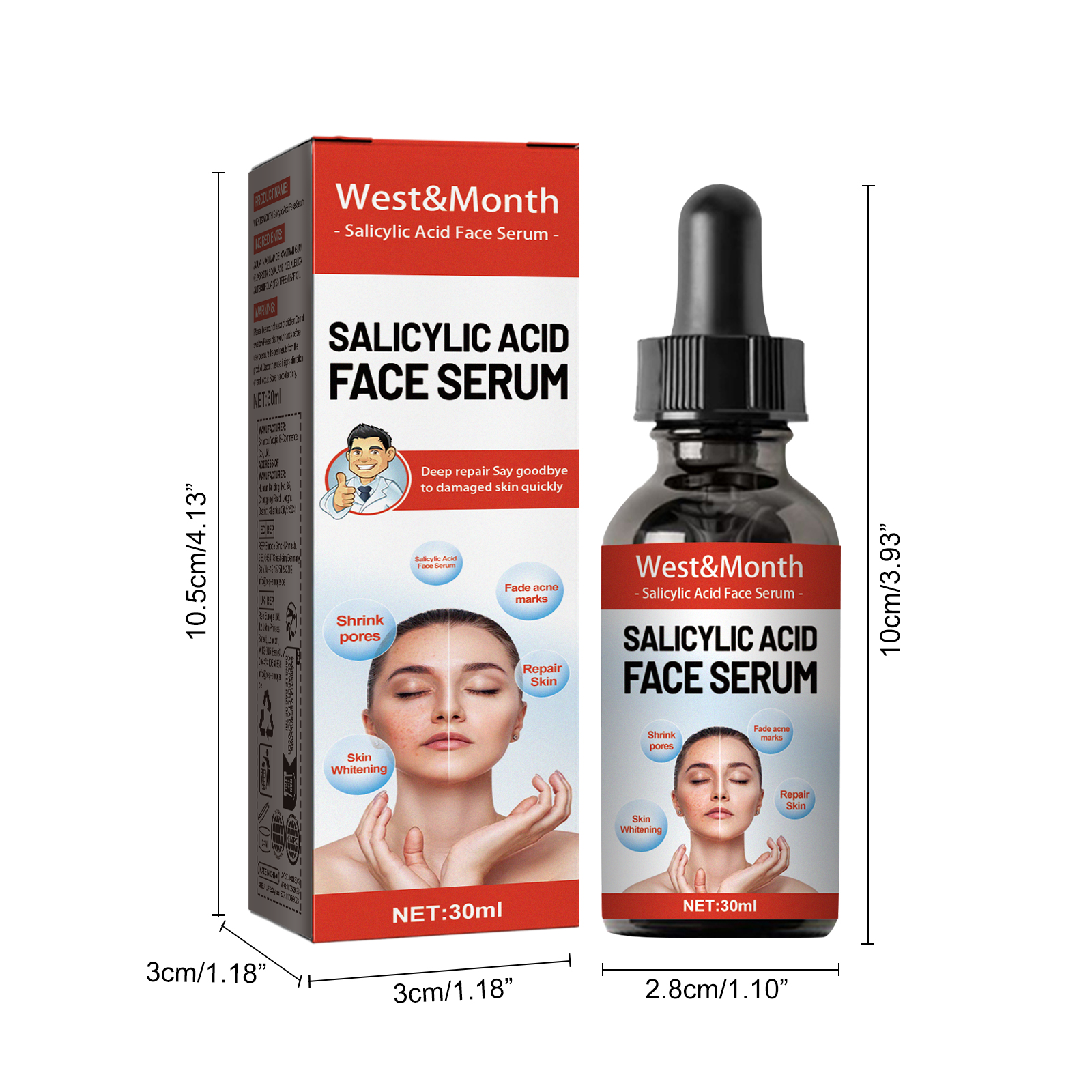 我们的水杨酸面部精华含有甘油、泛醇、PCA钠。它可以排出皮肤内多余的油脂,深入毛孔清洁疏通,清理老废角质,补充皮肤所需水分,收缩毛孔,修复肌肤。它的使用方法很简单:洁面后,擦干脸部(不要在湿润的皮肤上使用),取3-4滴薄薄涂抹一层在脸上,按摩鼻子和头部,避开眼睛周边皮肤使用,停留10分钟后用清水清洁面部,补充水分即可。修复受损肌肤,淡化面部斑点痘印,使皮肤更加白皙透亮。