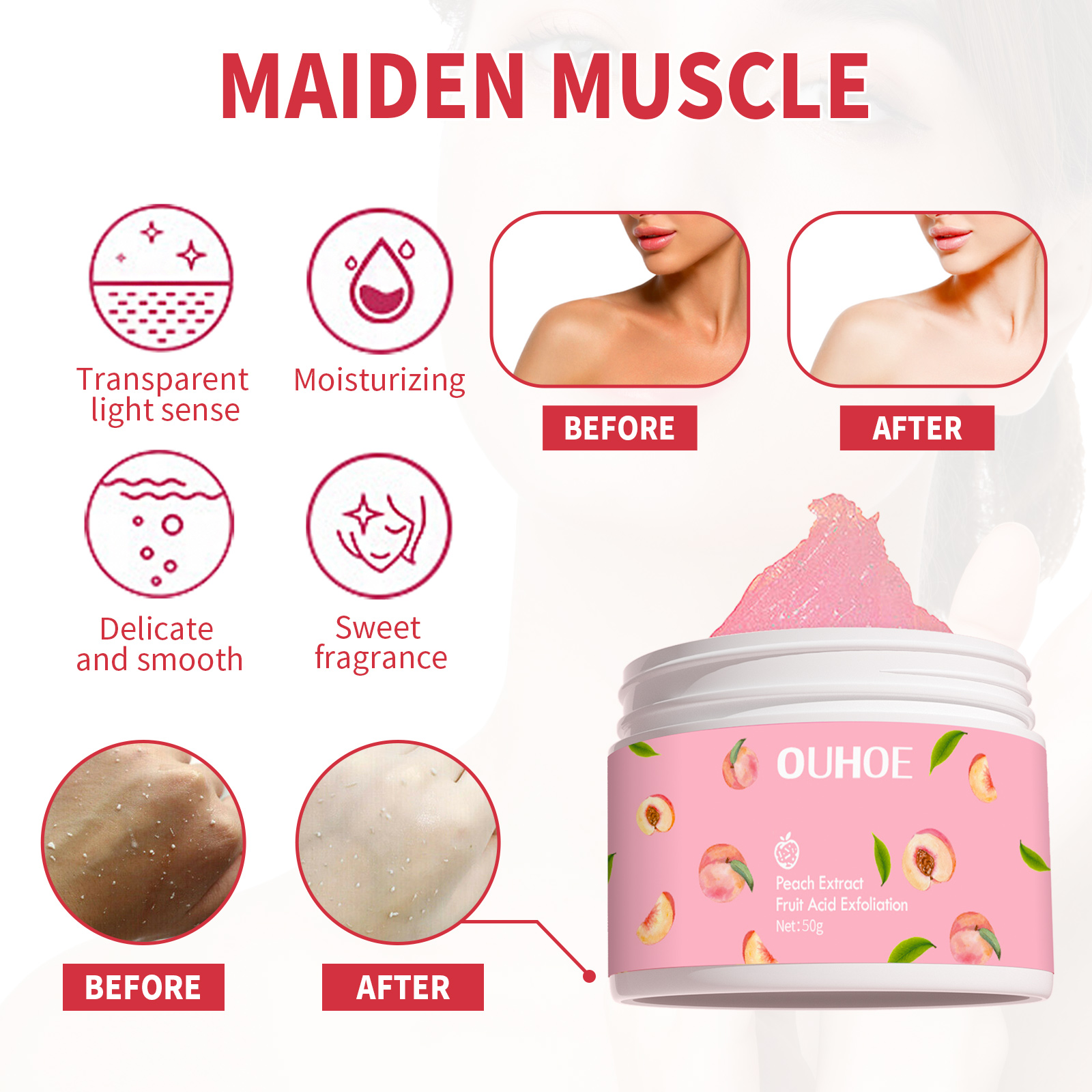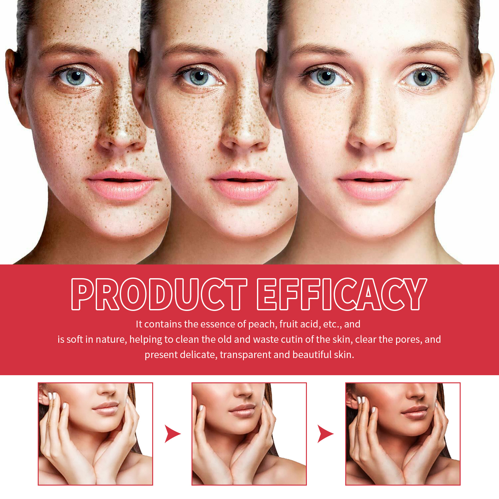 我们的亮白去角质面霜含有桃果提取物、苹果酸、人参根提取物。它可以深层软化角质,清洁。改善毛孔,令肌肤嫩滑,呈现细腻、通透、美丽的肌肤,为皮肤补充营养,深层修护补水。它的使用方法很简单:首先彻底清洁面部,拍干;在脸上涂少量面霜,集中在有黑斑或色素沉着的地方;在使用任何其他产品之前,让面霜完全被皮肤吸收。使用后有助于滋养及修复肌肤,防止色素沉着和老年斑,减少黑斑的出现,提亮肤色,令肌肤焕发光彩。